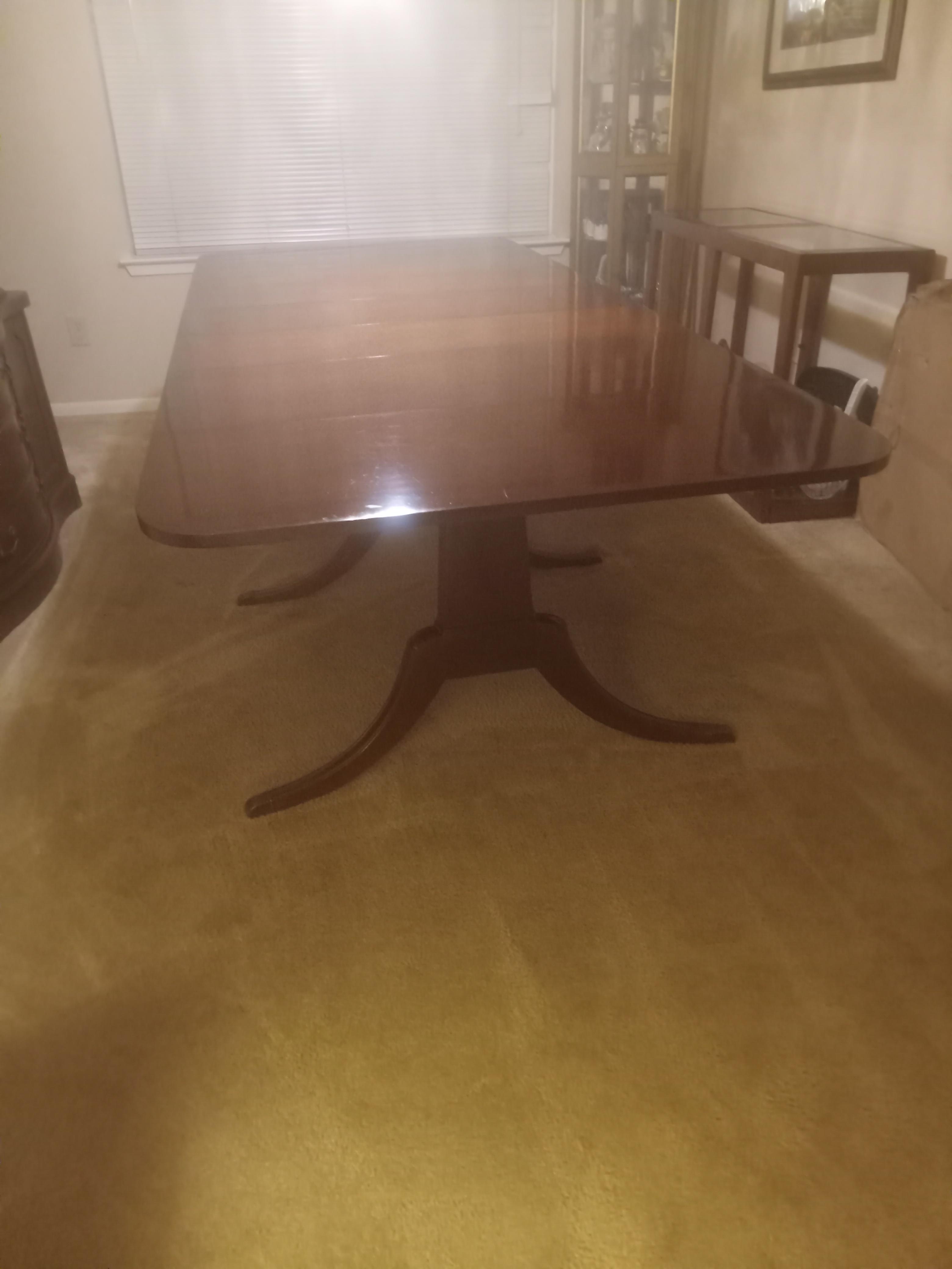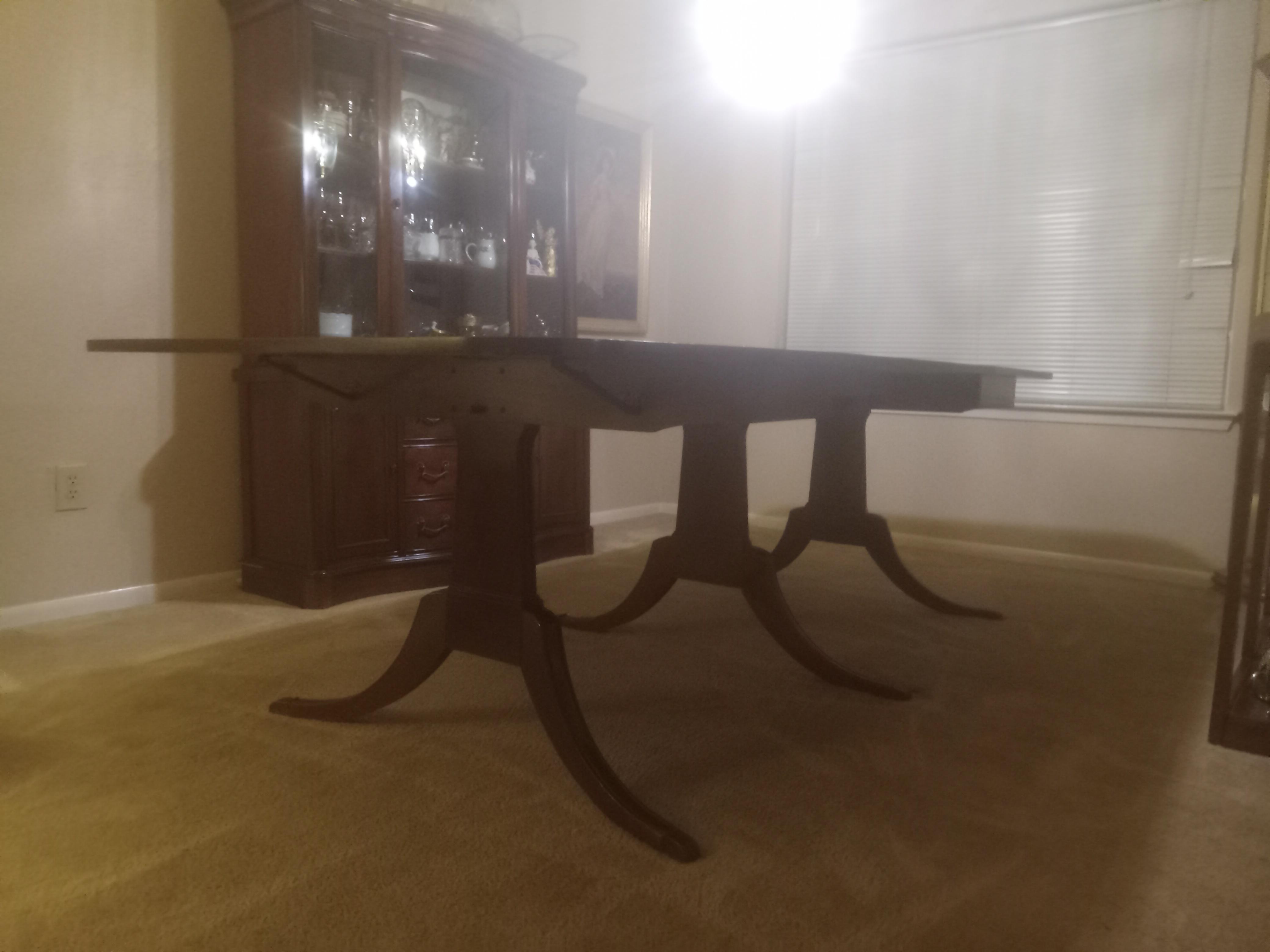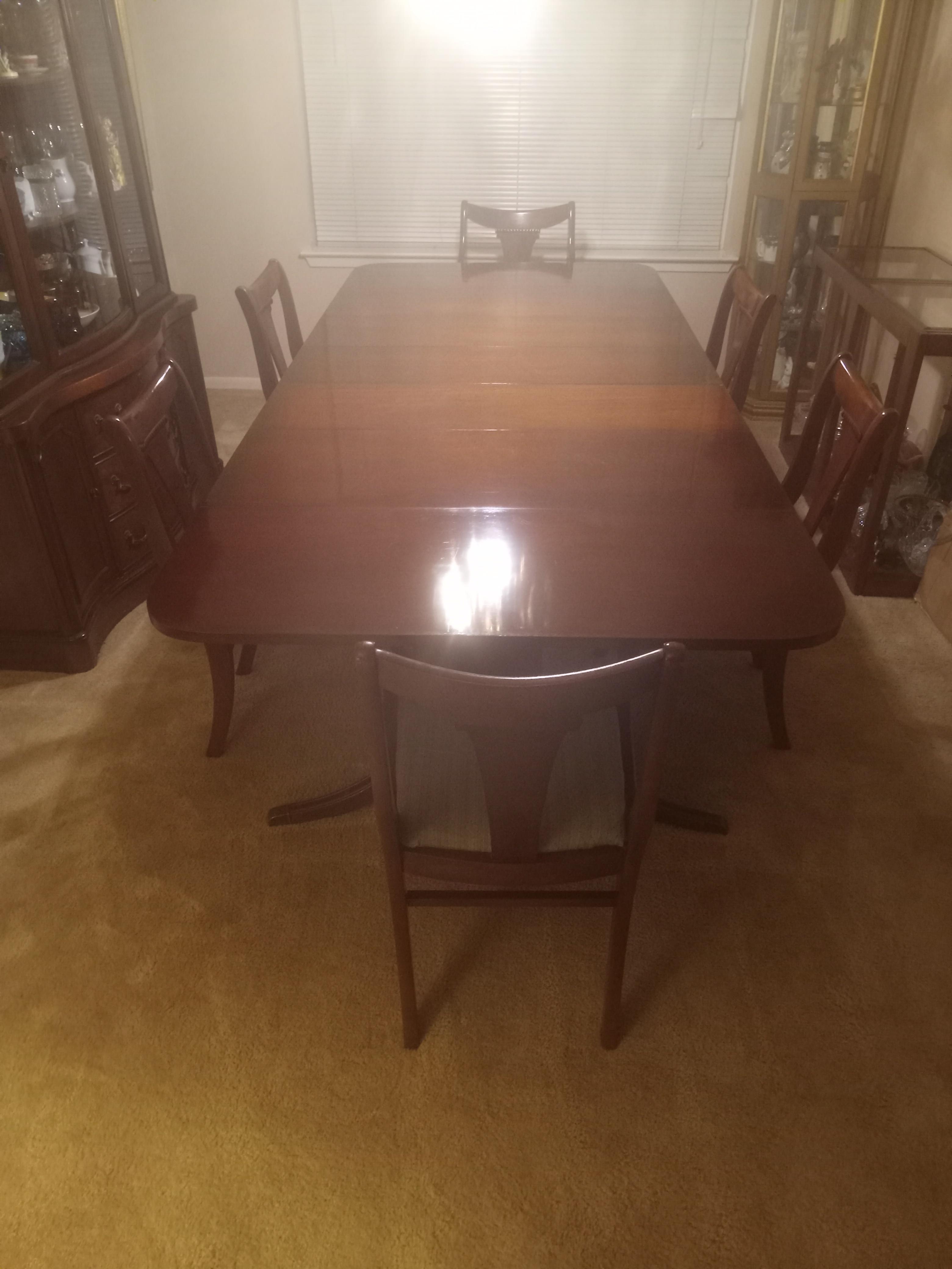 After further inspecting this, I found the makers stamp and learned it is a Drexel dining table, and 6 chairs that I inherited and would like to learn more about and find out what it's worth. The table belonged to my great grandmother so I am guessing it must be close to 100 years old! The table has 3 removable leaves and the ends also drop down. It is in excellent condition with very few scratches and also comes with the leather padded table protectors. The 6 chairs with it are in a considerably less than pristine condition compared to the table and have been recently recovered. I also have the China hutch pictured which I'm not sure are made by same company but did also Belong to my great grandmother so may possibly be a set. The chairs were originally covered in a brown and beige striped satin. Could anyone give me more info about these pieces and their value please? Thank you!