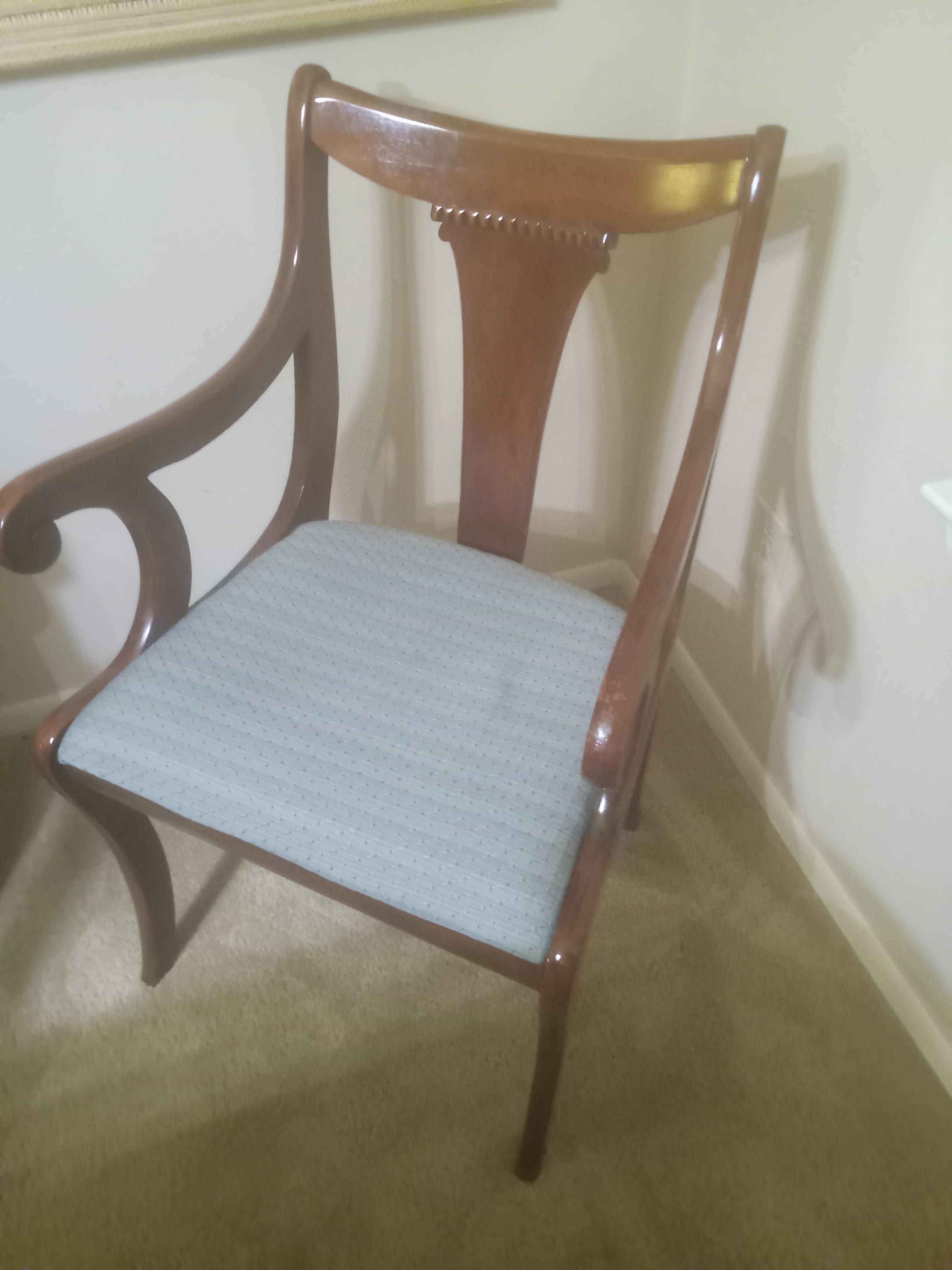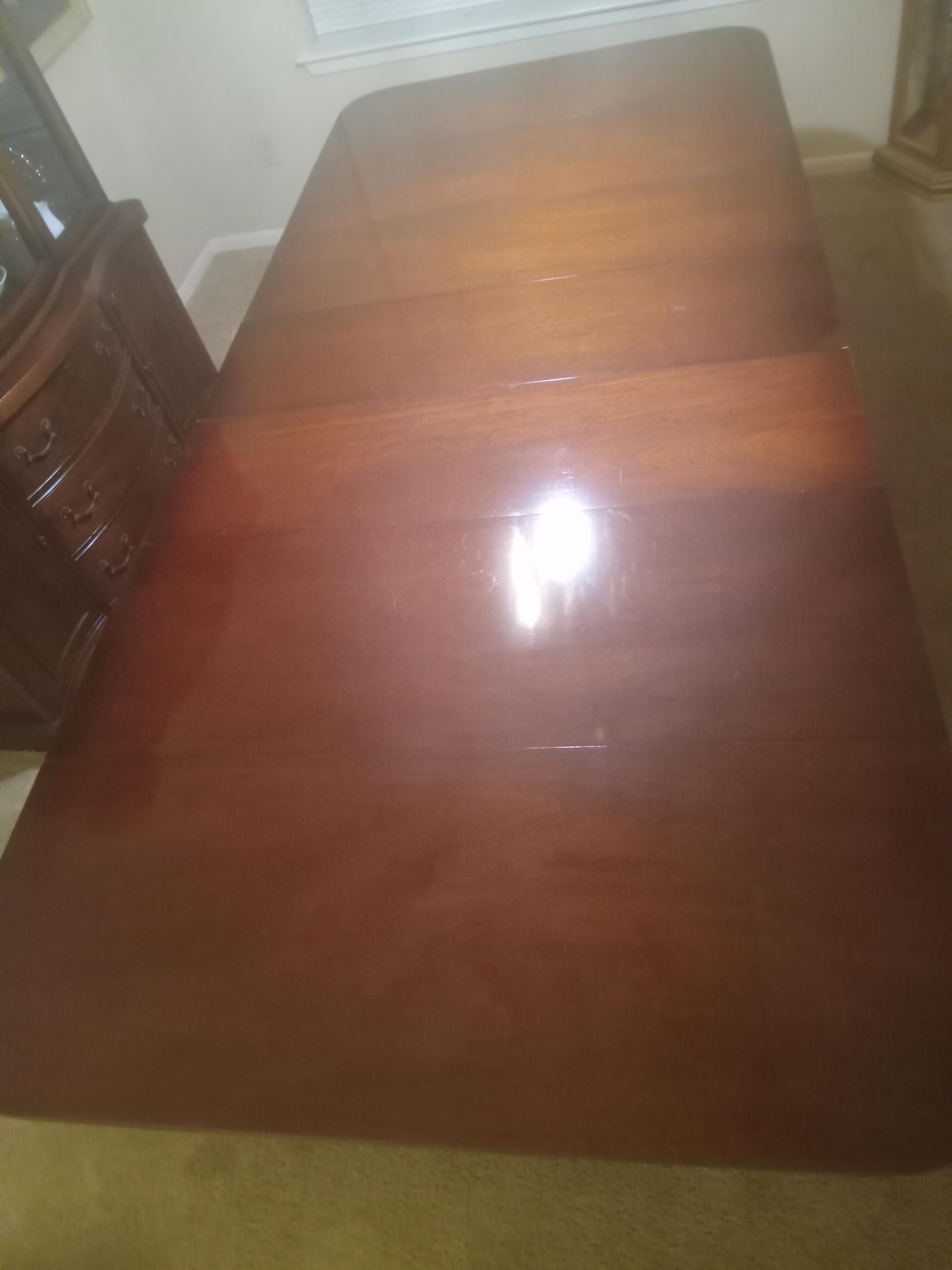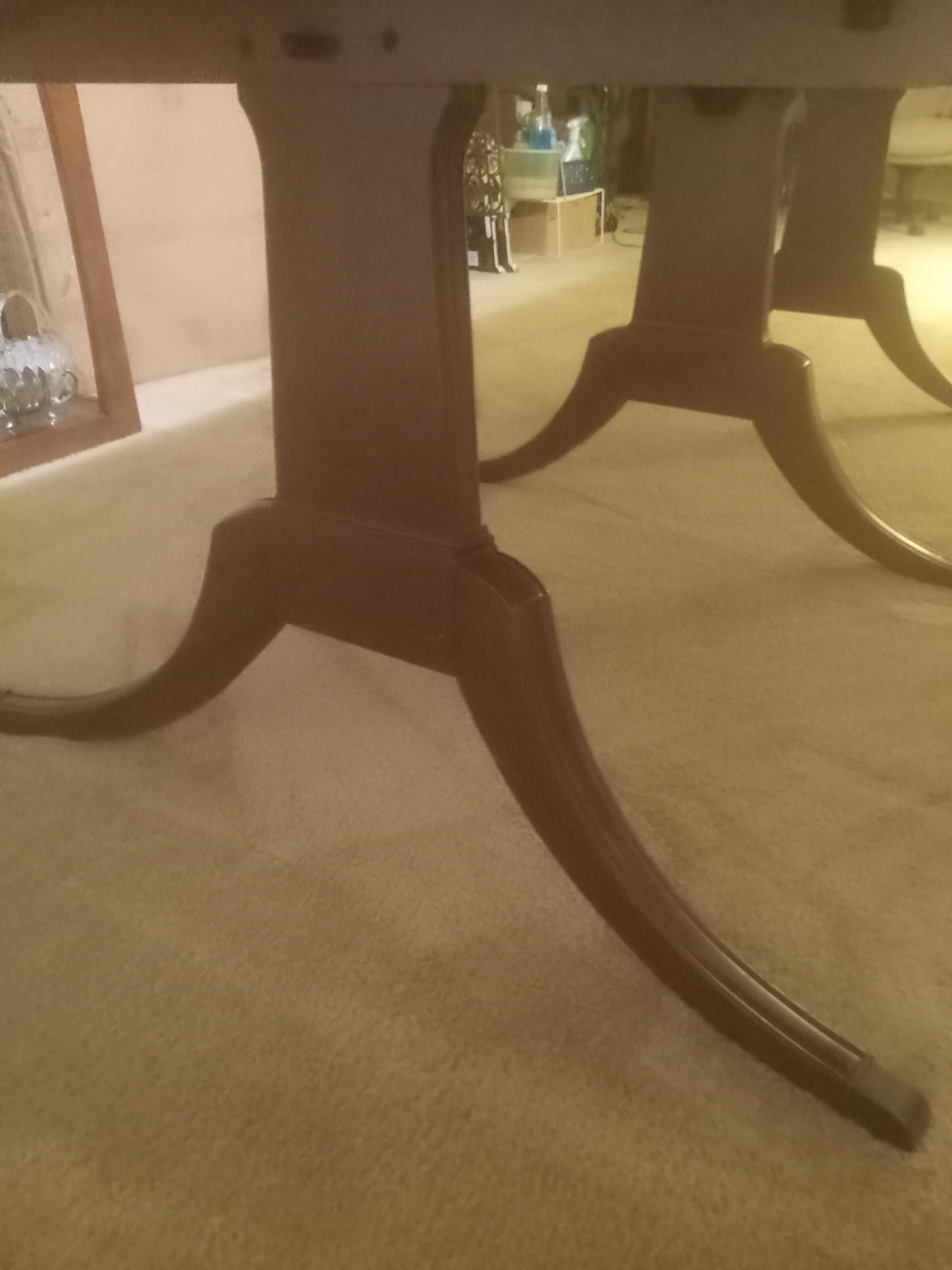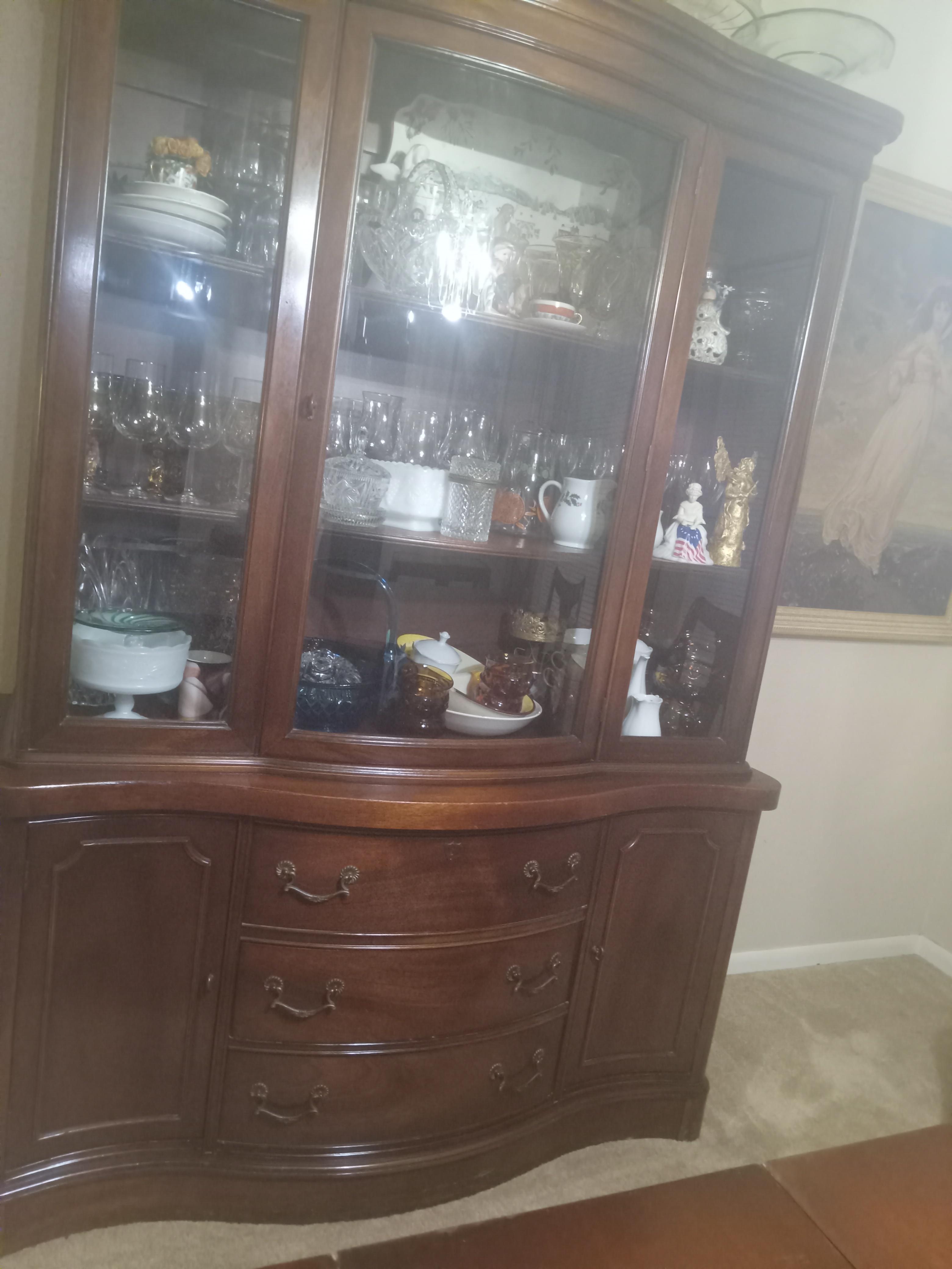 After further inspecting this, I found the makers stamp and learned it is a Drexel dining table, and 6 chairs that I inherited and would like to learn more about and find out what it's worth. The table belonged to my great grandmother so I am guessing it must be close to 100 years old! The table has 3 removable leaves and the ends also drop down. It is in excellent condition with very few scratches and also comes with the leather padded table protectors. The 6 chairs with it are in a considerably less than pristine condition compared to the table and have been recently recovered. I also have the China hutch pictured which I'm not sure are made by same company but did also Belong to my great grandmother so may possibly be a set. The chairs were originally covered in a brown and beige striped satin. Could anyone give me more info about these pieces and their value please? Thank you!