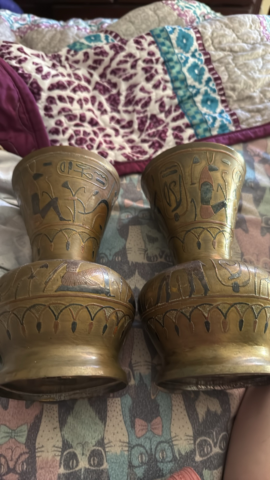 I believe this may be an antique/vintage set of Egyptian Brass Vases with a matching Decorative Plate. My grandmother may have brought these over from England. The plate is not pictured, but I do have it, and it is in a similar condition. I am curious about the estimated value.