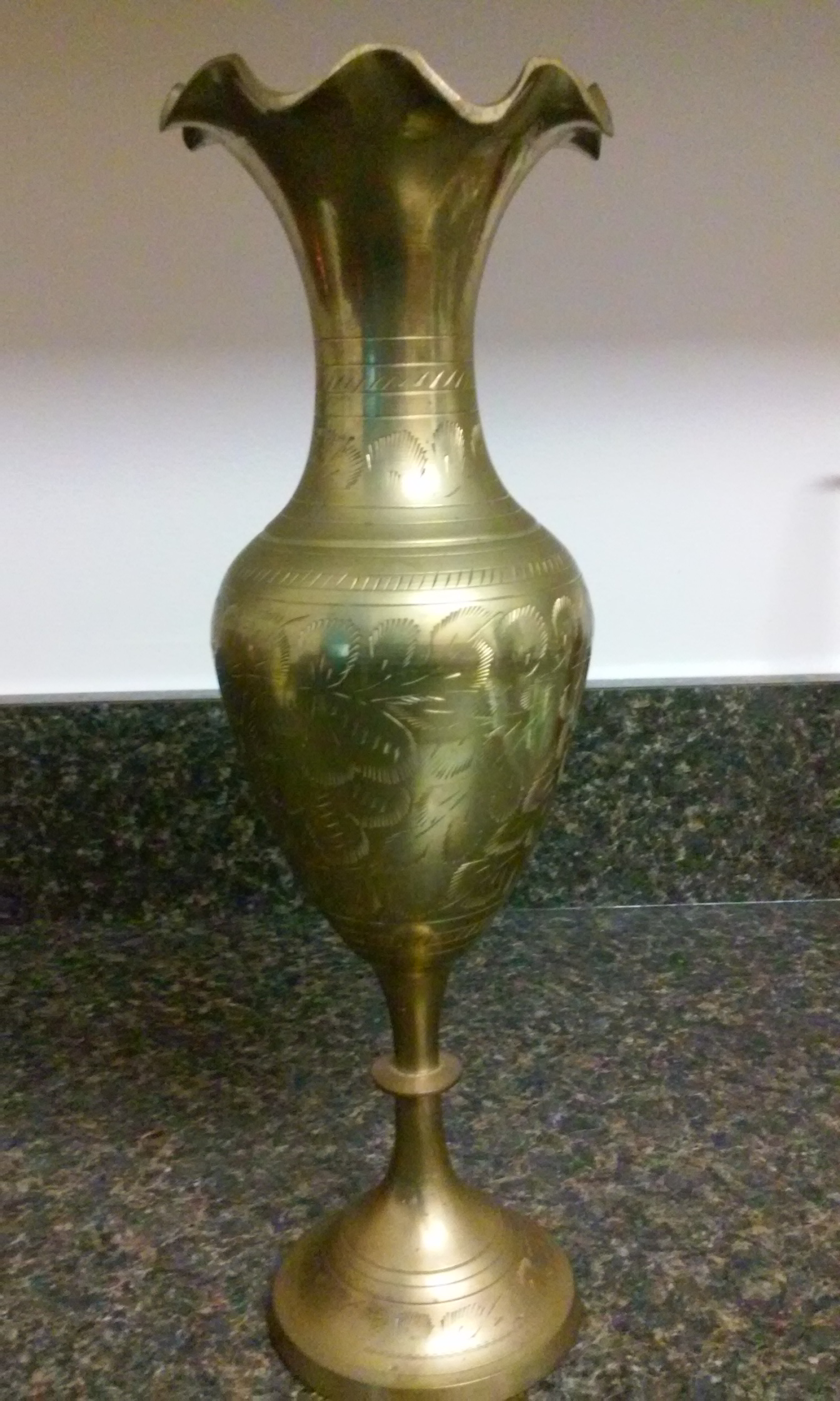This vase is 2 ft tall with a floral molded top and floral etching throughout. Mark at the bottom says India. I need to know what it is worth. I appreciated it. Thank you