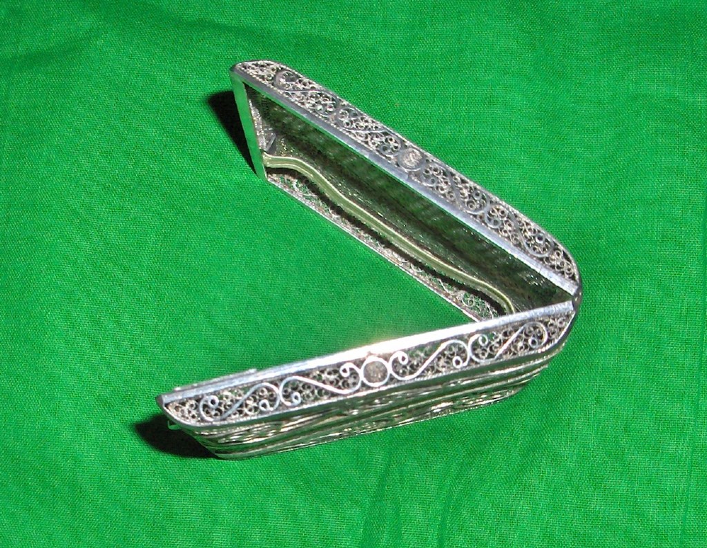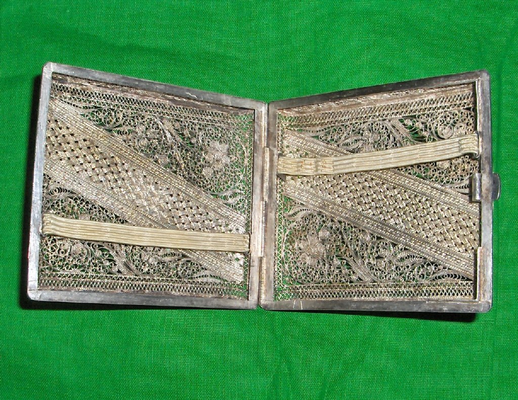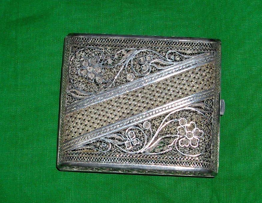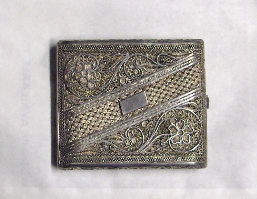 Picked up a filigree cigarette case at an estate sale. I think the frame is some sort of silver because it's a bit tarnished. The rest of the fine mesh design work seems to look almost a brassy gold color. I suspect it is also silver but just tarnished much more that the frame. It is very ornate. I would like to know the time period, origin, the materials used, and value. Also, should I try cleaning it or keep it as is