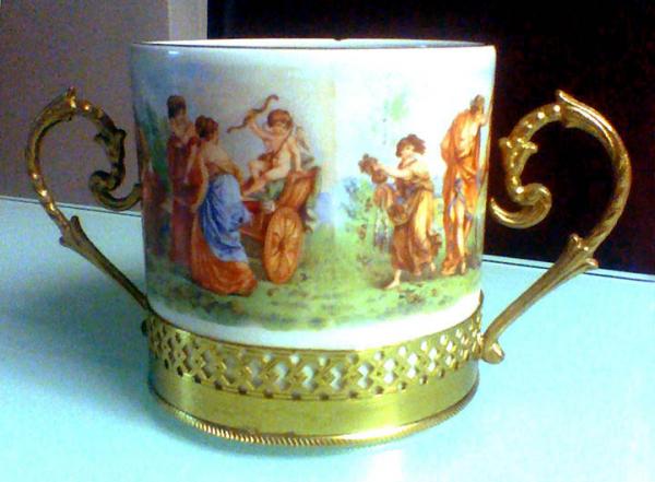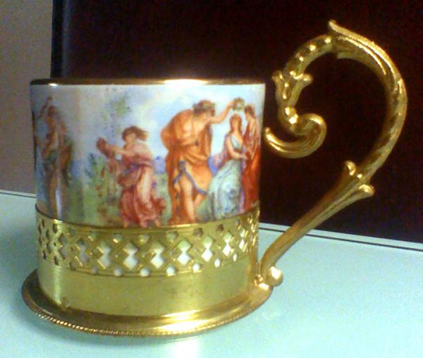 This is some type of serving set (tea?) handmade in Italy with this stamp - First Line: "C" Second Line: "HAND" Third Line: "MADE" Fourth Line: IN ITALY" Fifth: "FIORENTINE" This stamp is on the bottom of the large center chalice. There are five other chalices on the bottom level, with all but the center one having a gold metal bottom and handle. The center one has no bottom gold trim, but sits in the center golden metal holder. The bottom tray is made of some type of wood and is lined with an edge of gold colored metal. Unfortunately, the handle that would act as the "carrier" of this piece just broke off. You can see how it is being held in place in the photos. We know this has a long history in our family, however, we do not have any idea what it is, when it is from, where it is from, or what it is worth. We would GREATLY appreciate ANY information or feedback that anyone can give us.