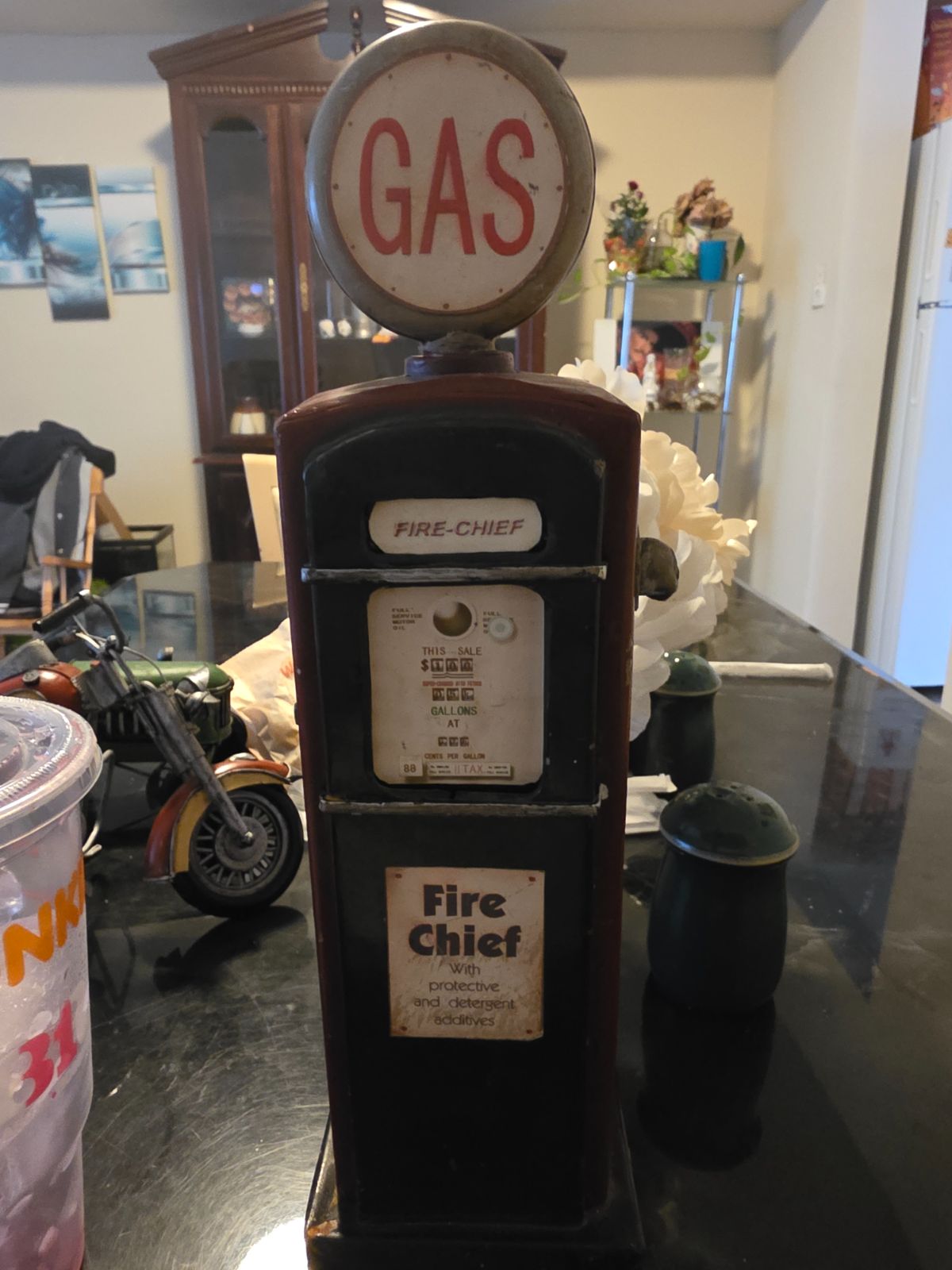Physical Description: This vintage toy gas pump, styled as a Fire Chief model, stands approximately 12 inches tall and is made of painted metal. The pump features a round top with the word "GAS" prominently displayed in red lettering. The front showcases the name "FIRE-CHIEF" and includes a faux meter with dials indicating gallons and price per gallon. The overall color scheme is a combination of red and black, with some areas showing wear and fading.