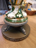 Vintage style lamp , exact year is not known. Shade is very large and maroon in color possibly silk ? Brass pole center of black wood that comes to a point on one side. Not in great shape but for as old as it is .....very decent ! I cannot find any info online about this lamp so I would appreciate any feeback or history on this piece . Thank you !