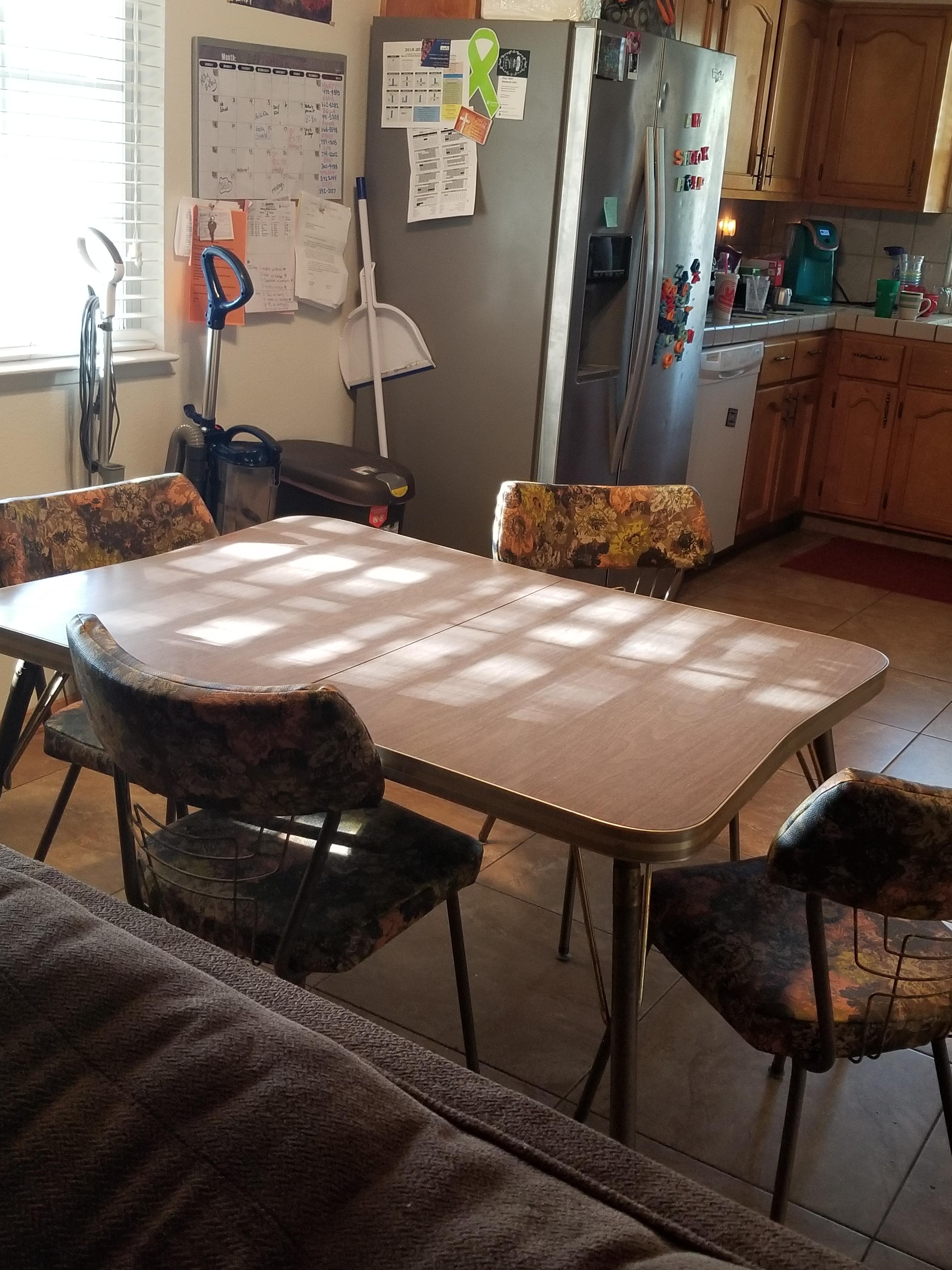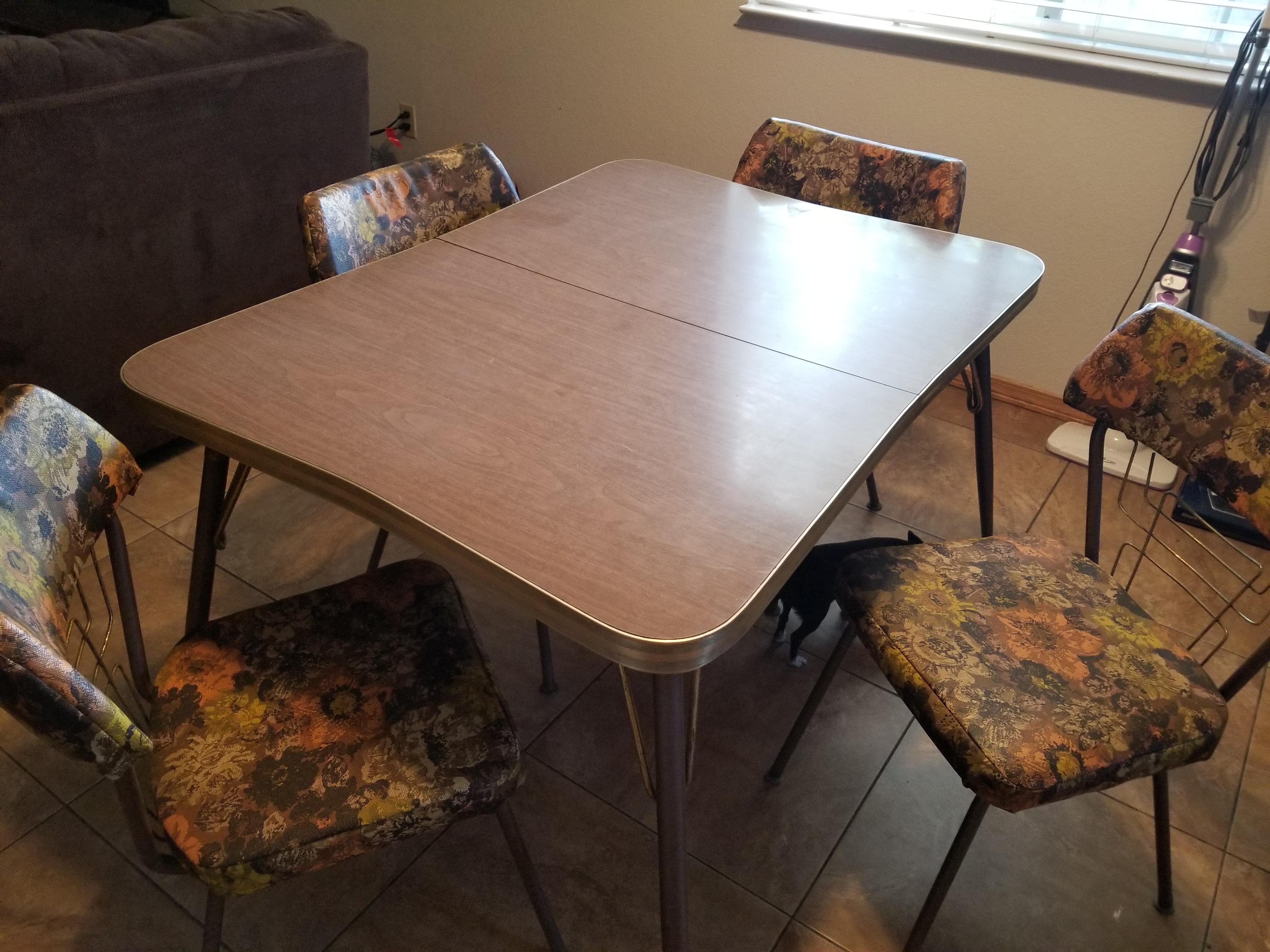 I purchased this gorgeous table at a yard sale. The seller said it is from the 1960's. 6 chairs that are made of Vinyl (?) And brass. No tears in the vinyl. The table is made of formica and the metal is maybe steel.. I'm not sure. I would love some feedback on this table!