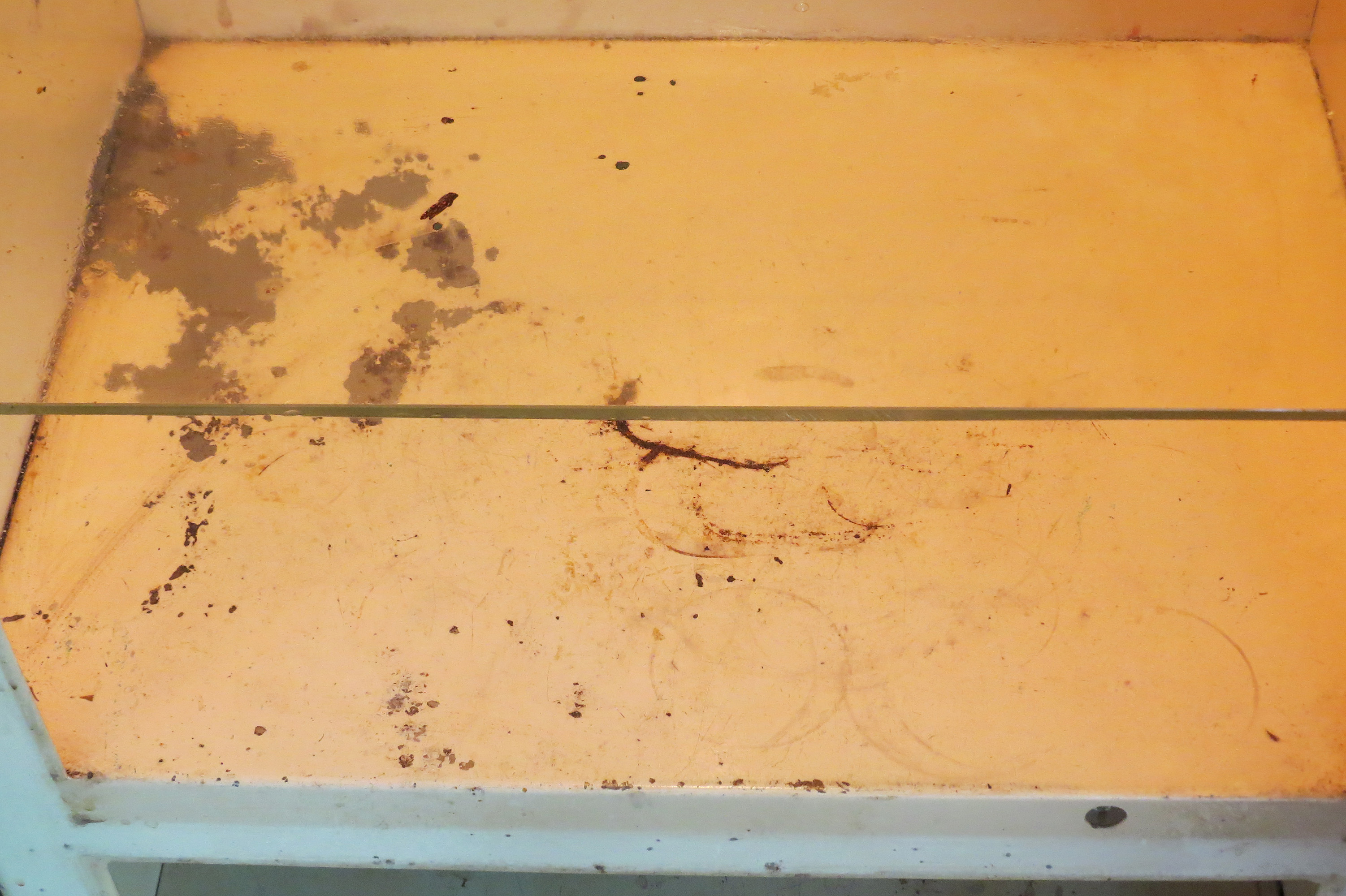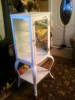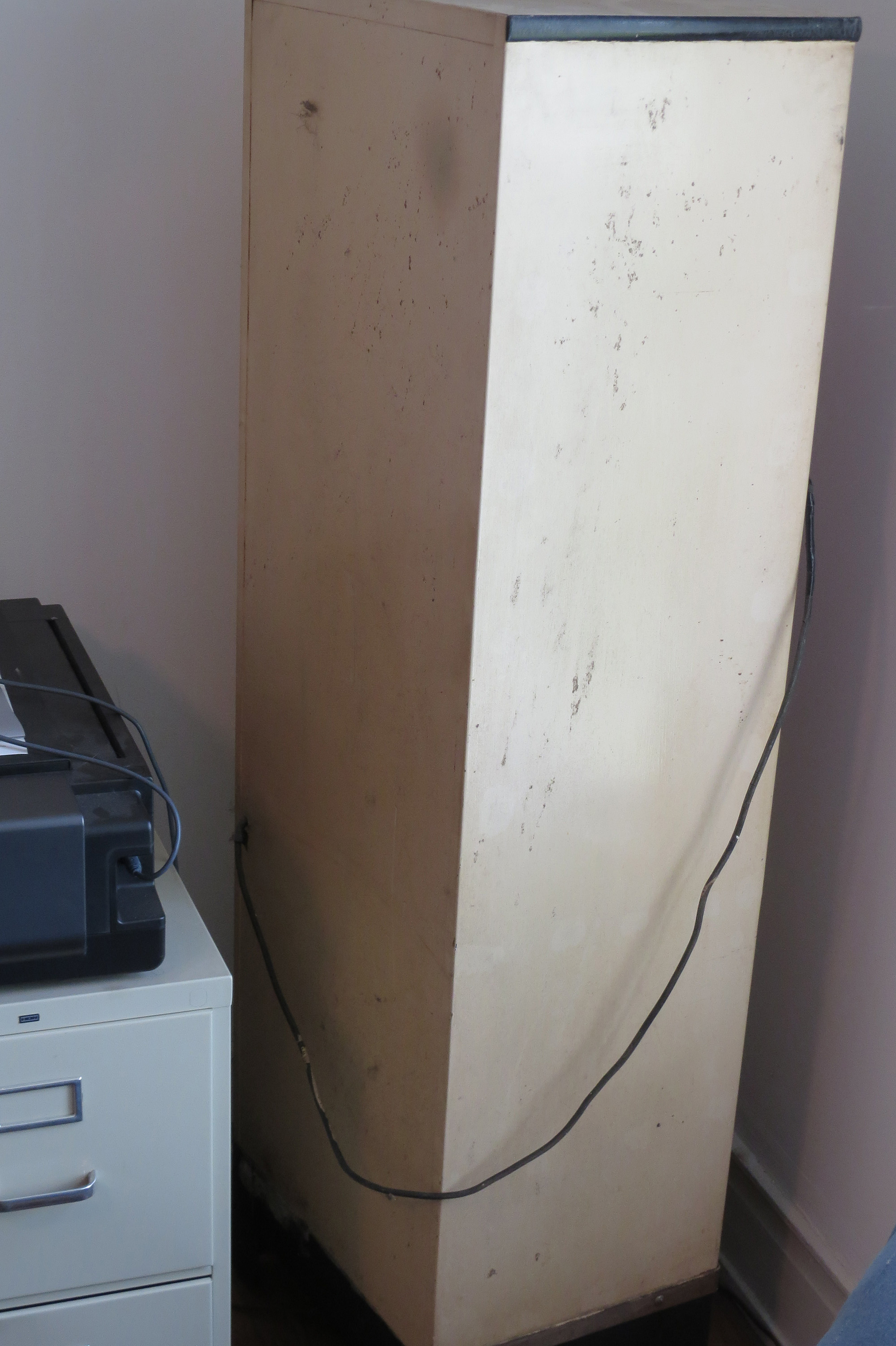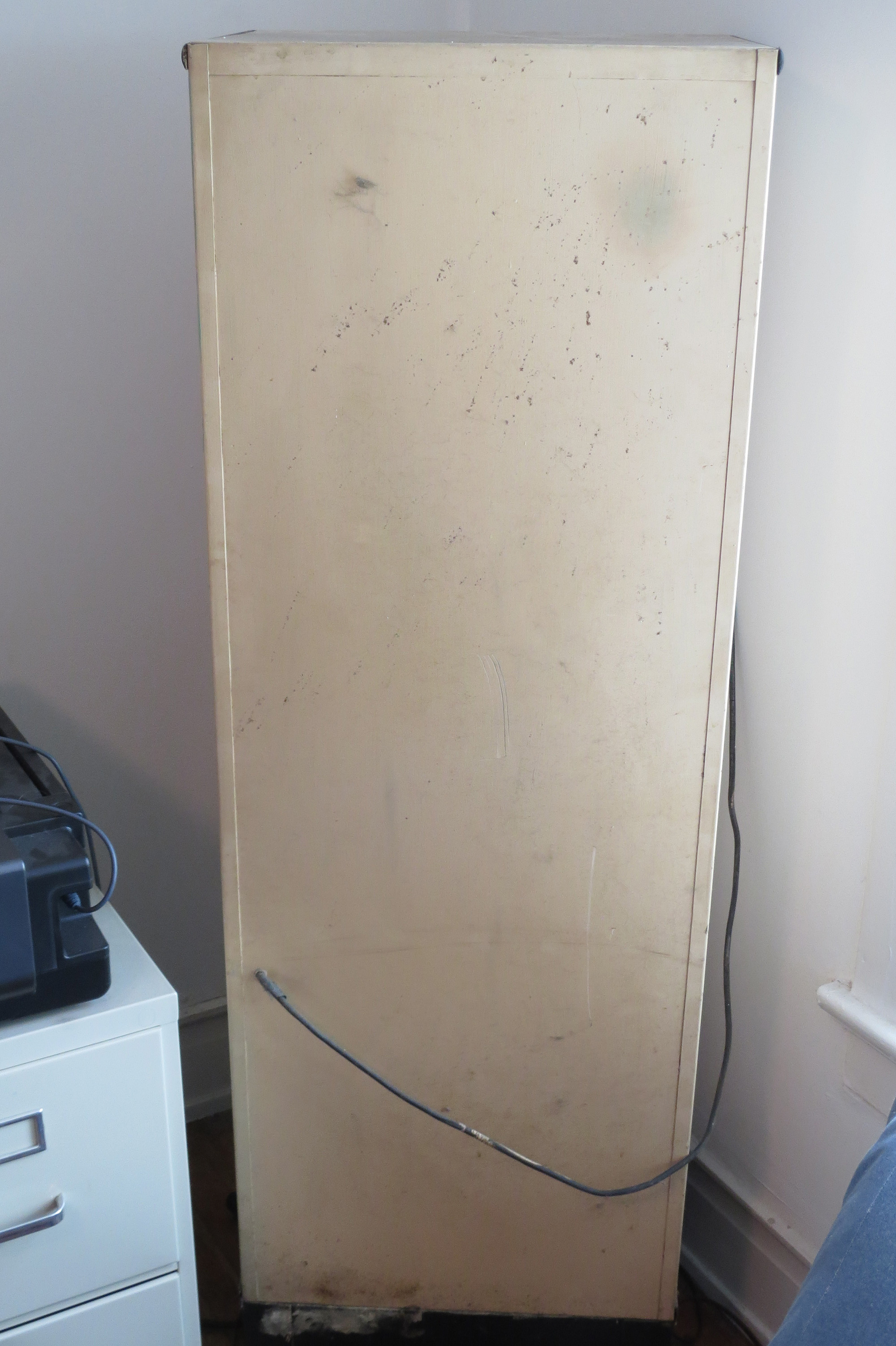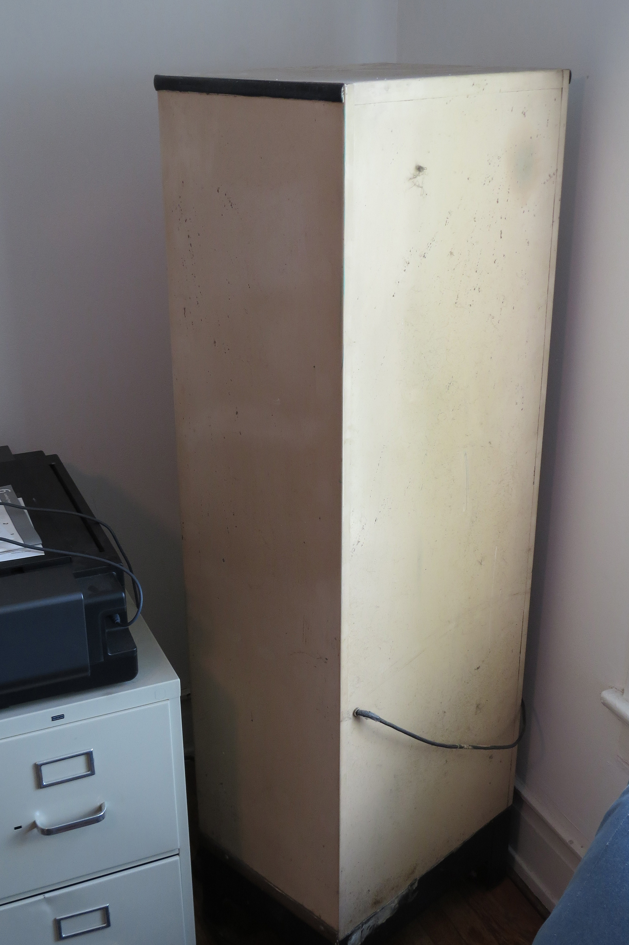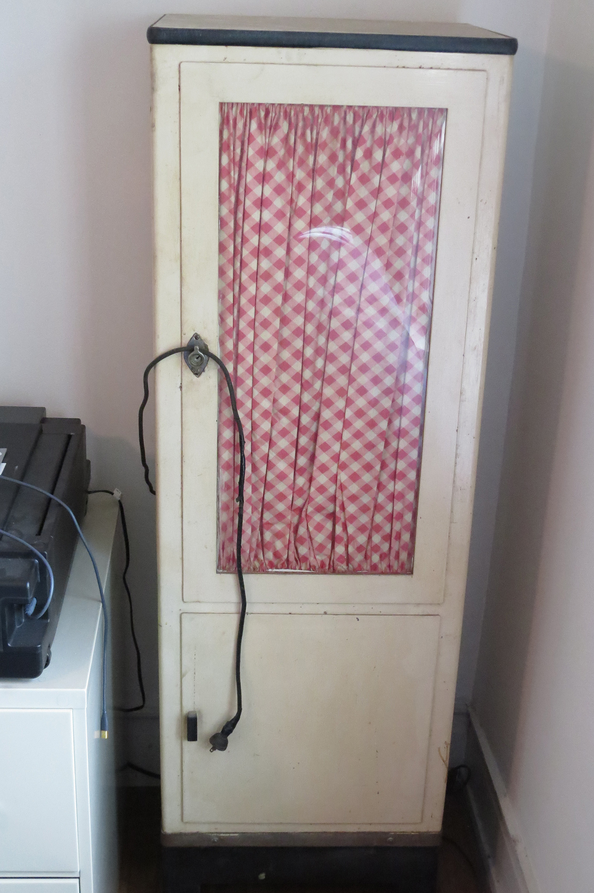 All original, rolled steel, free standing exam room/medical supply cabinet. Upper compartment locks, has a light which activates when the door is opened, has a glass paned door, three glass shelves, and interior privacy curtain. Lower compartment has one shelf. Overall, condition is very good. Small areas of paint are missing inside and out and the power cord needs replacing. Glass shelves need a bit of cleaning. 63" high; 20" wide; 15 inches deep.