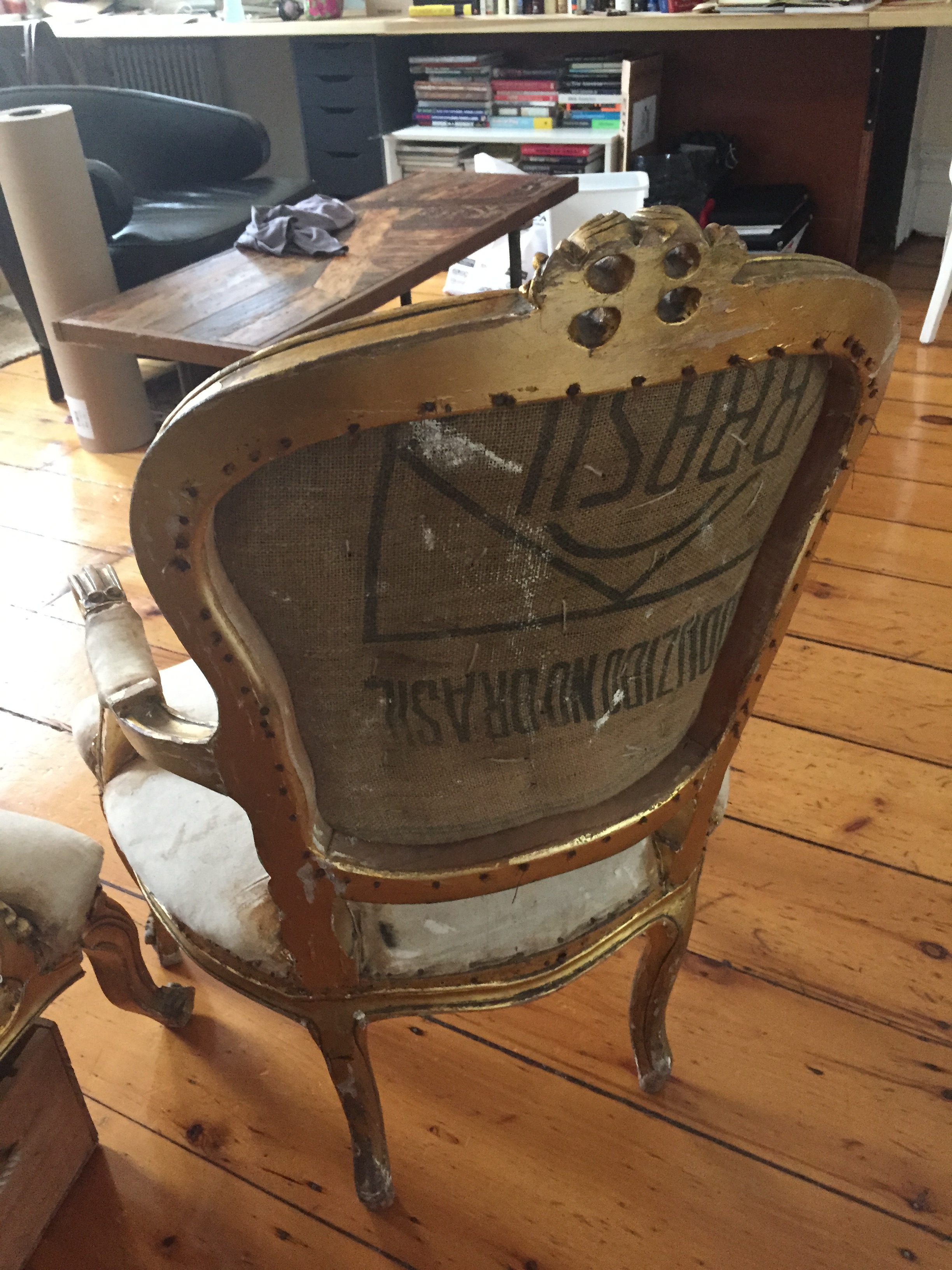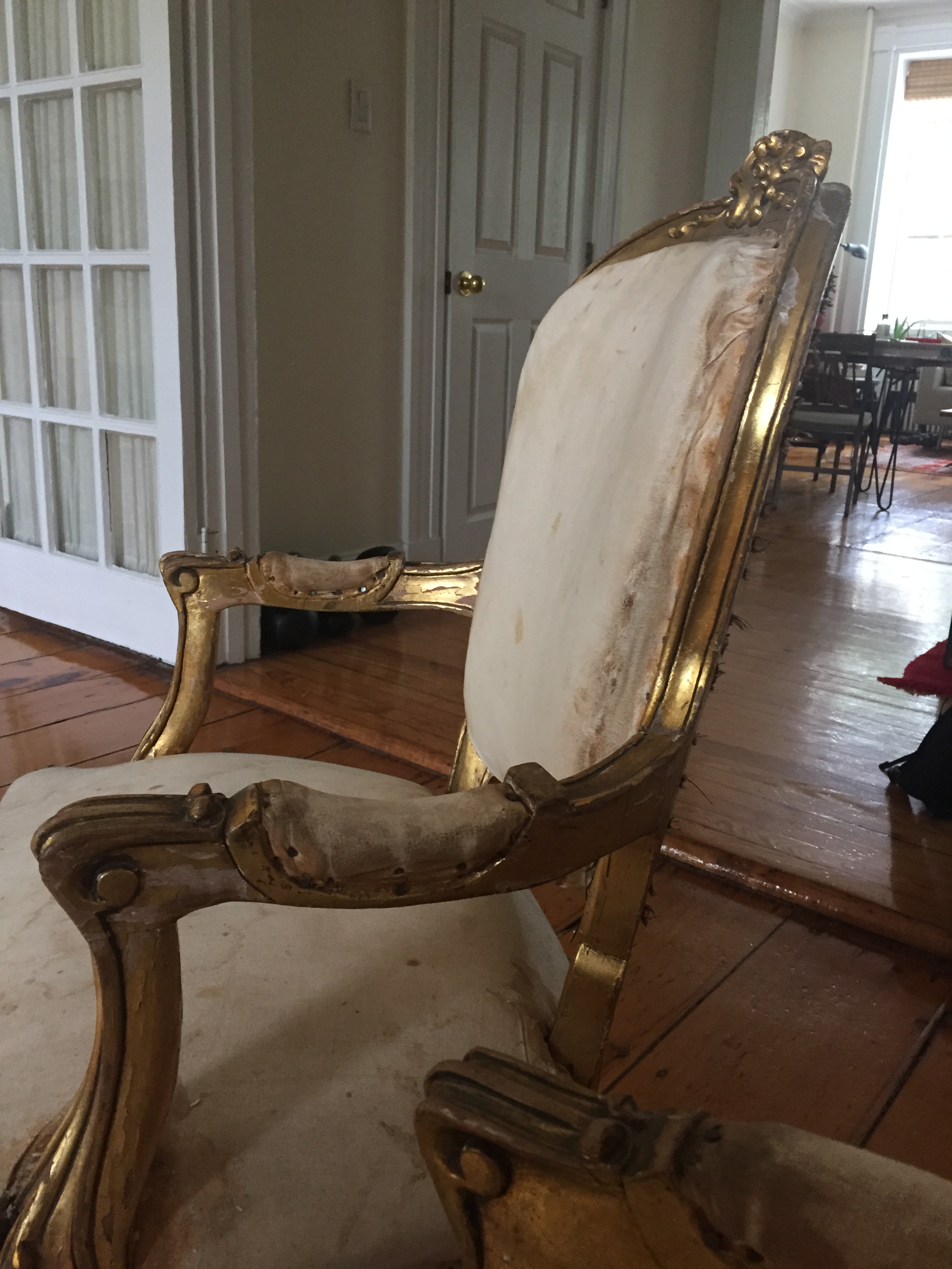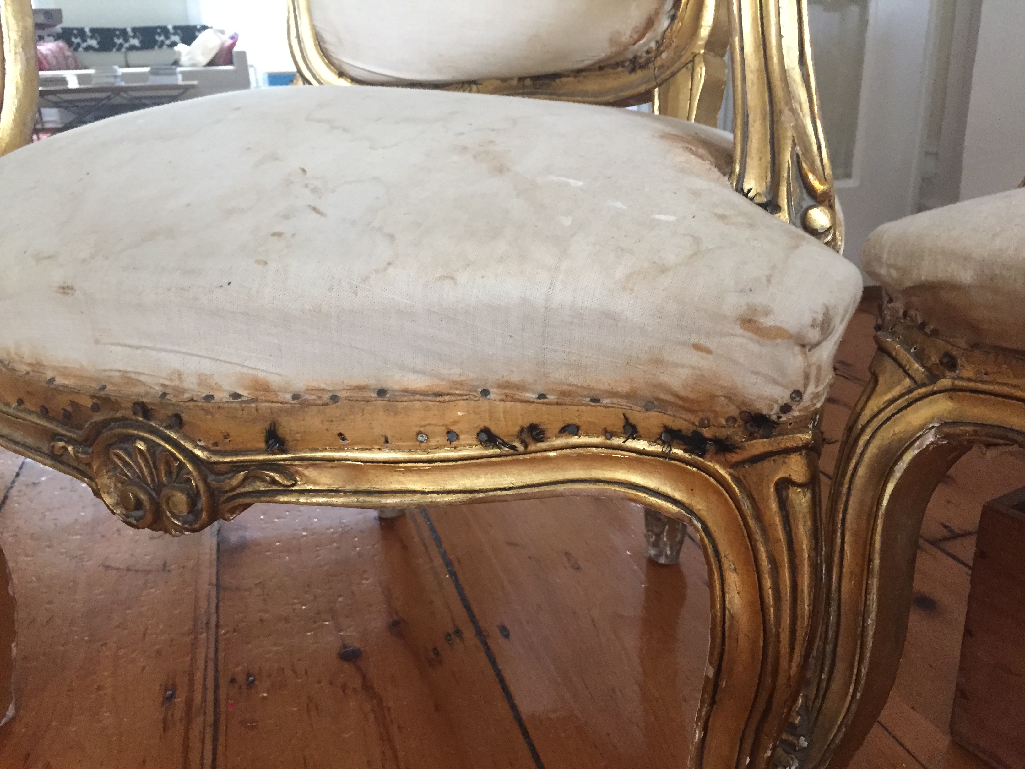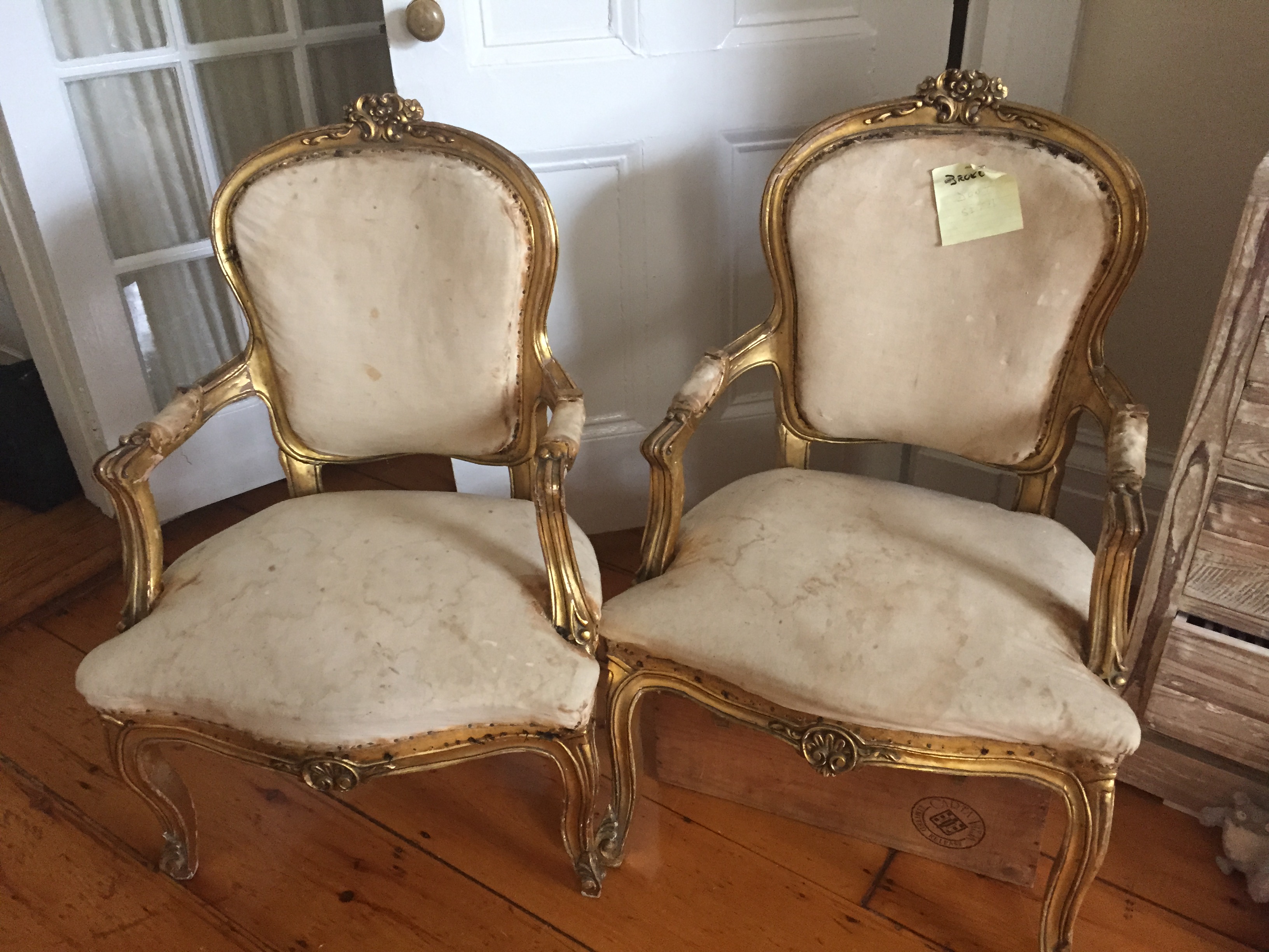 A pair of lovely french vintage arm chairs made of solid wood. we think they are from the 1920's. they are well crafted and have a wonderfully elegant appearance. please note the elaborate curves and carvings and golden finish.