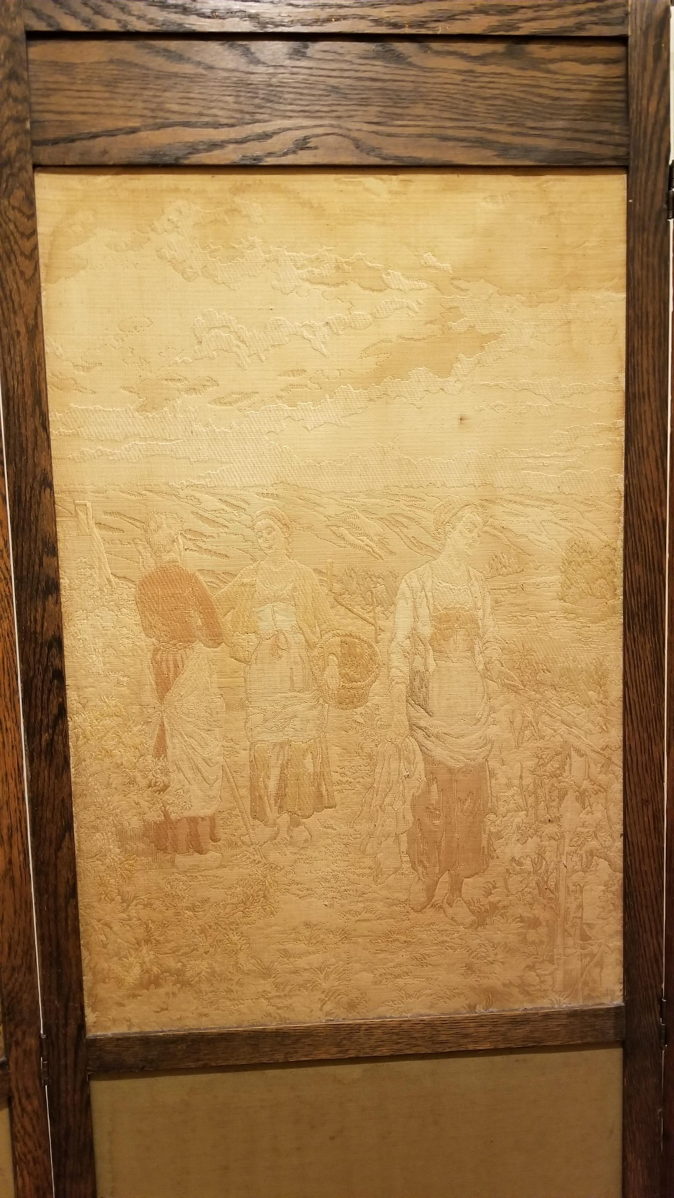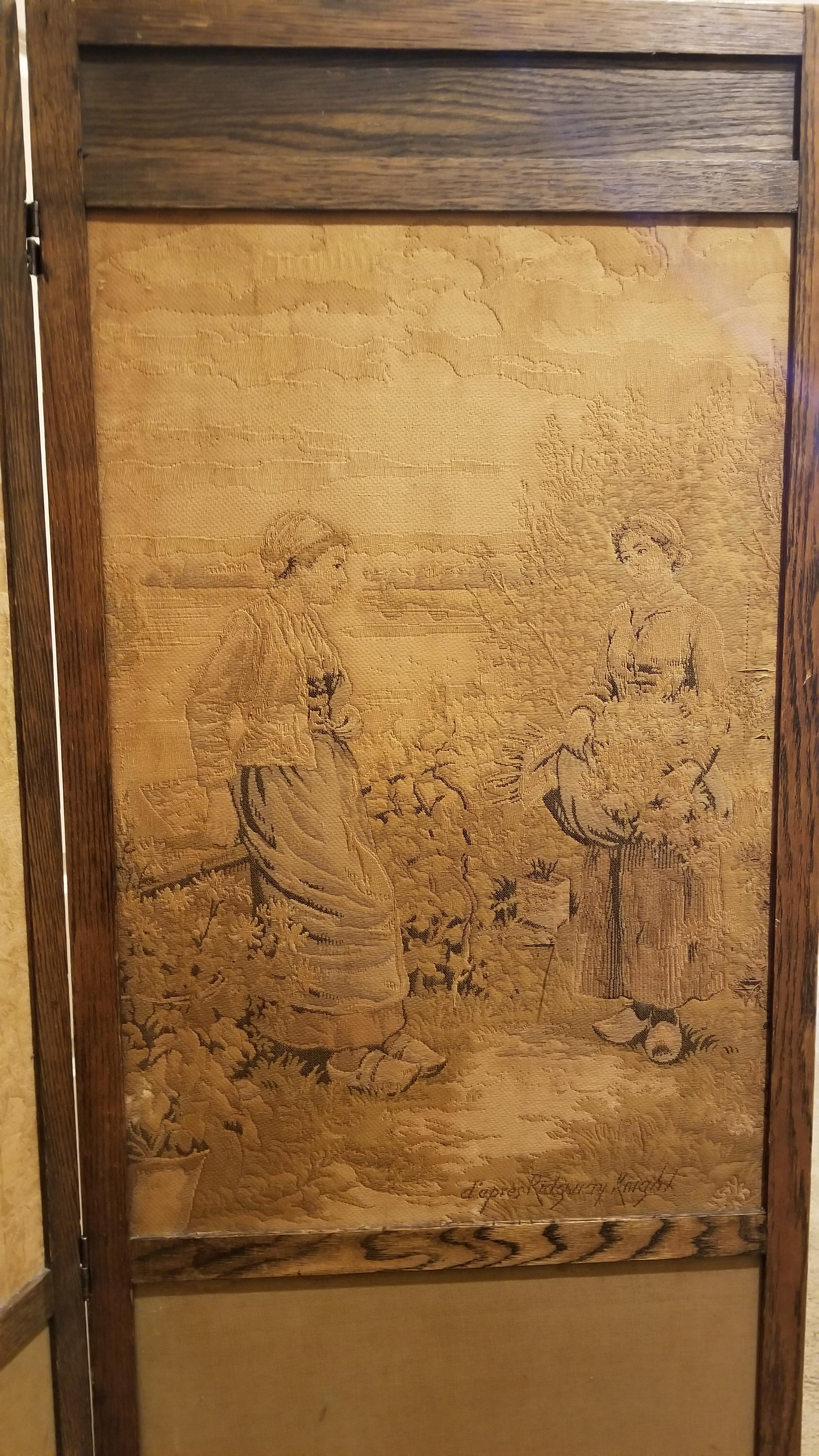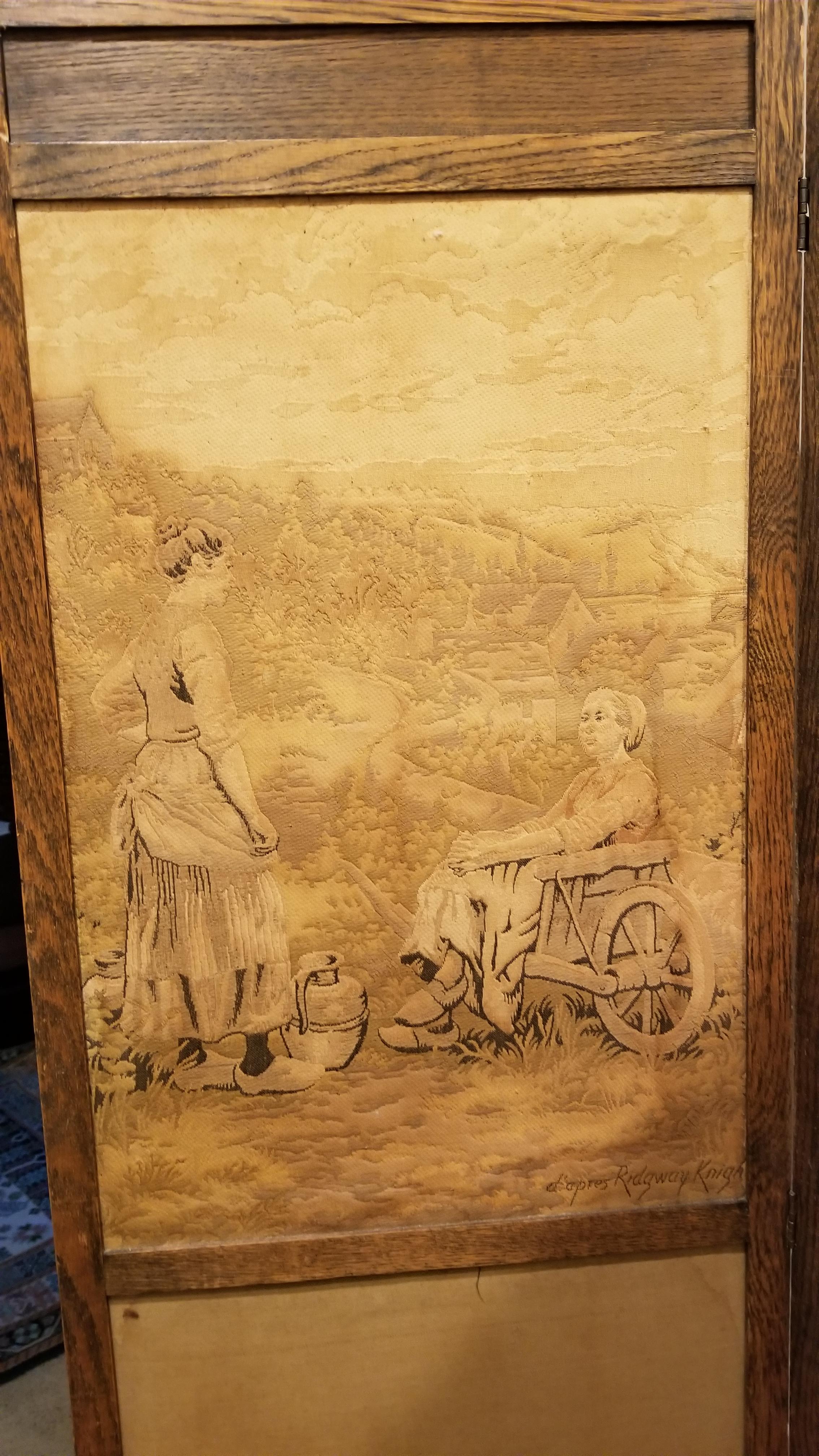 Vintage french tapestry folding room divider, with 3 panels. Each panel is 22 niches by 68 inches. Signed "d'après Ridgway Knight".