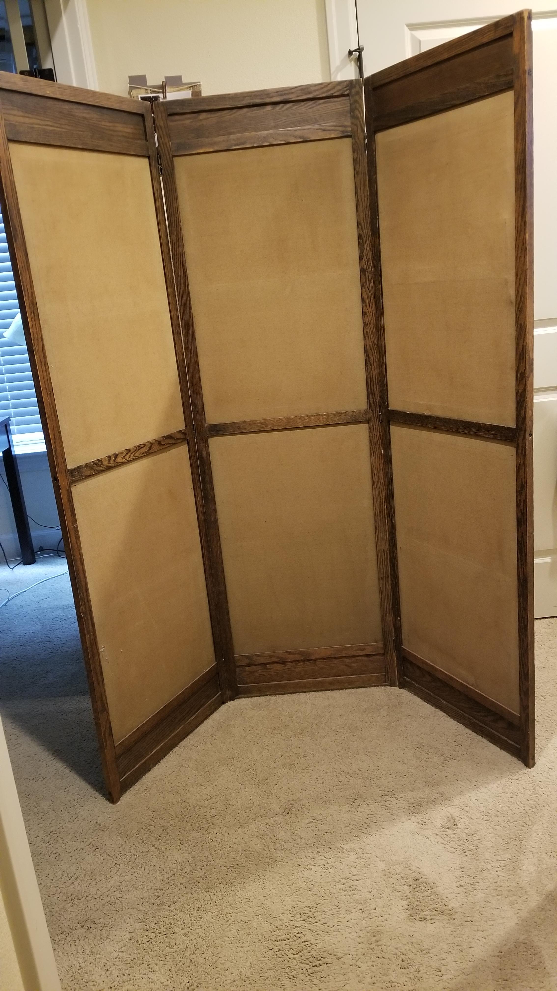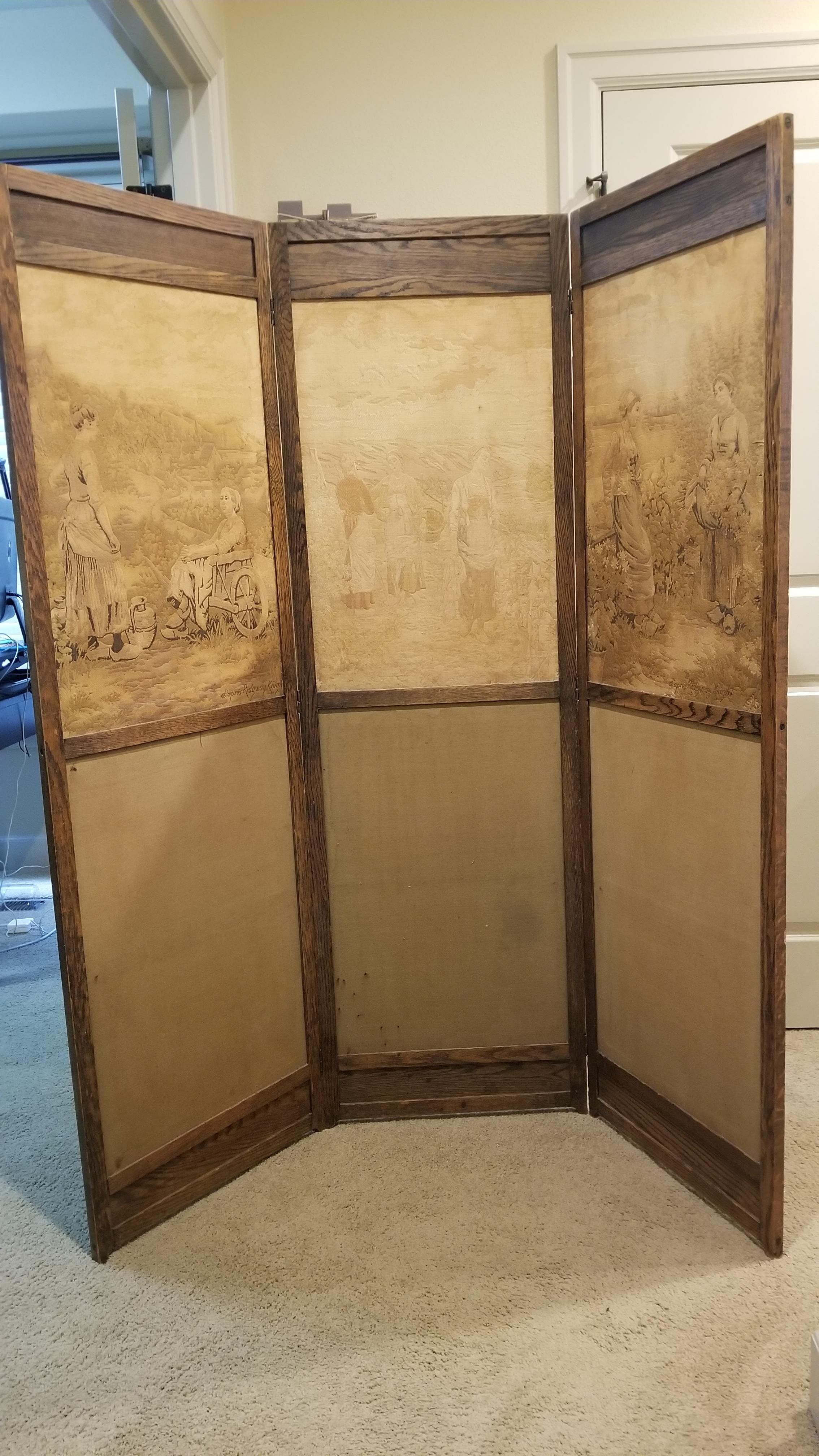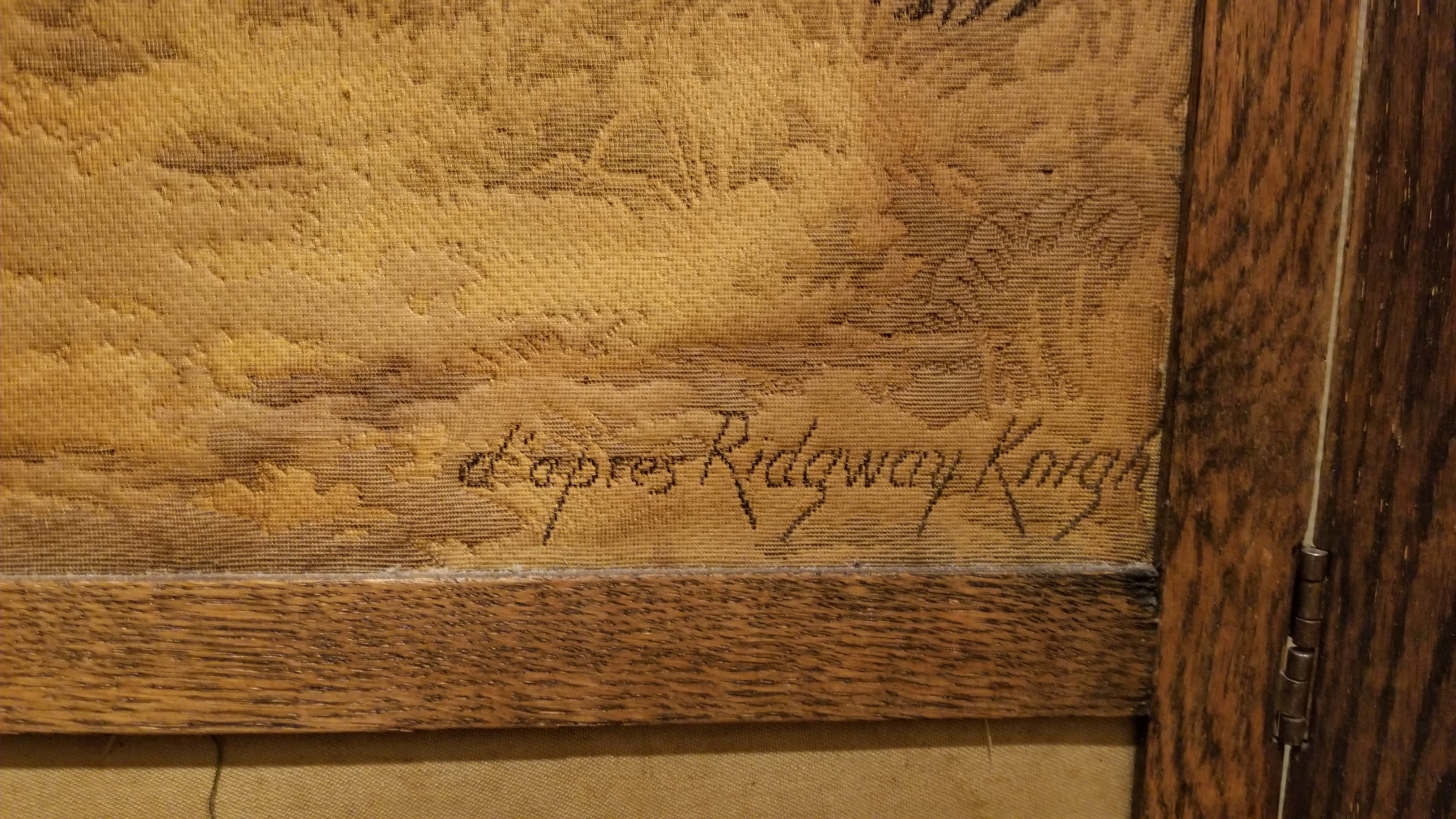 Vintage french tapestry folding room divider, with 3 panels. Each panel is 22 niches by 68 inches. Signed "d'après Ridgway Knight".