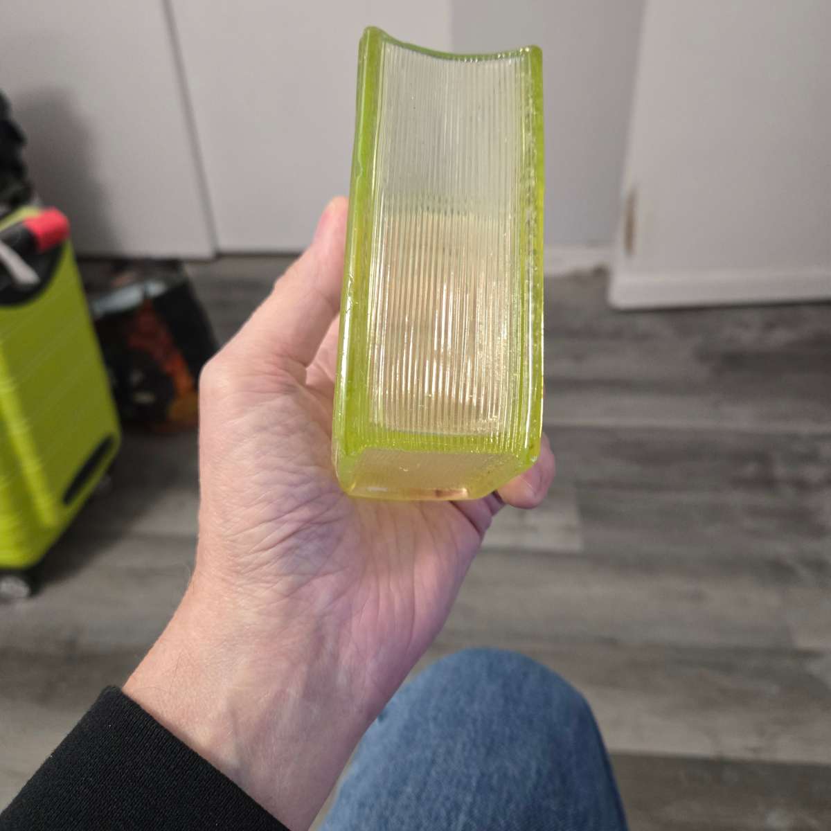 Physical Description: This item is a vintage glass paperweight, likely made from pressed glass. It features a bright yellow-green hue, which is characteristic of certain glass types from the late 19th to early 20th century. The dimensions are approximately 4 inches tall, 3 inches wide, and 1 inch thick. The front is embossed with the words "A PRESENT FOR A FRIEND" in a decorative font, surrounded by an ornate border. The sides are smooth with a ribbed texture, adding to its aesthetic appeal.
