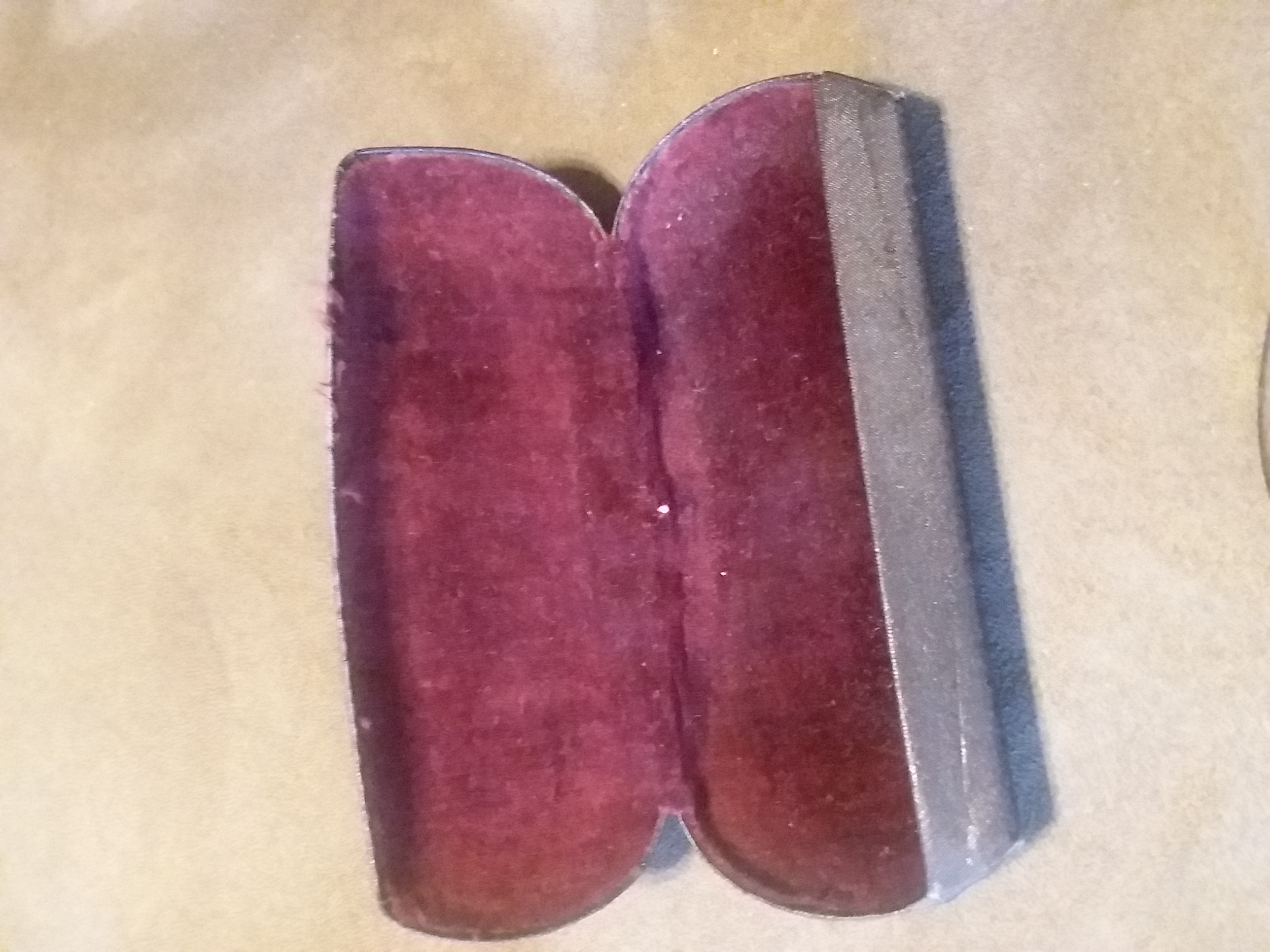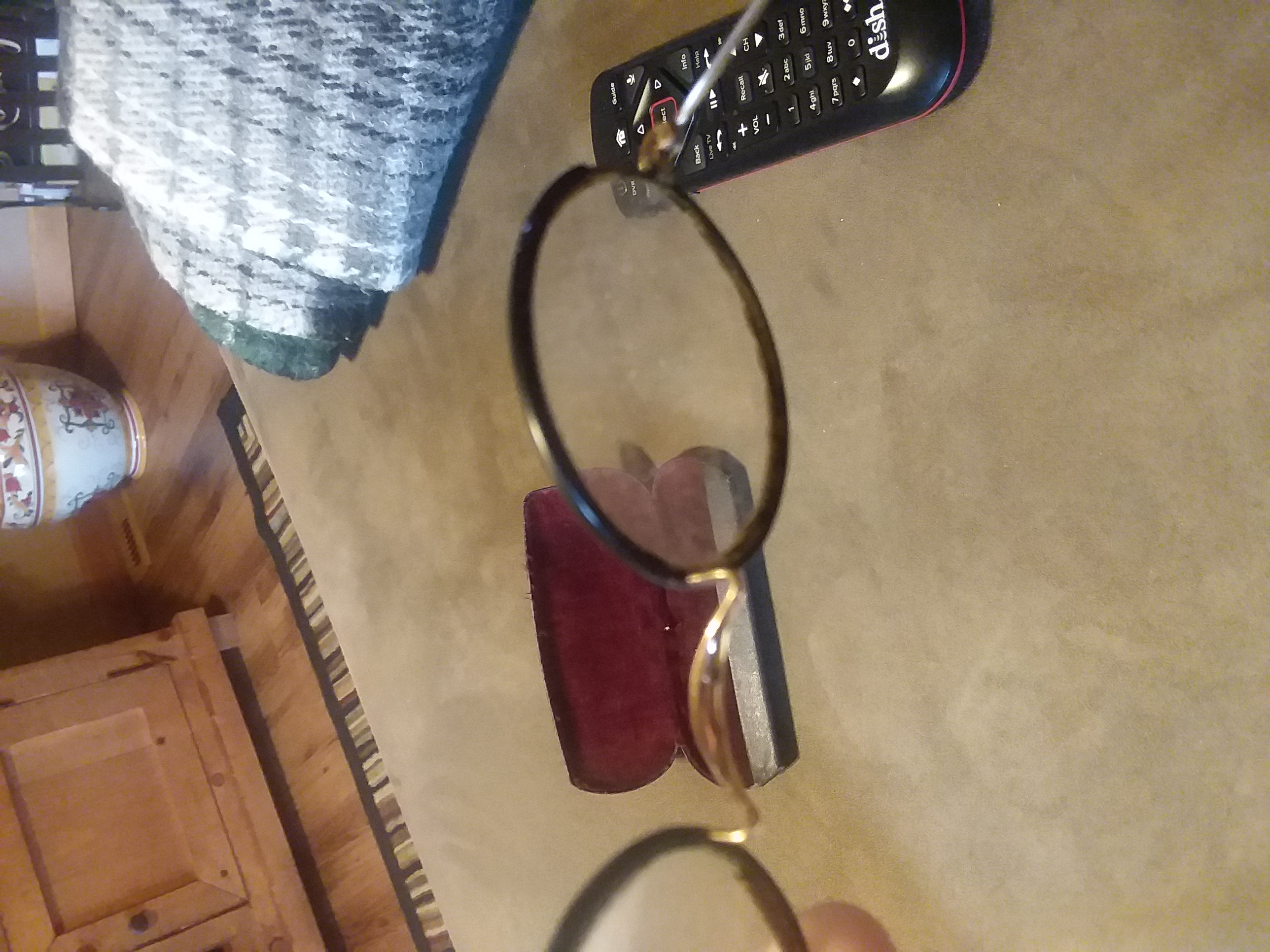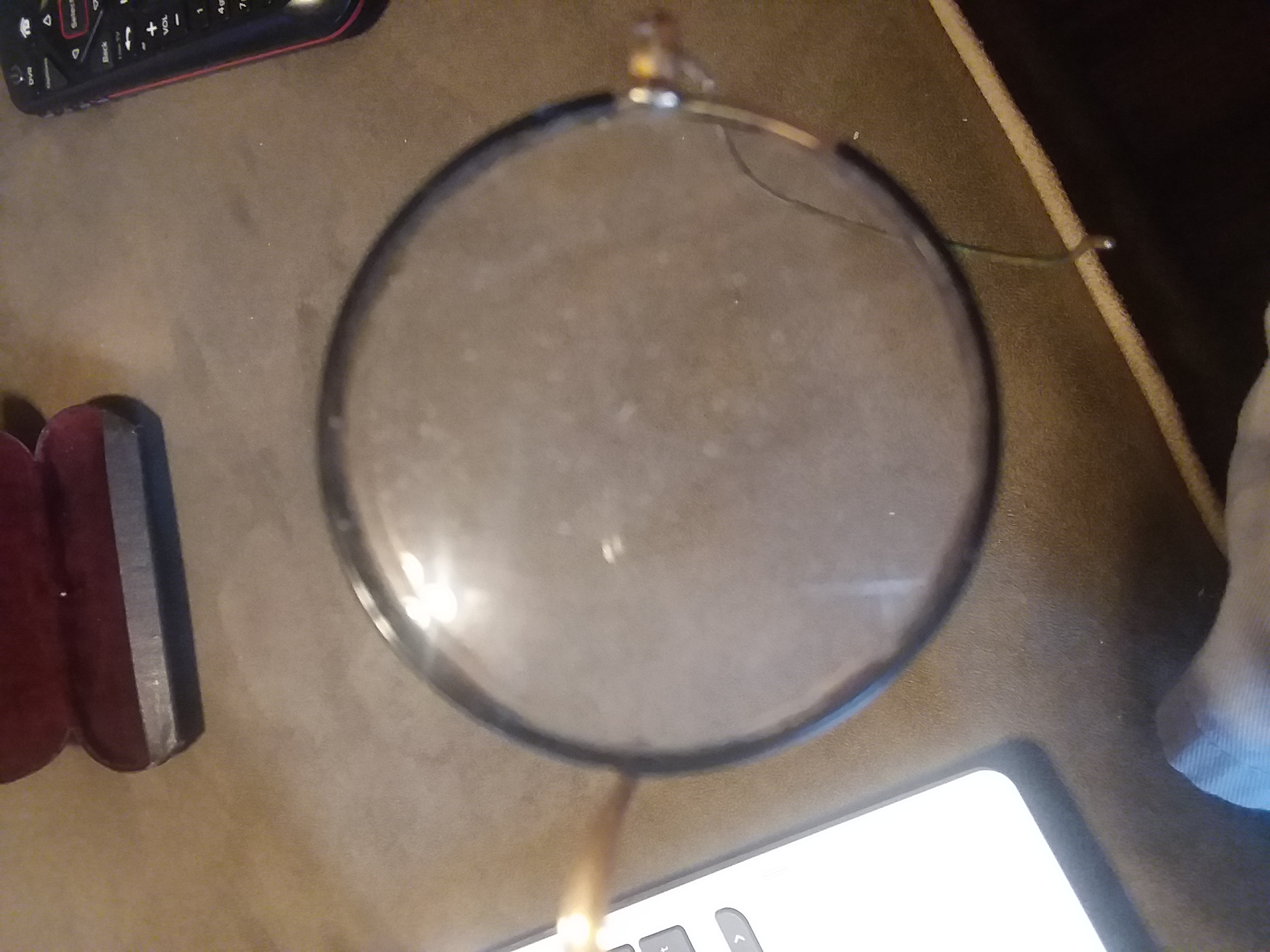 All I can do to describe the item is that it is a pair of glasses, with circular lenses and black rims. The "temples" are thin and seem to be made of wire and curl at the end on both sides. The glasses case is black with "Made in USA" in very small print. The inside of the case is padded and red. The middle of the lense has a circular bifocal in the lower center of the lens. If anyone needs more detailed photos in order to identify the item, please let me know in the comments.