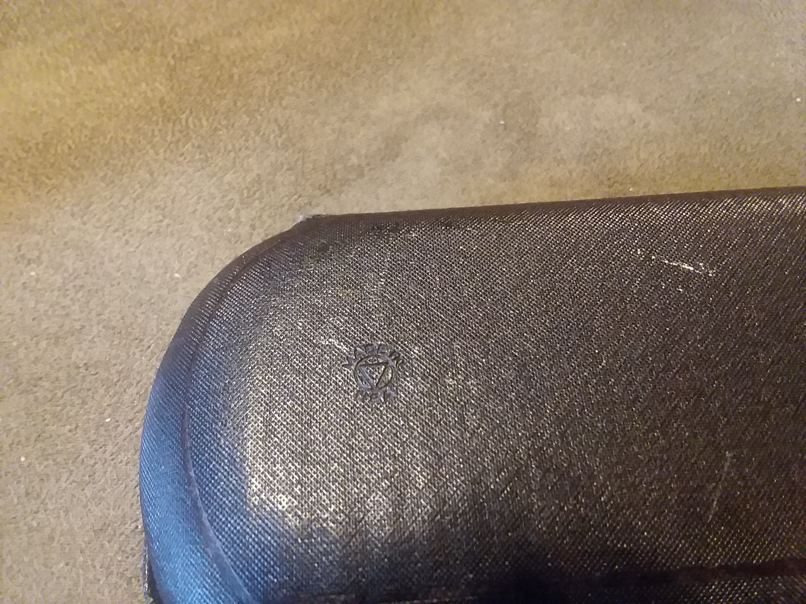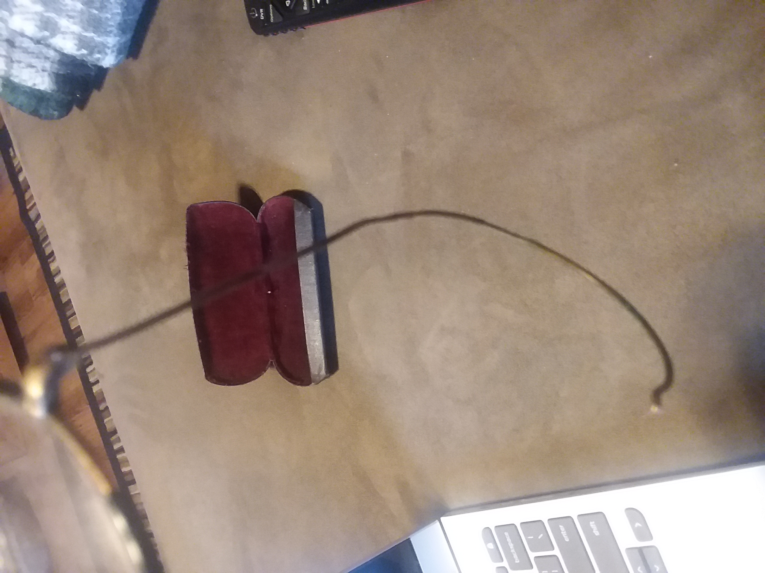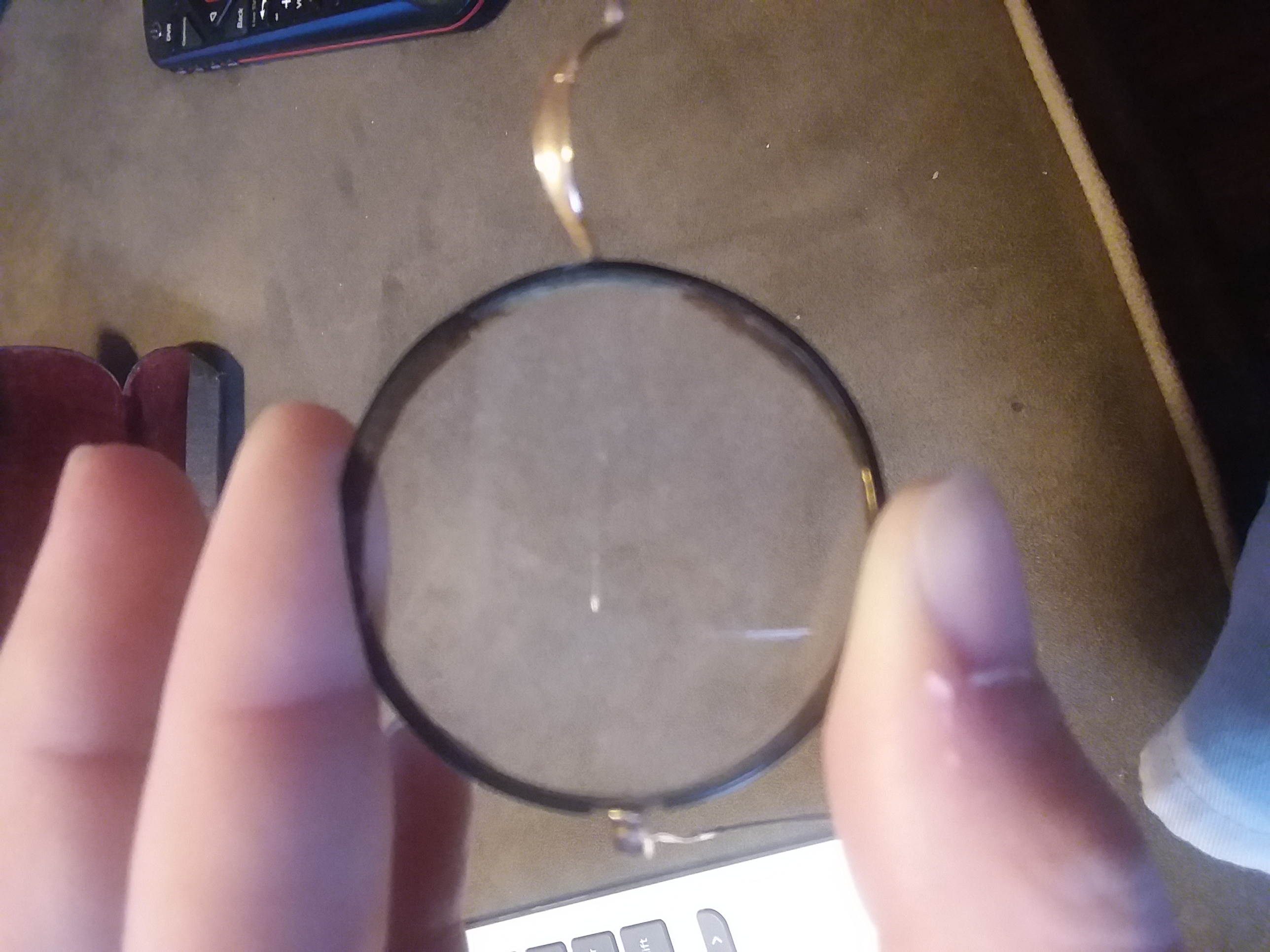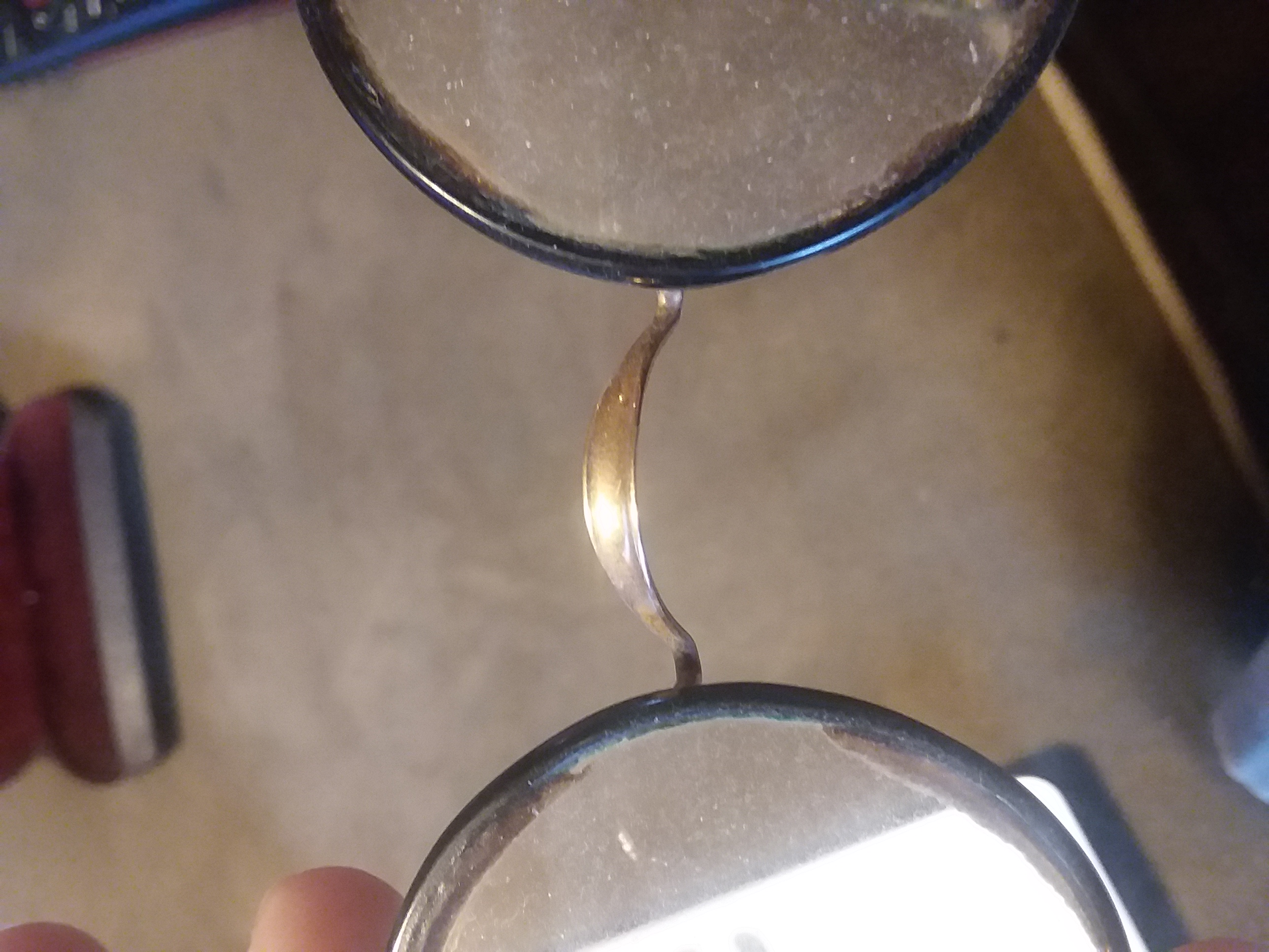 All I can do to describe the item is that it is a pair of glasses, with circular lenses and black rims. The "temples" are thin and seem to be made of wire and curl at the end on both sides. The glasses case is black with "Made in USA" in very small print. The inside of the case is padded and red. The middle of the lense has a circular bifocal in the lower center of the lens. If anyone needs more detailed photos in order to identify the item, please let me know in the comments.