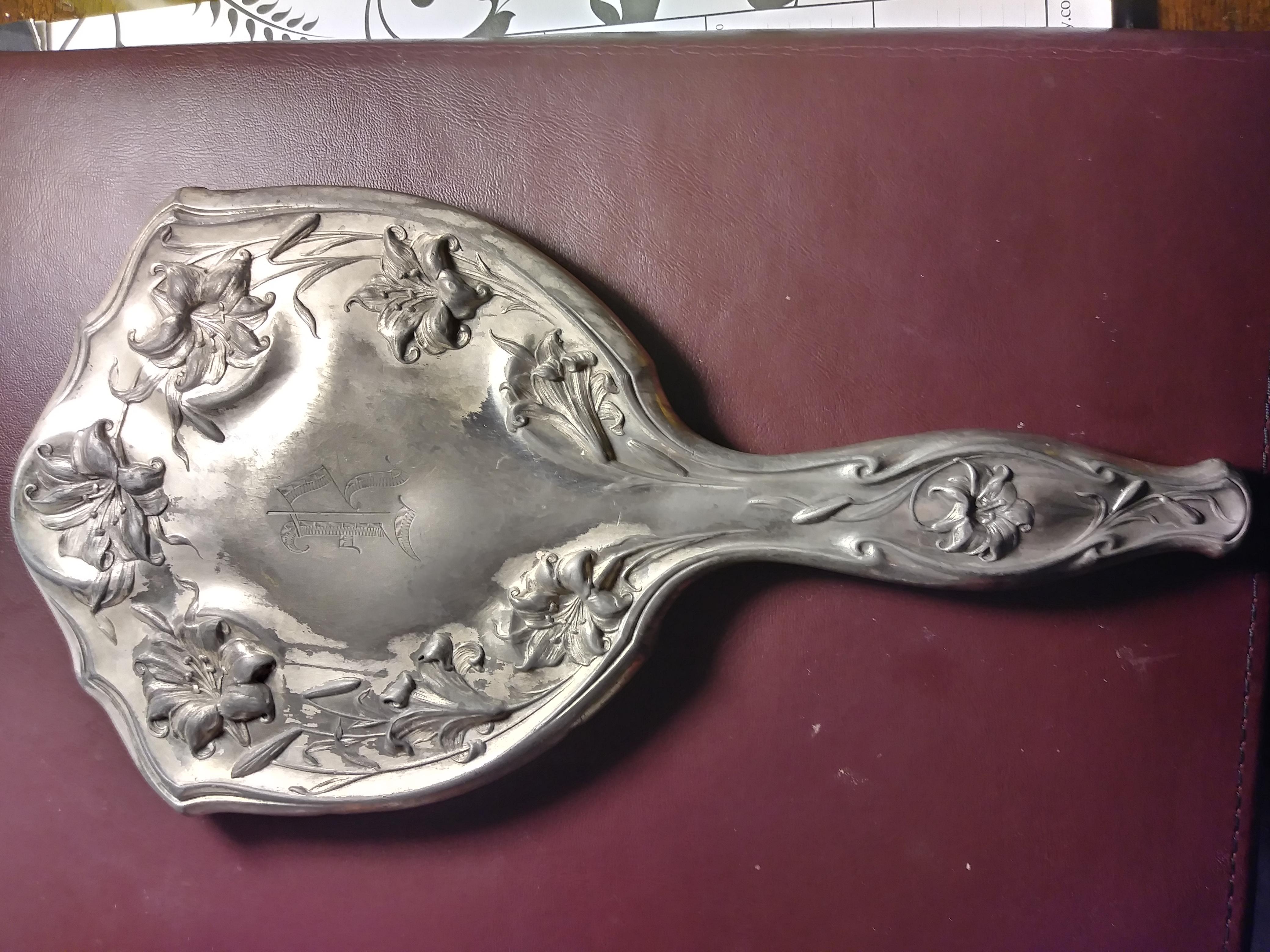 It's Art Nouveau and dates from about 1900-1910, if it's silver it will be marked with Hall Marks or the word "Sterling". Some will have numerical markings such as "925", which indicate the silver content being sterling silver 92.5 % silver. If there are no markings it's most likely silverplate and worth under $50.00.
