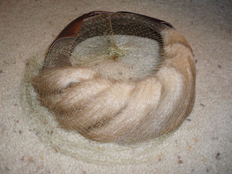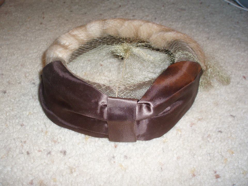 Again a hat with no labels it is a tan/brown with cream colored netting, and fur wrapped around the front and a brown bow in the back.