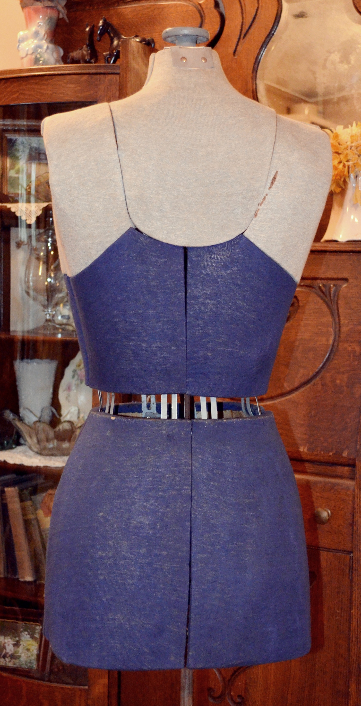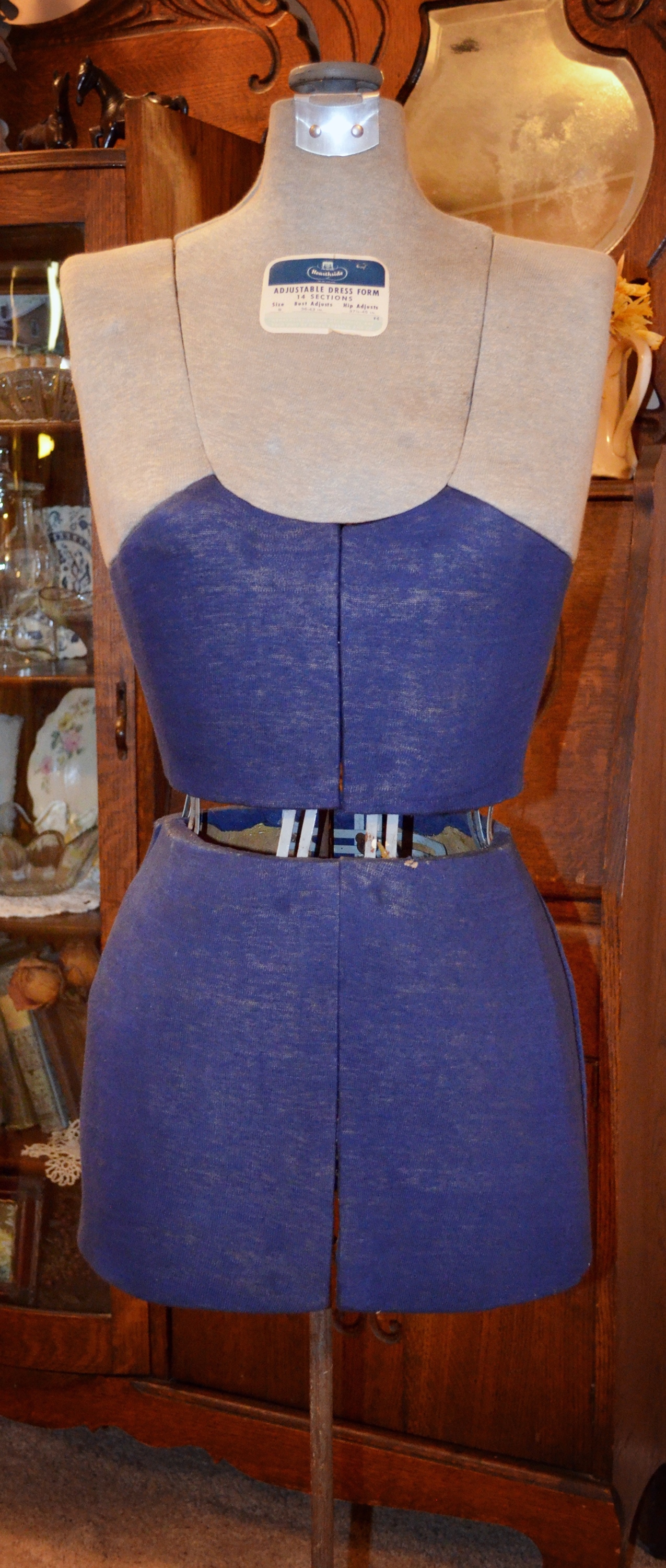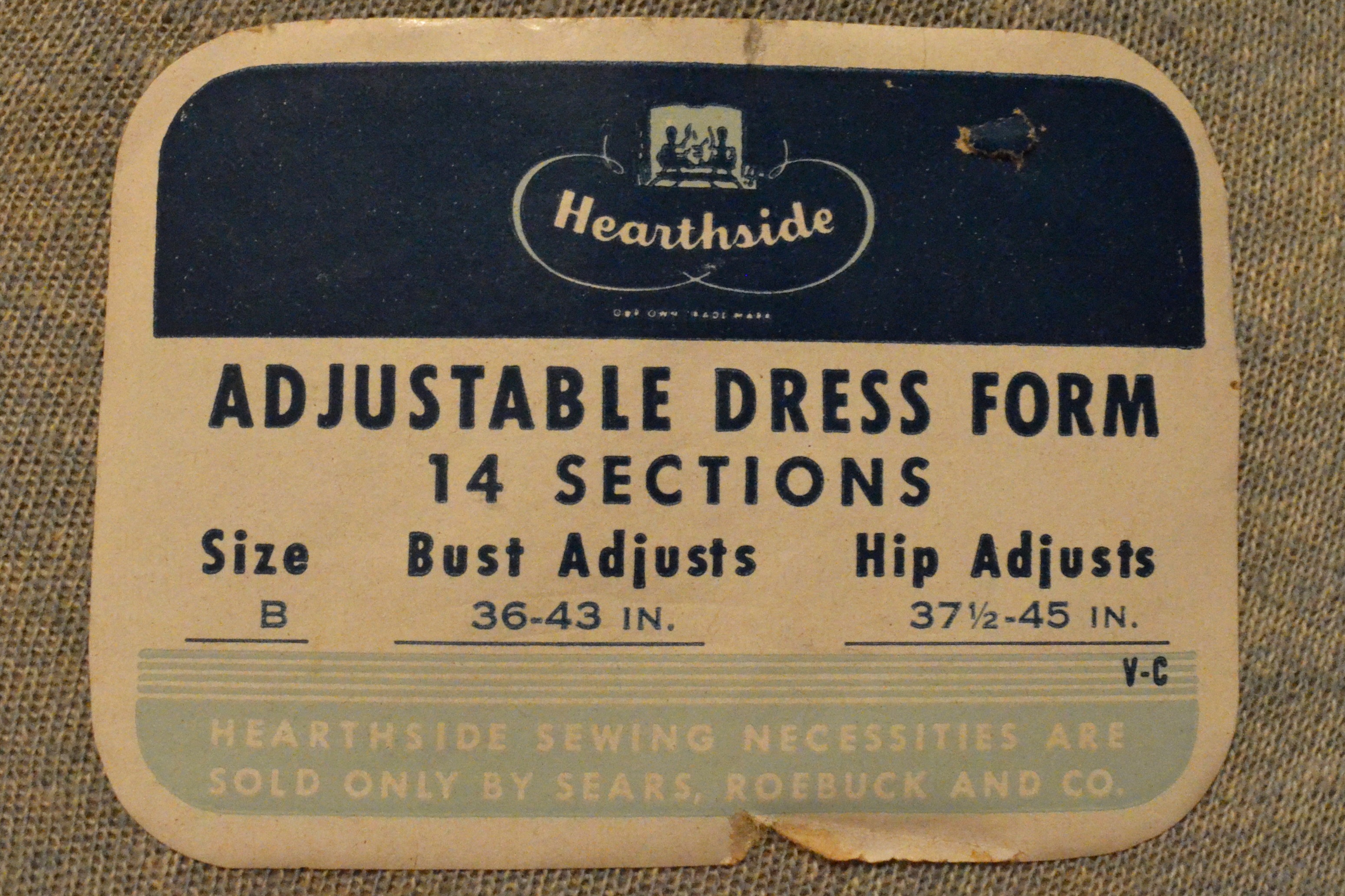 Antique adjustable dress makers mannequin form made by Hearthside exclusivly for Sears & Roebuck Co. It is a size B and has 14 sections. Bust adjusts 36" - 43", hips adjust 37.5" - 45". The original knit cover is in exceptional condition. There is one small spot that looks like a bit of rust on the back shouder. The wing screws for changing size are a little tight and will need some oil. The base is cast iron.