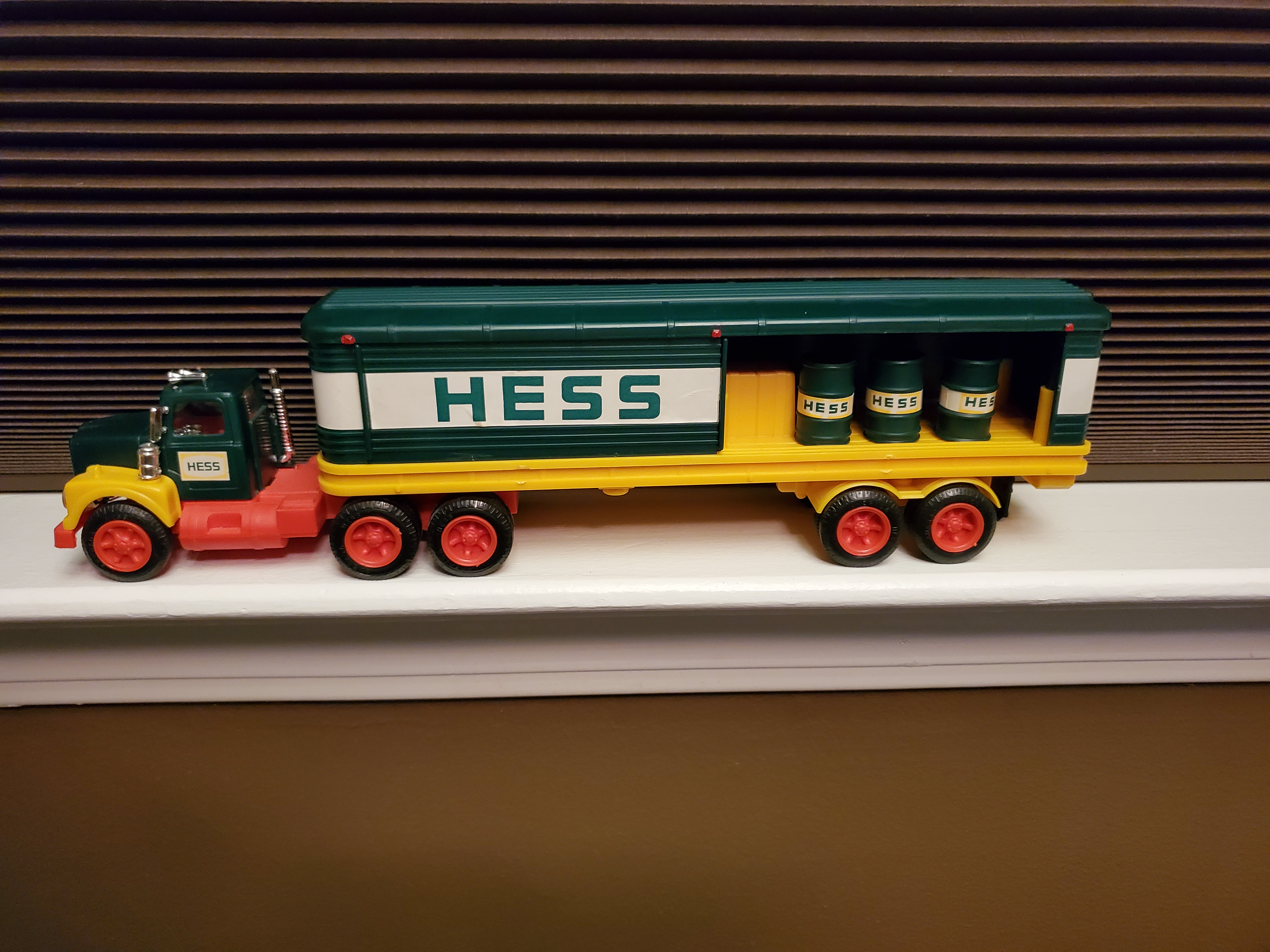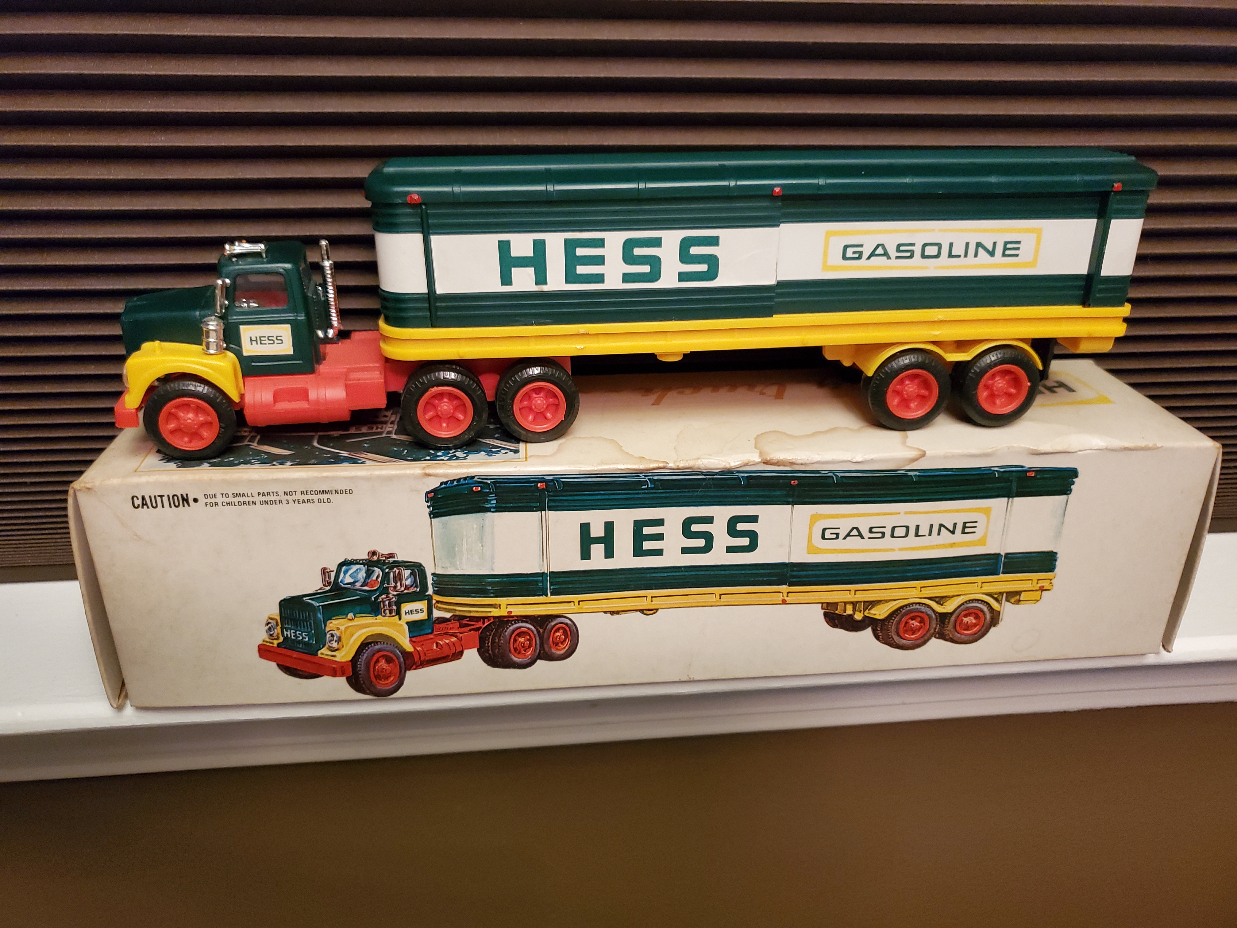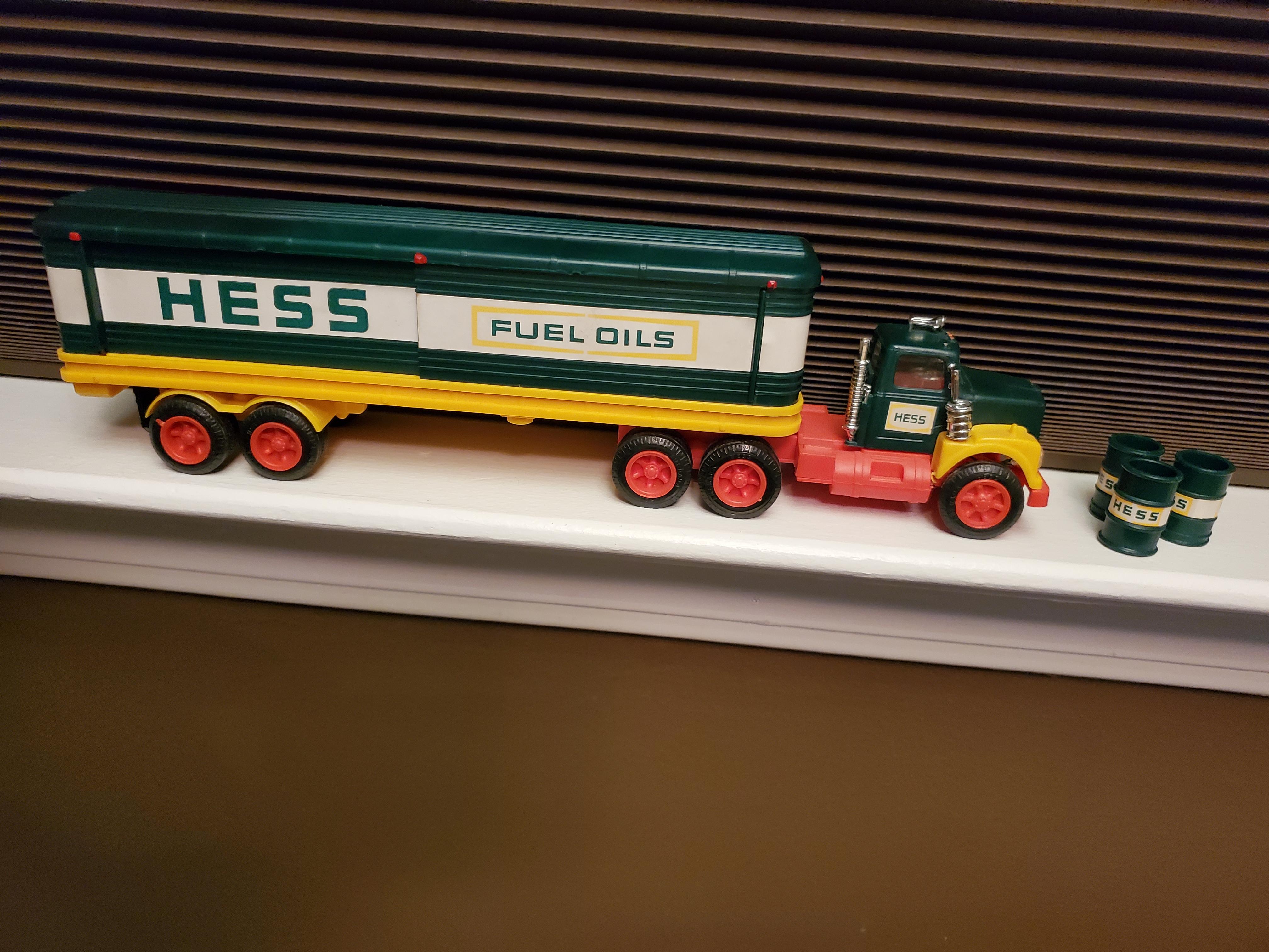 Hess Fuel truck. Lights up with D batteries. Truck is in very good condition . Box shows some wear.