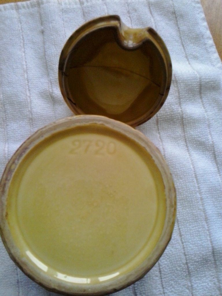 I have an antique honey pot from the late 1940s to early 1950s. All it has showing on the bottom of the pot is 2720. So far I have found one similar that has 2720/2 stamped on the bottom. There are no markings on the inside of the lid. So far, I have found out that it is Germany and most likely is manufactured by Stricklands. I have only determined this by finding the 2720/2 pot on the internet. The /2 usually means version 2. Can anyone tell me what we have and what it might be worth? I have attached a few pictures of it.