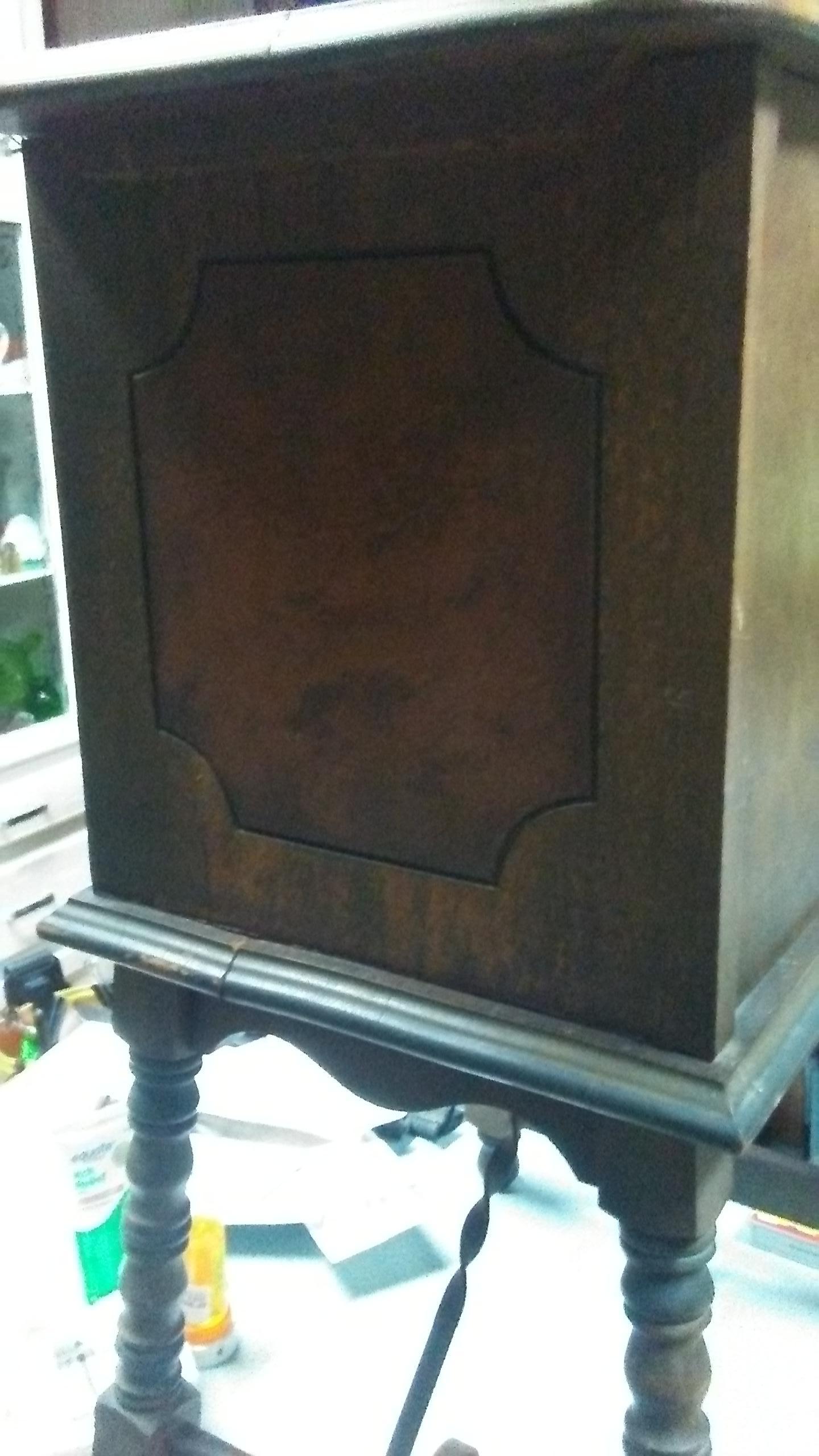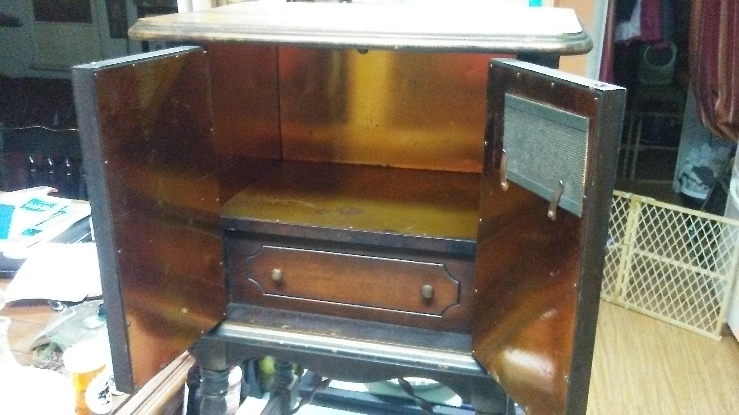 TWO DOOR. COPPER INTERIOR. INTERIOR DRAWER BELOW COPPER CHAMBER. 28.5 INCHES TALL. DECORATIVE BURLED INLAY ON EACH SIDE.WHITE STENCIL  MARKS ON BOTTOM: NO.18 H.D. ANY HISTORY INFO?MAKER? VALUE?