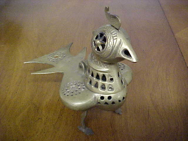 This is a vintage brass bird in which incense cones are placed in side to burn. The bird's upper body opens up and is held in place at the hinge.