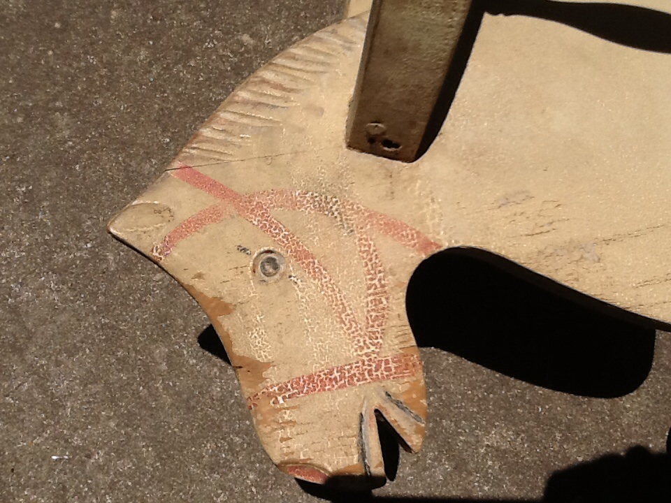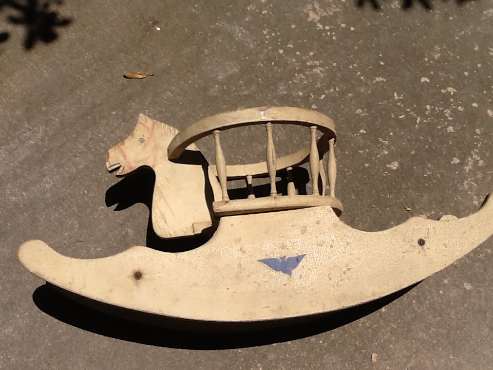 This is an infants rocking horse that I picked up at a flea market in Wimberley, texas a couple years ago. I can't find any information on it. There don't seem to be any markings other than a bluebird on each side which might just be decoration. The paint seems very old but I think that old look can be faked. Lol. The entire piece is dovetailed together and has a few repair screws in the bottom that differ from some flat nail heads in the bottom. It still seems very sturdy just dirty.  I am wondering what is the age of this little horse and who made it? Also, what can I clean it with?