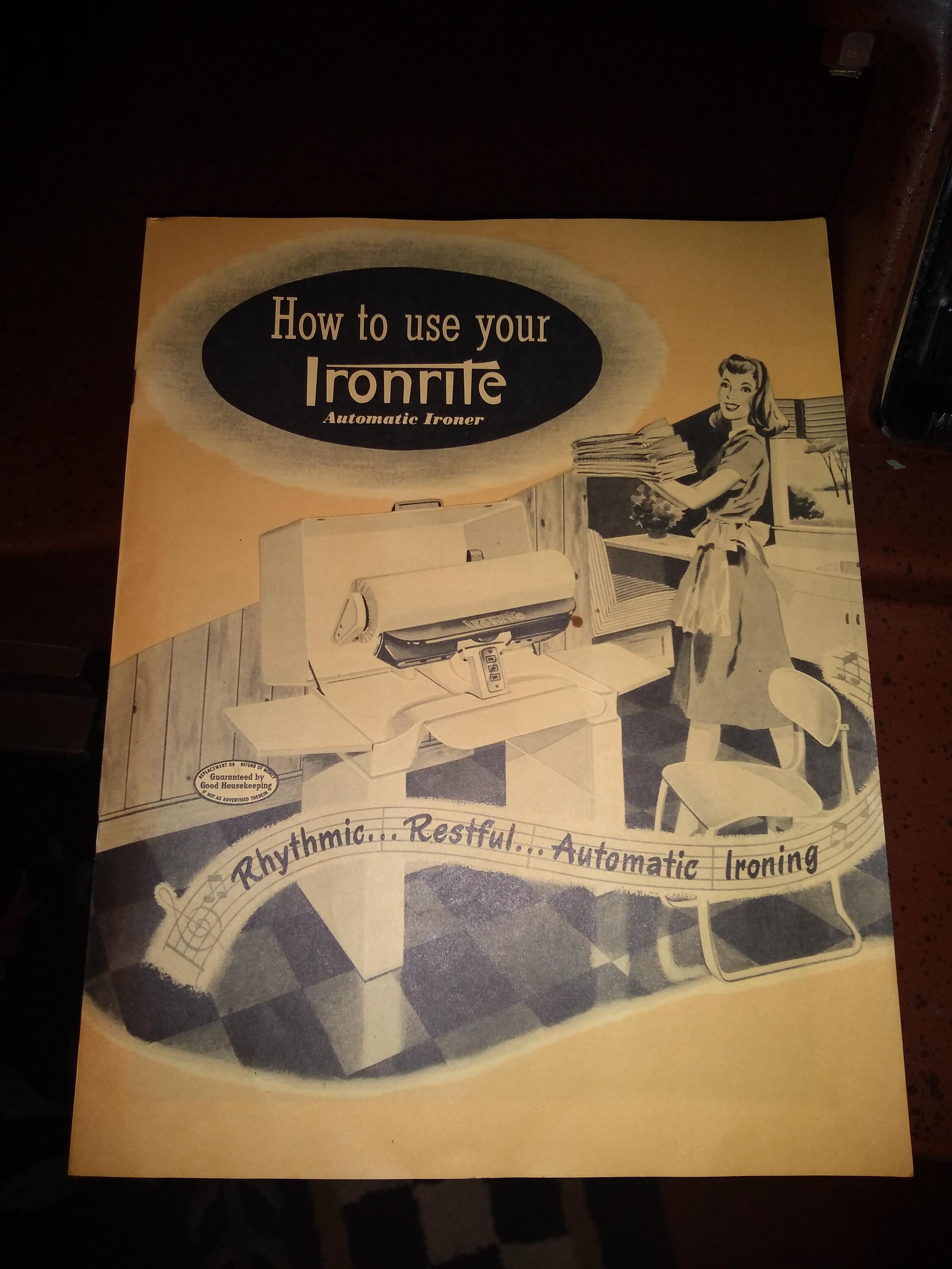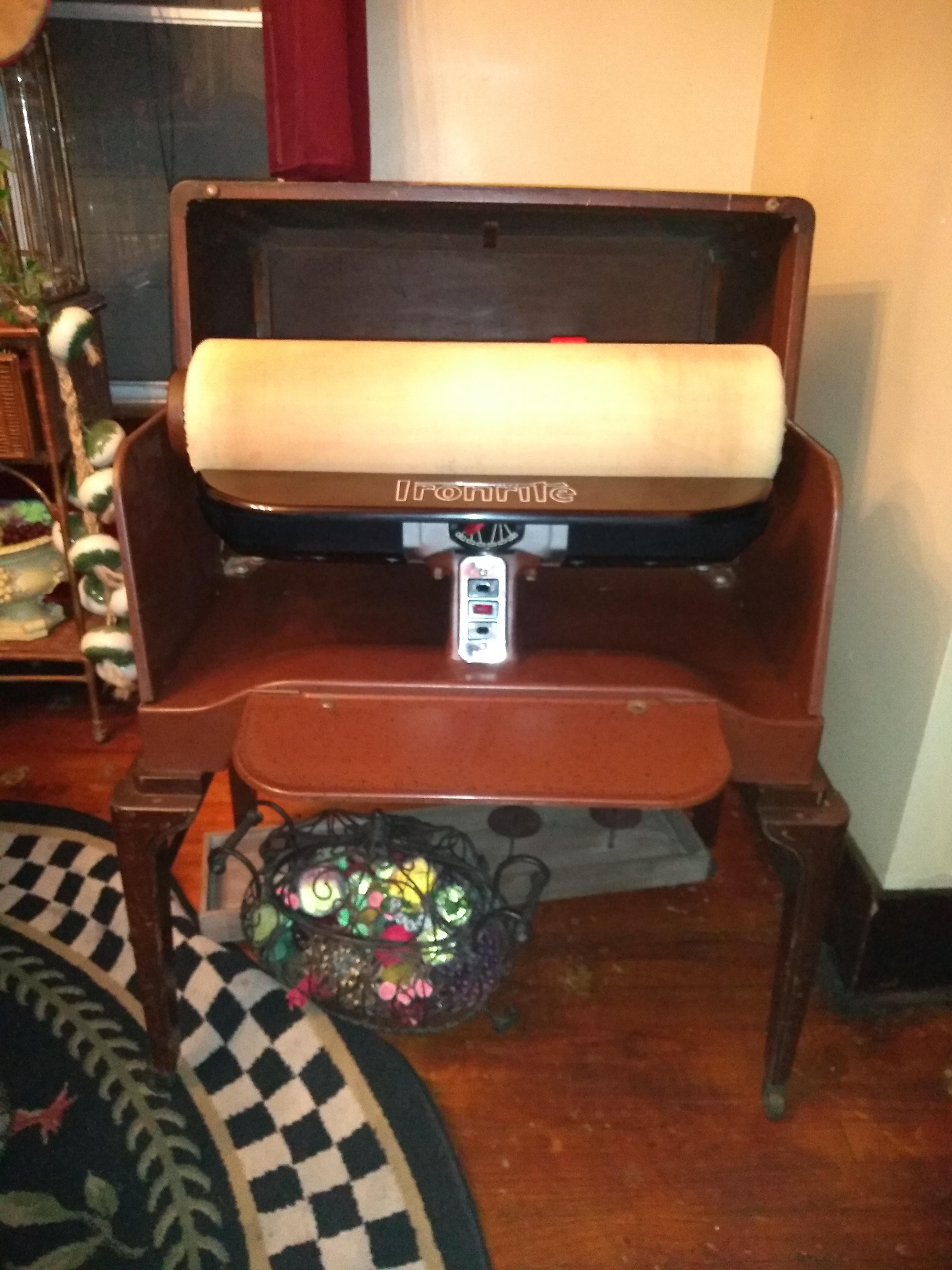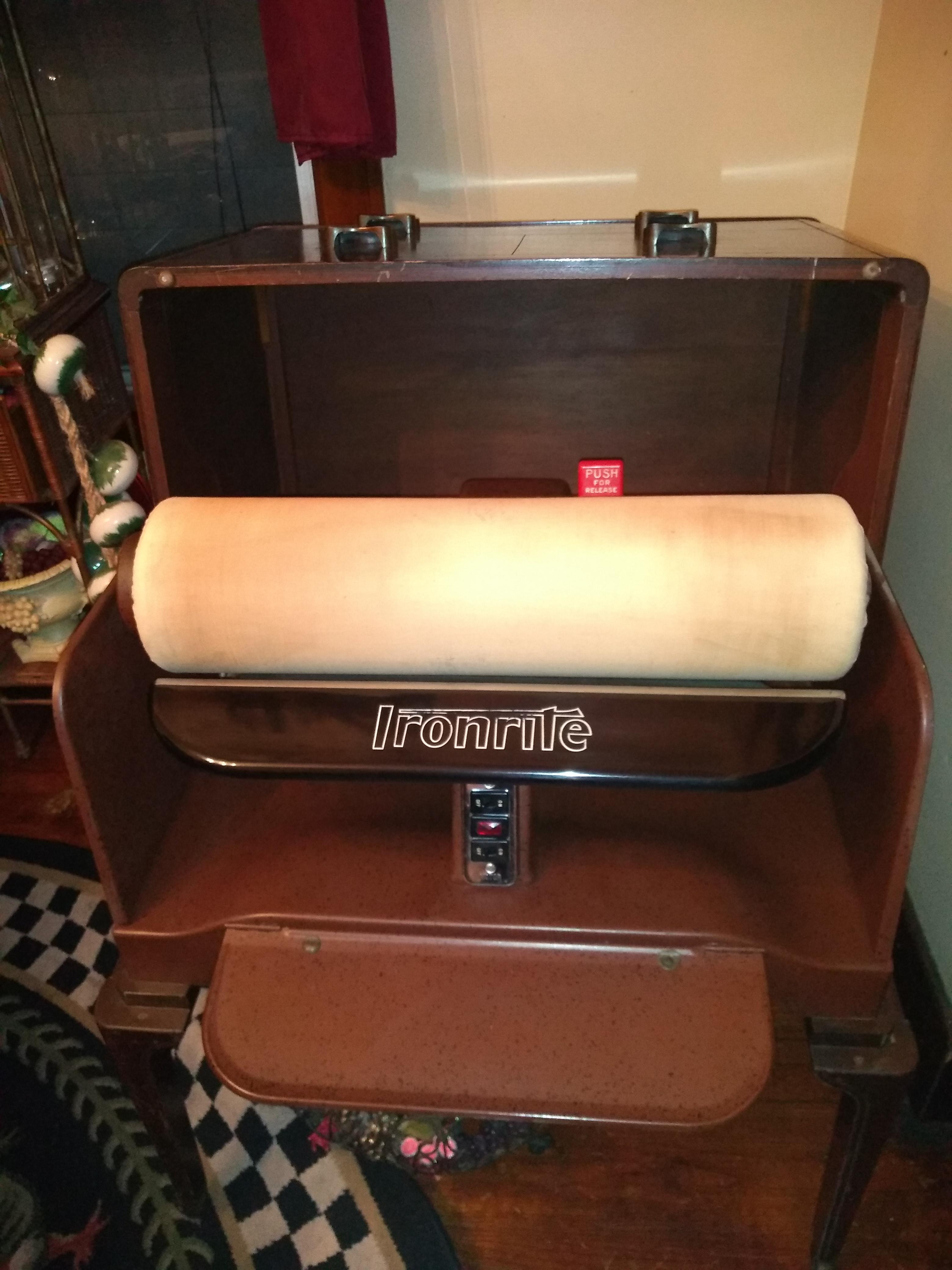 It's a 1950s vintage Ironrite steam press for linens and clothes. Have all original paperwork that is in mint condition. It's a dark Amber redish wood stain..I'm trying too see what the value of this is .