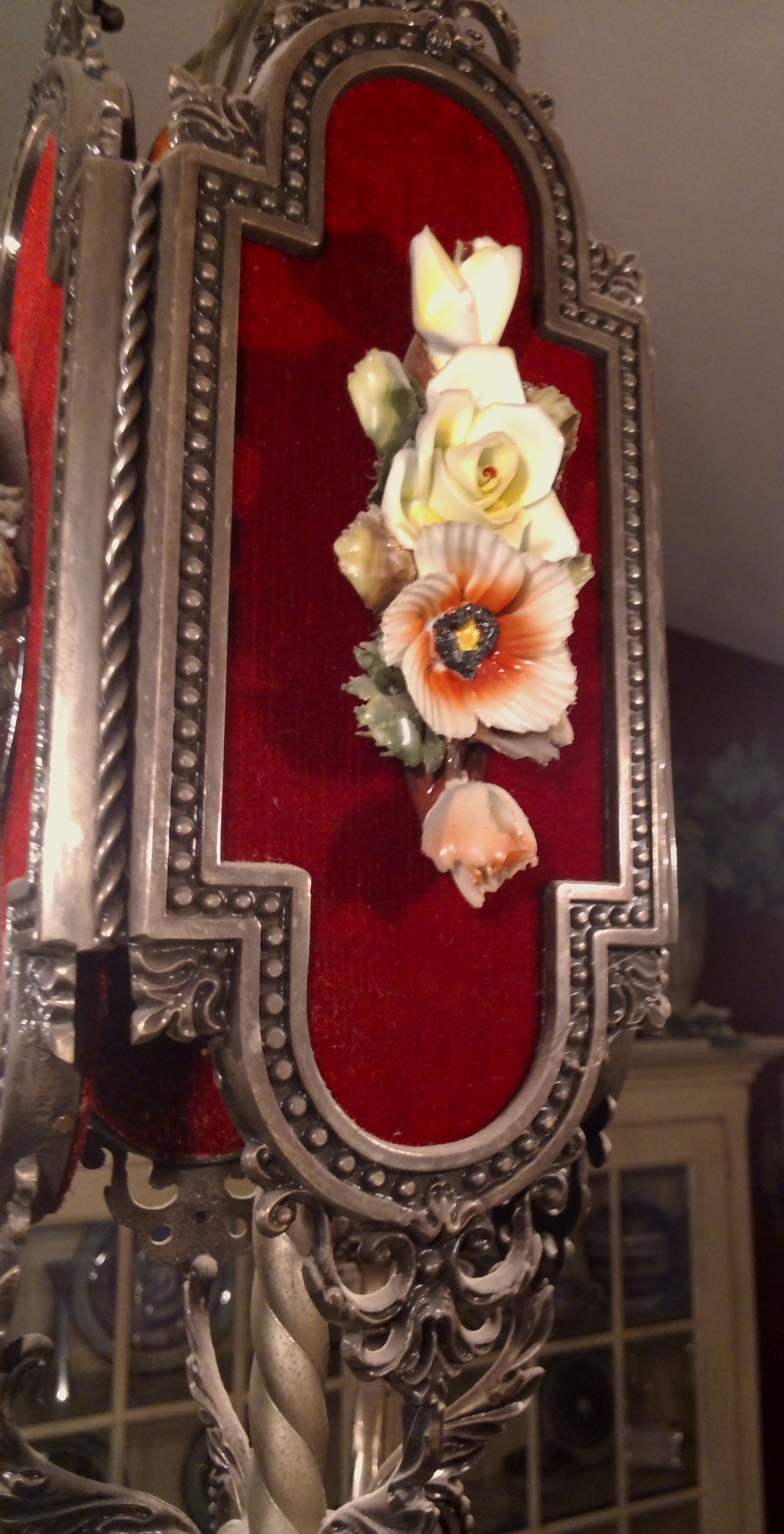 6 arm Hand carried from Verona Italy in the 50's appears to be a brass with very delicute capodimonte Italian Porcelain Chandelier. Double sided rosettes in the arms and on four sides of the interior center. Purchased from the original owner that brought it to the US.