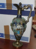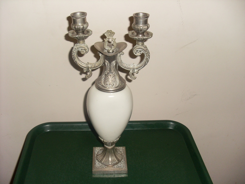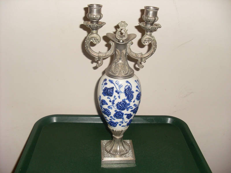 This exquisite decanter has two candle holders and measures 14" tall. The top and base I believe are pewter and has great detail and beautiful craftsmenship. The center portion of the decanter is white ceramic (I believe) with hand painted blue flowers on the front. On the bottom of the decanter is the following.......HAND PAINTED MADE IN ITALY, RIPROD VIETATA, CC ART 2598. Also in the center of the bottom is a stamping of a crest with a crown and leaves and possibly a flag below the crown. Hard to read.
