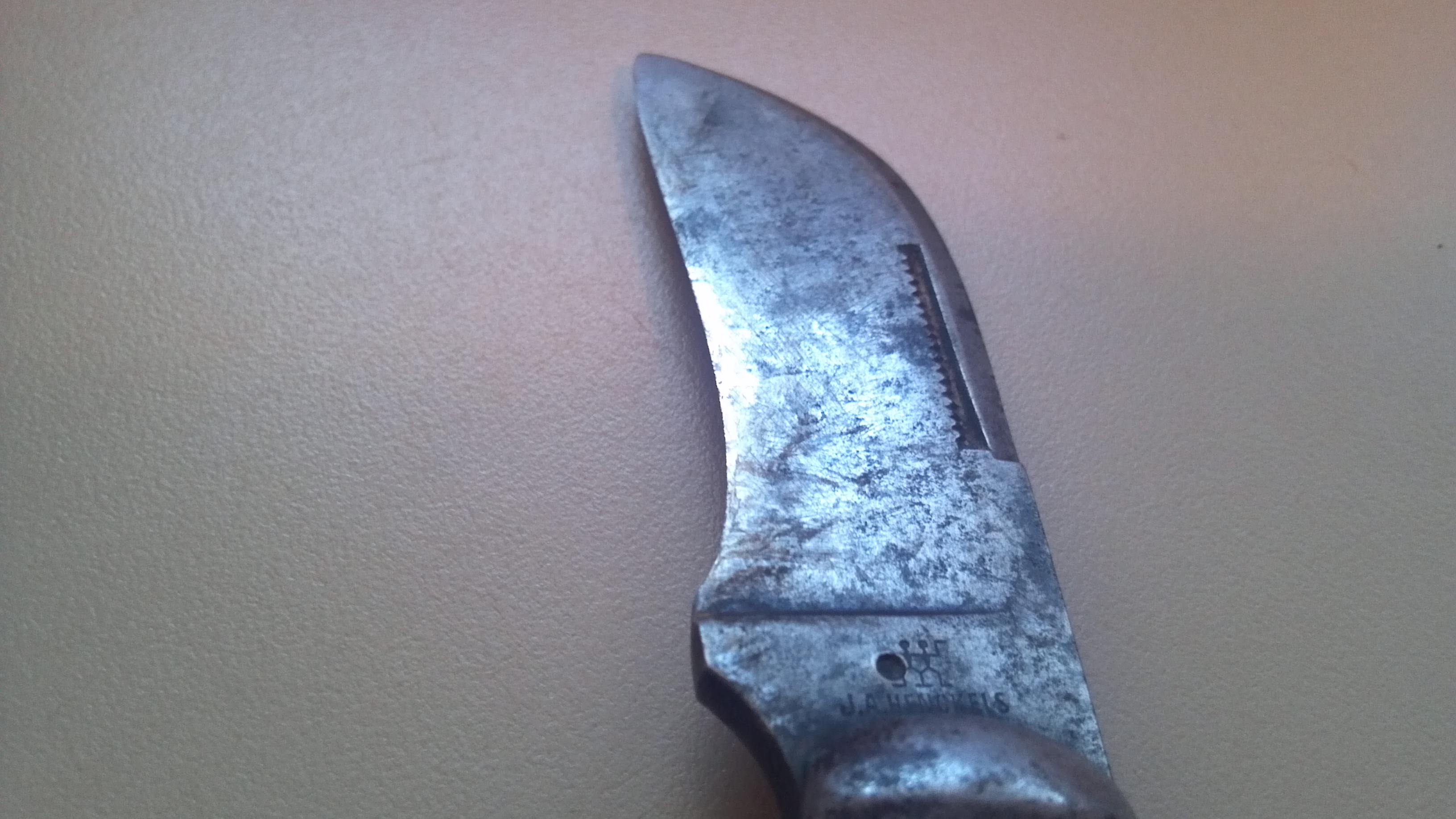 Rare antique wooden handled J. A. HENCKELS German pocket knife. Two stick men dancing symbol on shank as well as J. A. HENCKELS and GERMANY. The thumb pull is jagged teeth like, almost looks like a saw. Wooden handle. It was my late great uncles knife.