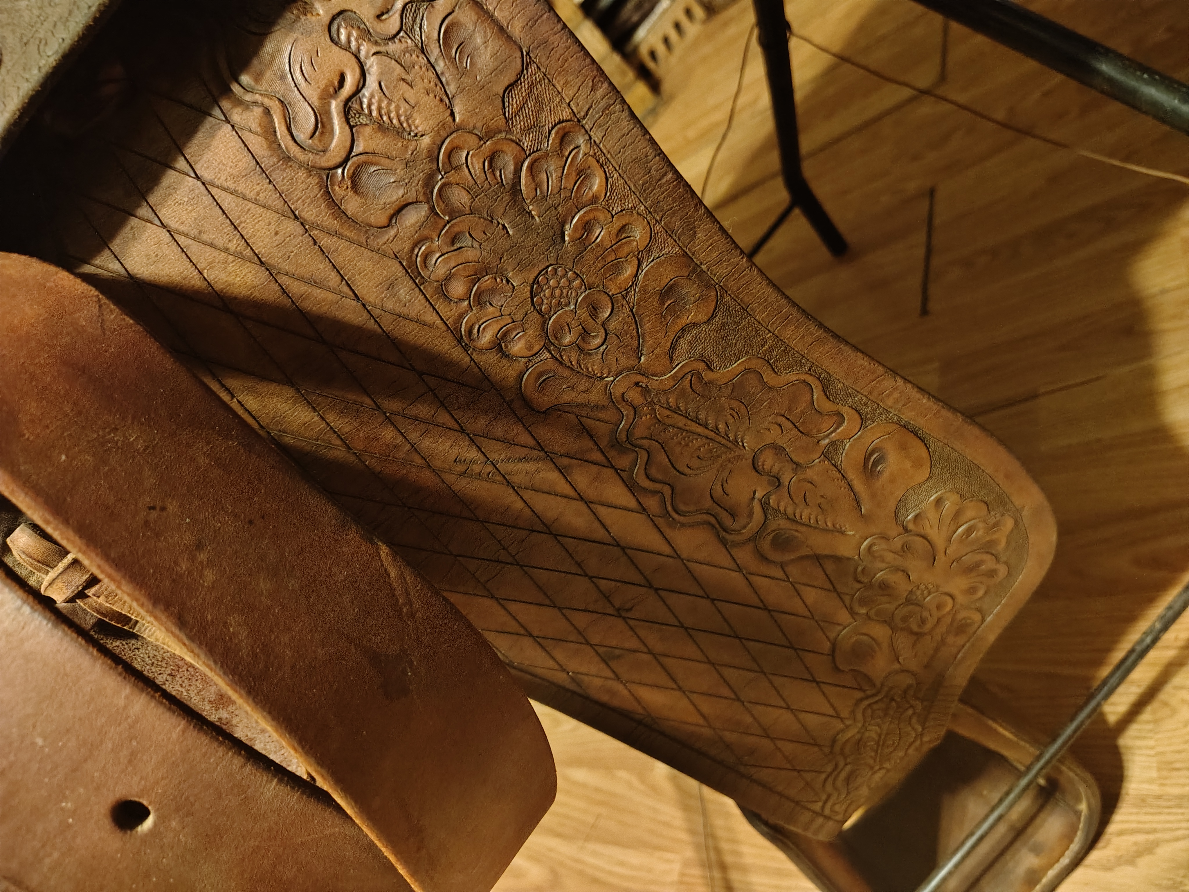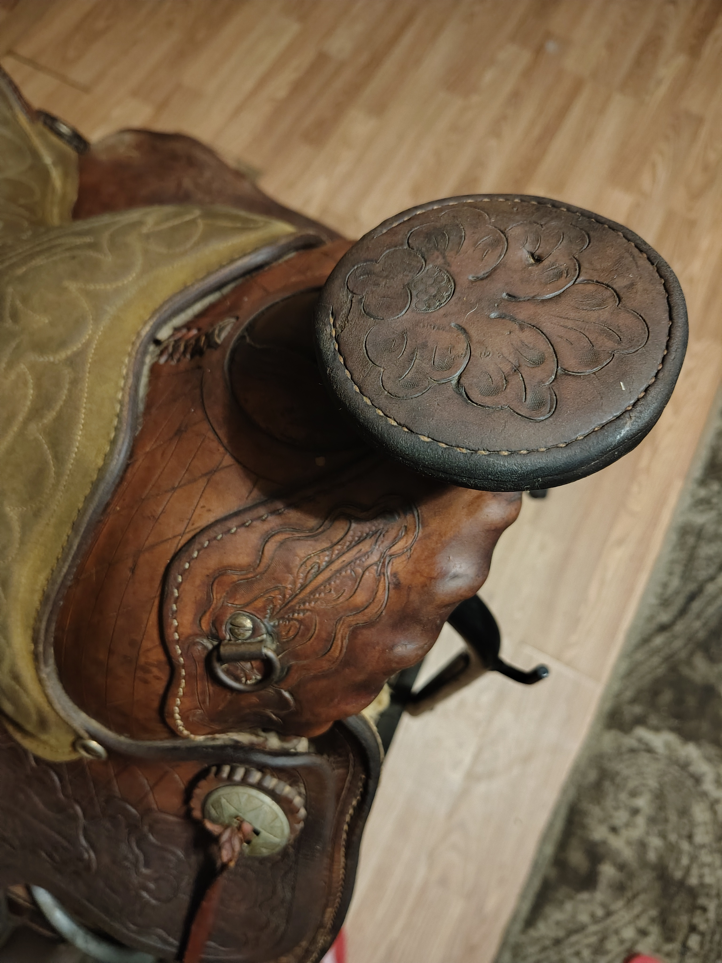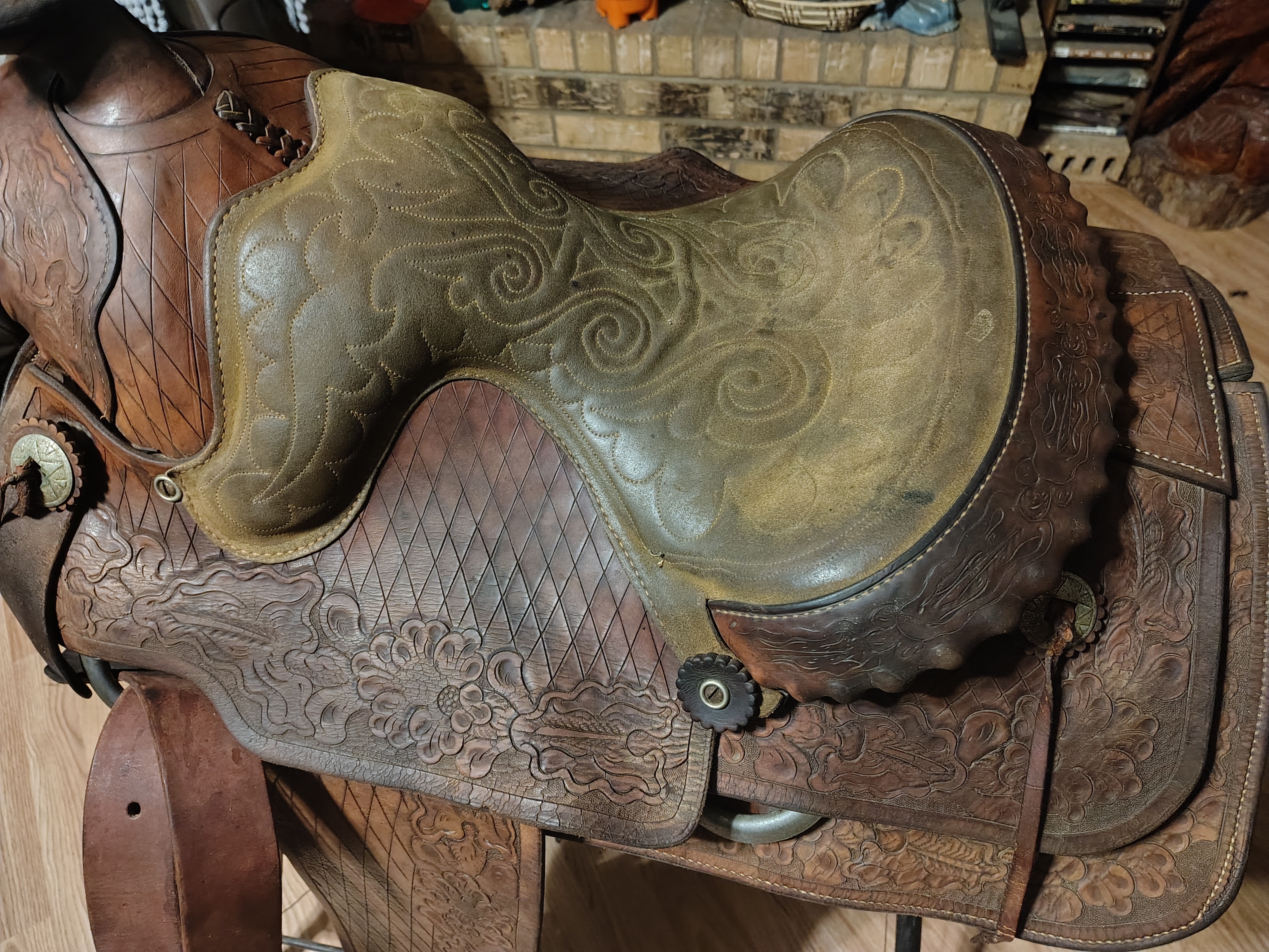 Collectors value vintage saddles for their craftsmanship, historical significance, and the artistry involved in their creation. The rarity of pre-1904 saddles adds to their appeal, as well as the unique design elements that represent the style trends of the period. This saddle, with its intricate tooling and branding, is particularly desirable for collectors of Western memorabilia.