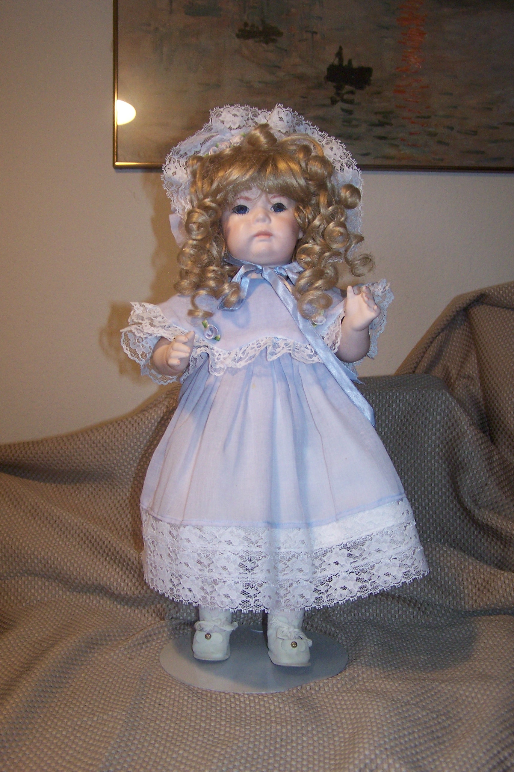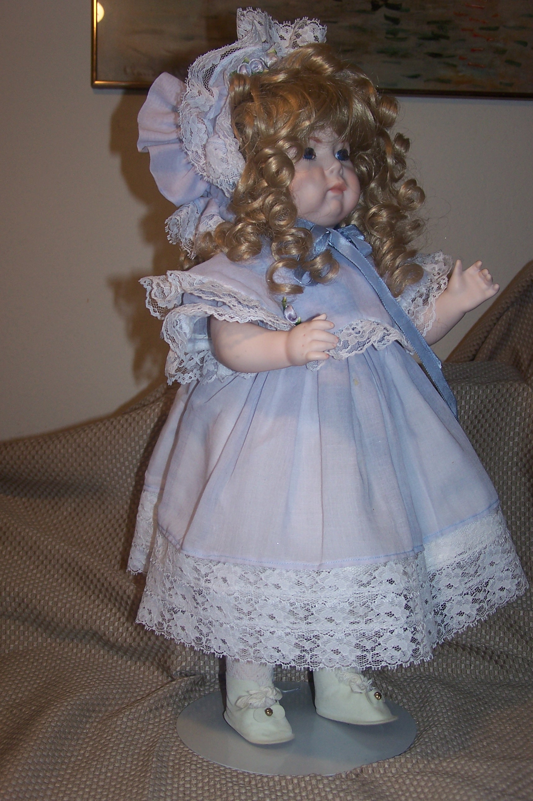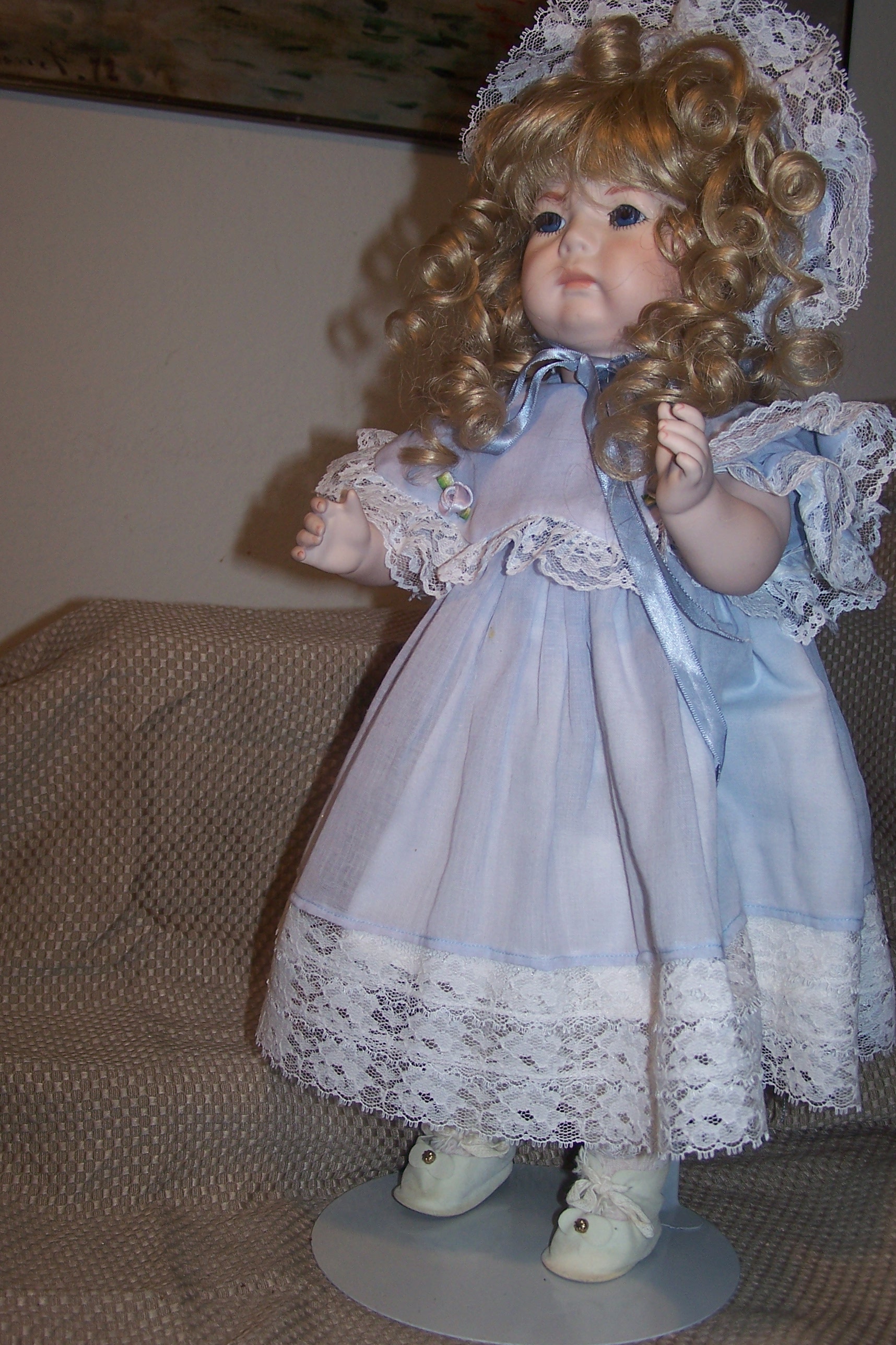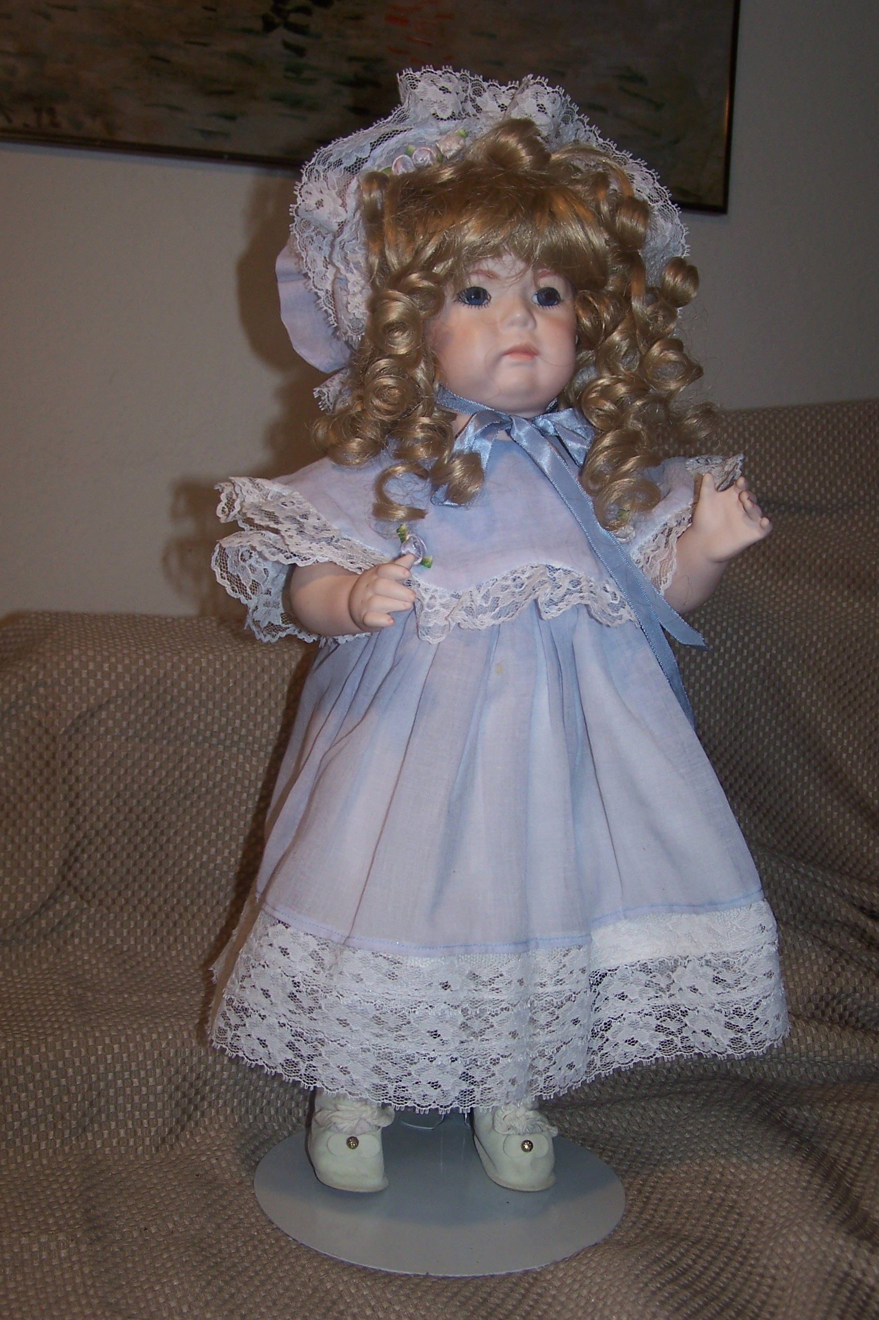 Nicely strung. She is wearing an classic dress with pinafore including dress, pantaloons, socks, a long flowing blonde wig over sized blue bonnet,stockings, shoes all clothing is not antique ..she was dressed in this clothing when she was given to me.The head is vintage .and she is in excellent condition .Doll stand is included, I am interested in the value this doll ,i also have Kester "HILDA" that is original and vintage completely. I first want an appraisal on this doll ..i will sell it on e bay ..Thank you .