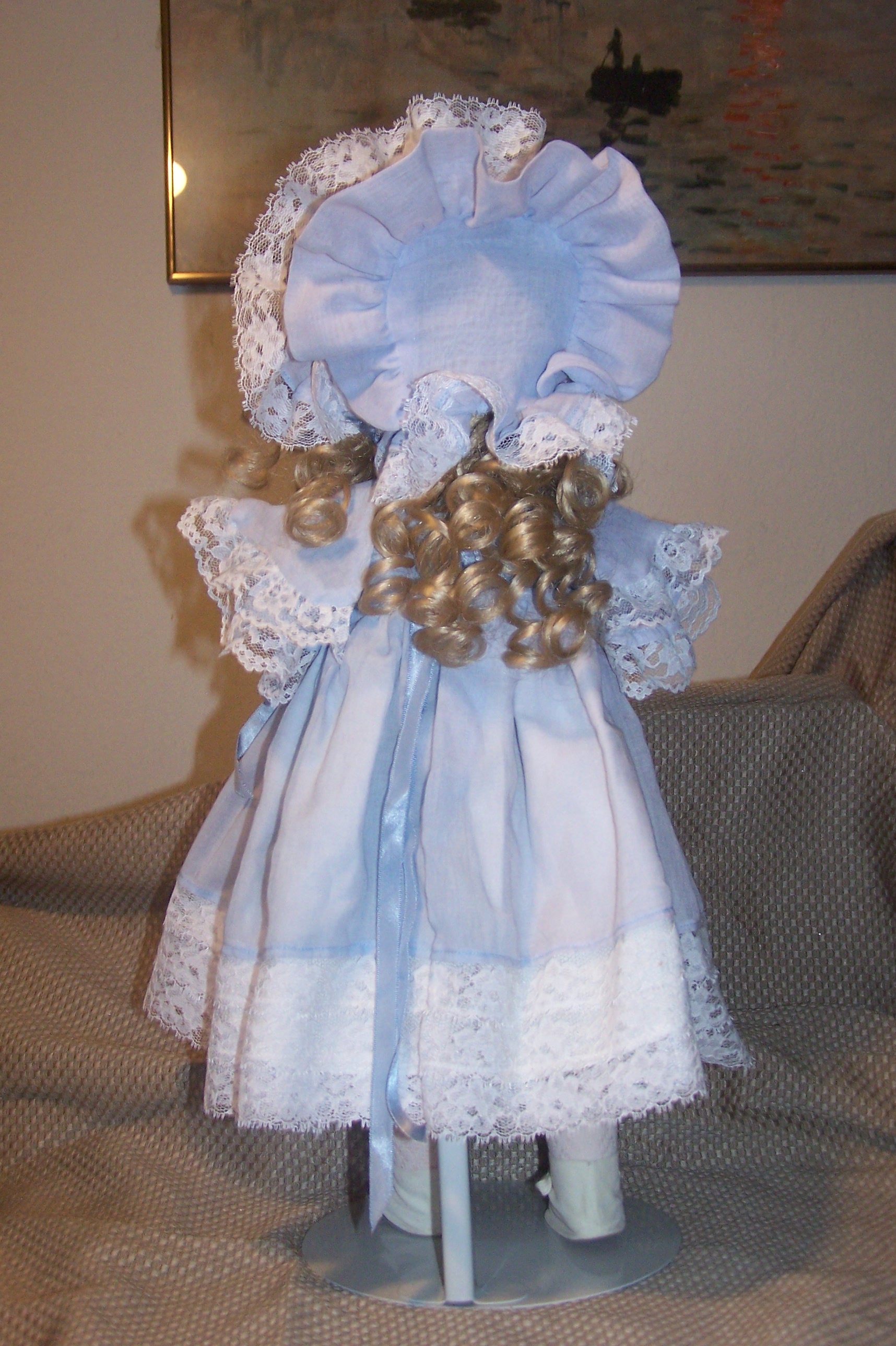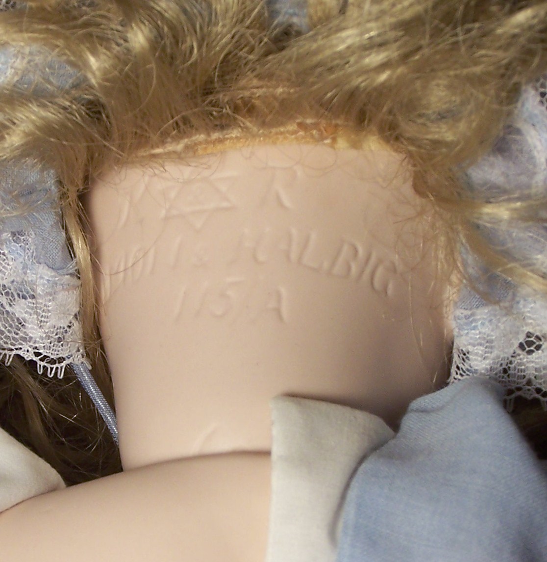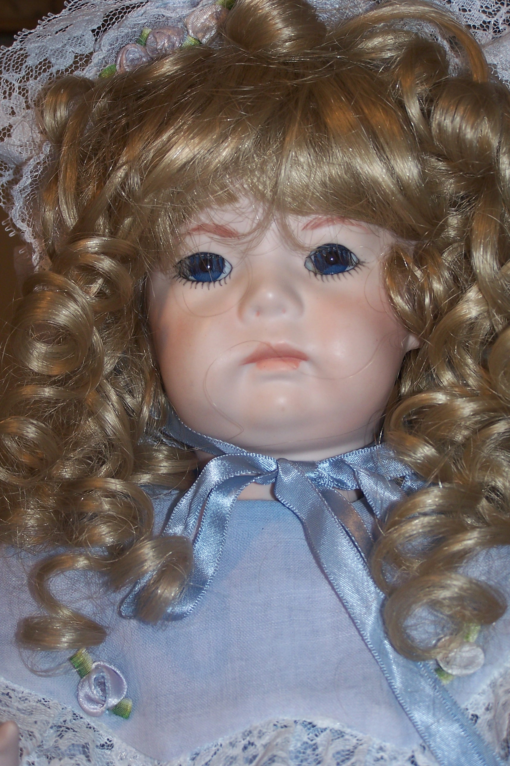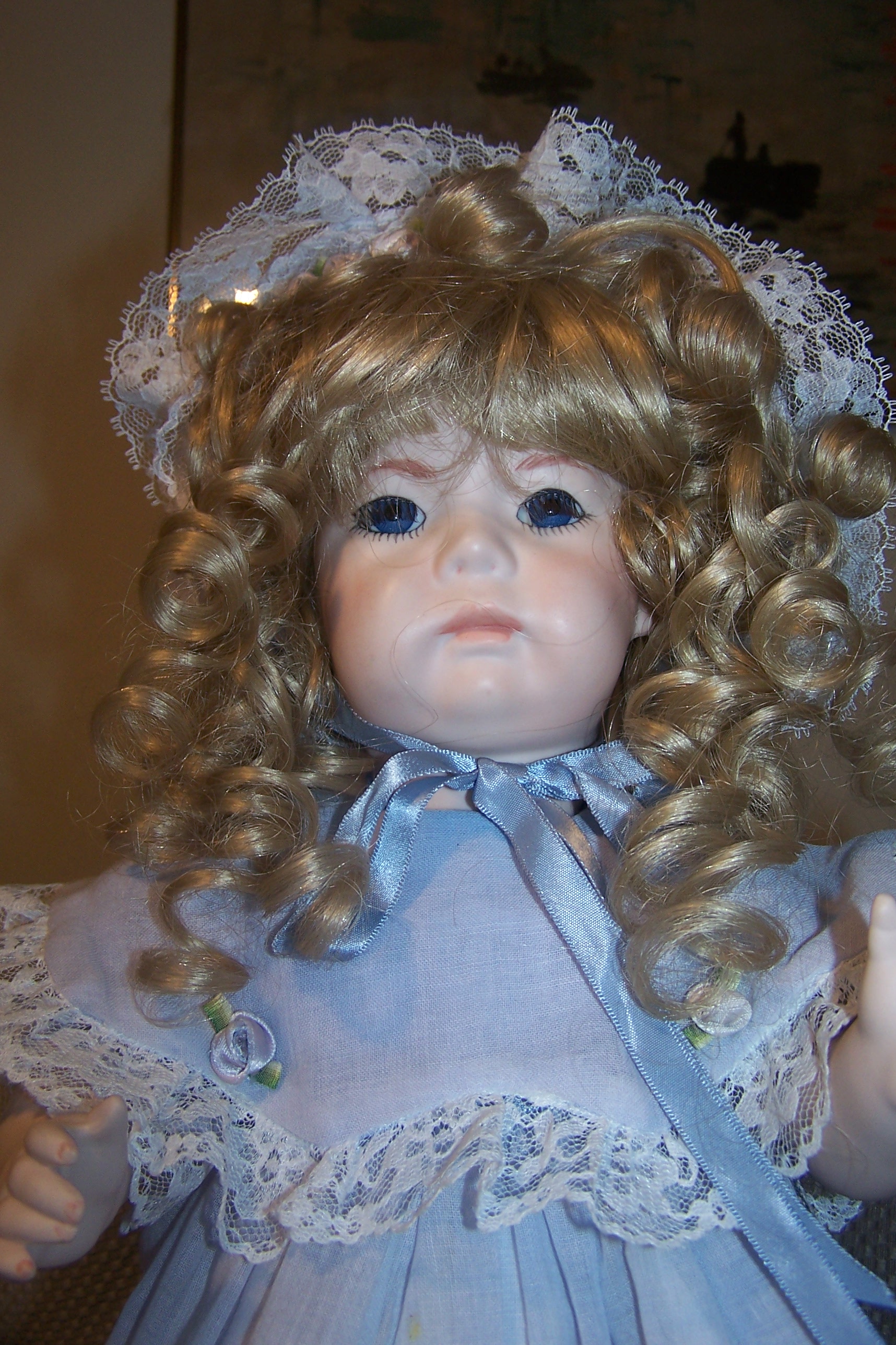Nicely strung. She is wearing an classic dress with pinafore including dress, pantaloons, socks, a long flowing blonde wig over sized blue bonnet,stockings, shoes all clothing is not antique ..she was dressed in this clothing when she was given to me.The head is vintage .and she is in excellent condition .Doll stand is included, I am interested in the value this doll ,i also have Kester "HILDA" that is original and vintage completely. I first want an appraisal on this doll ..i will sell it on e bay ..Thank you .