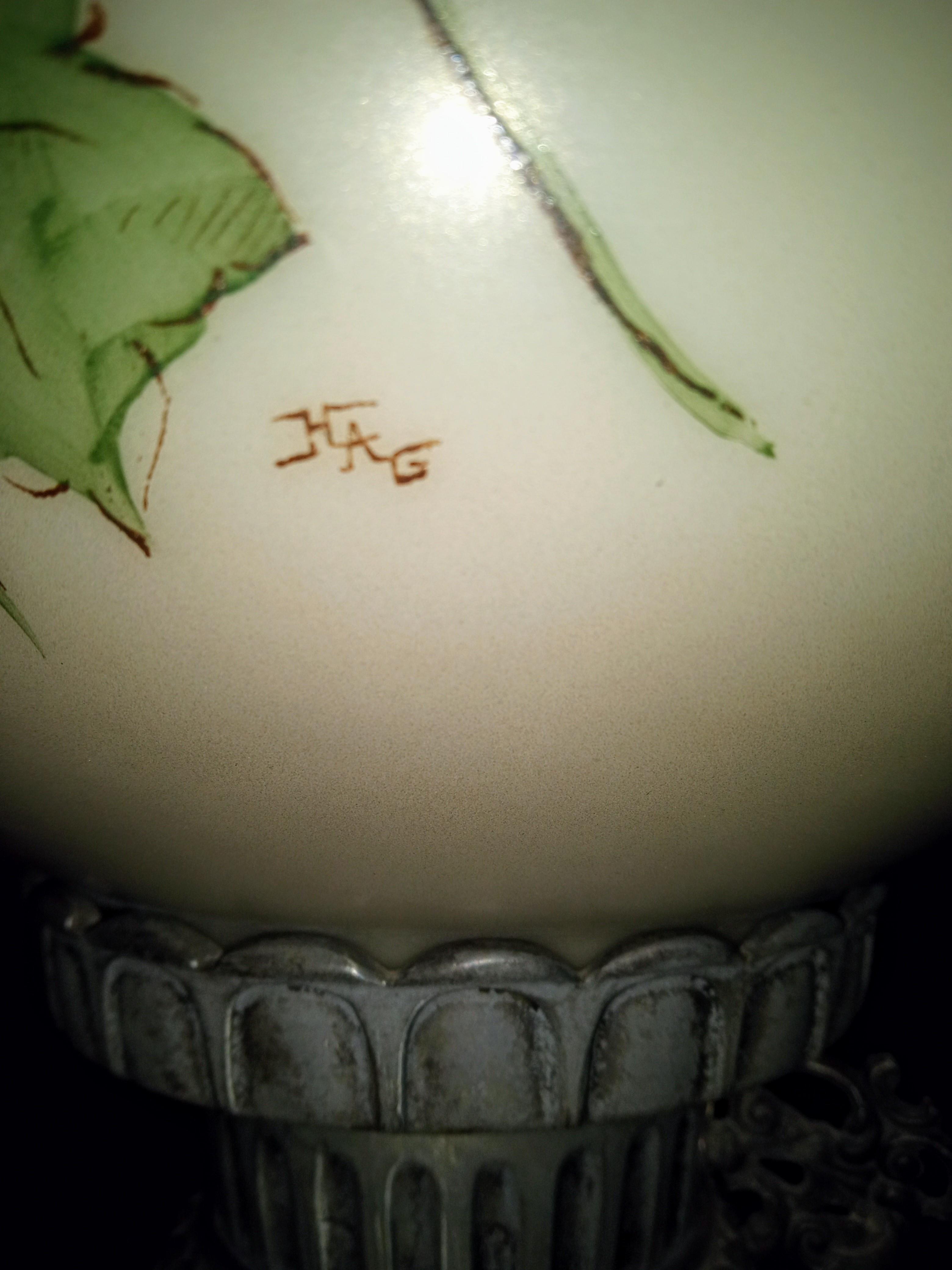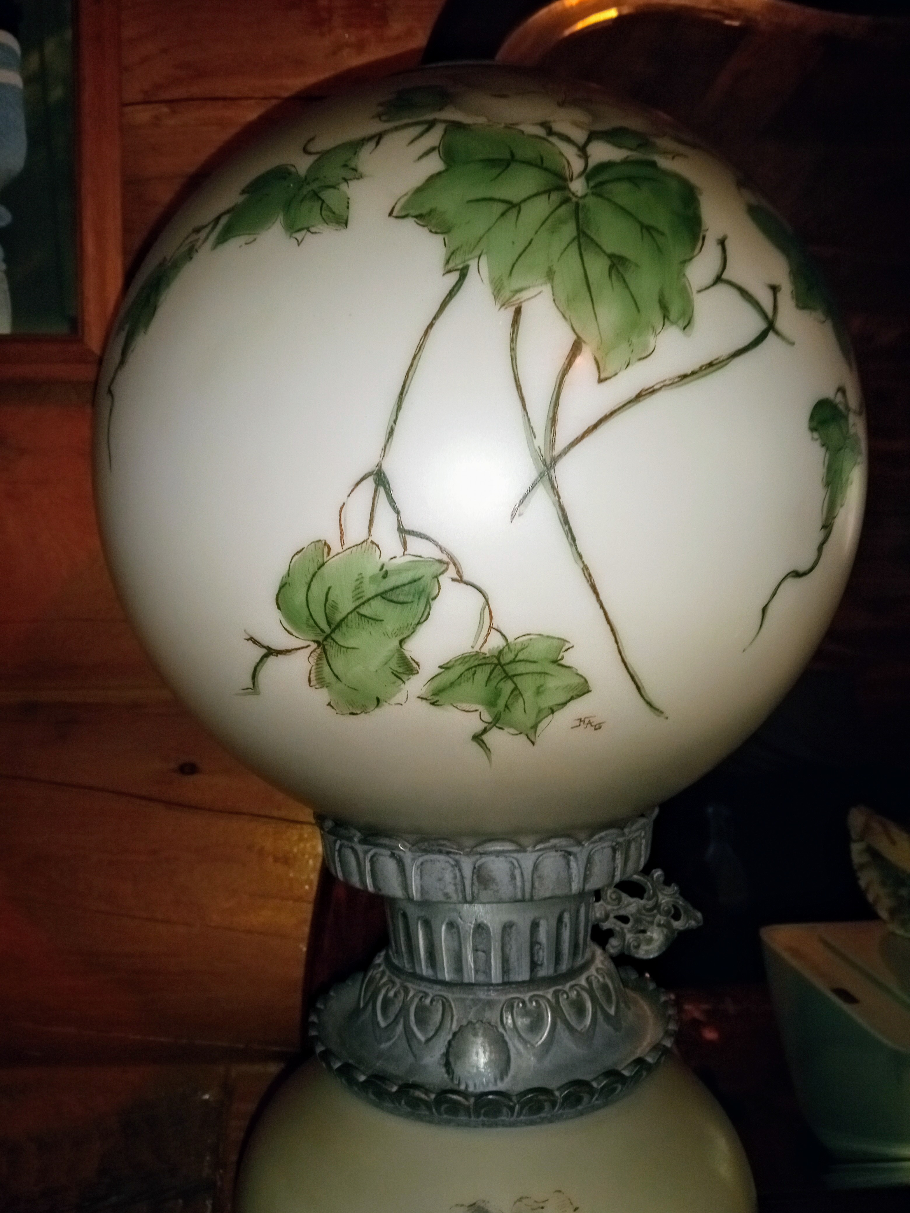 This lamp was a gift from my mother many years ago. I believe it began life as an oil lamp. Has three initials on the top glass piece, no other markings that i could find other than that I know very little about it. Thank you
