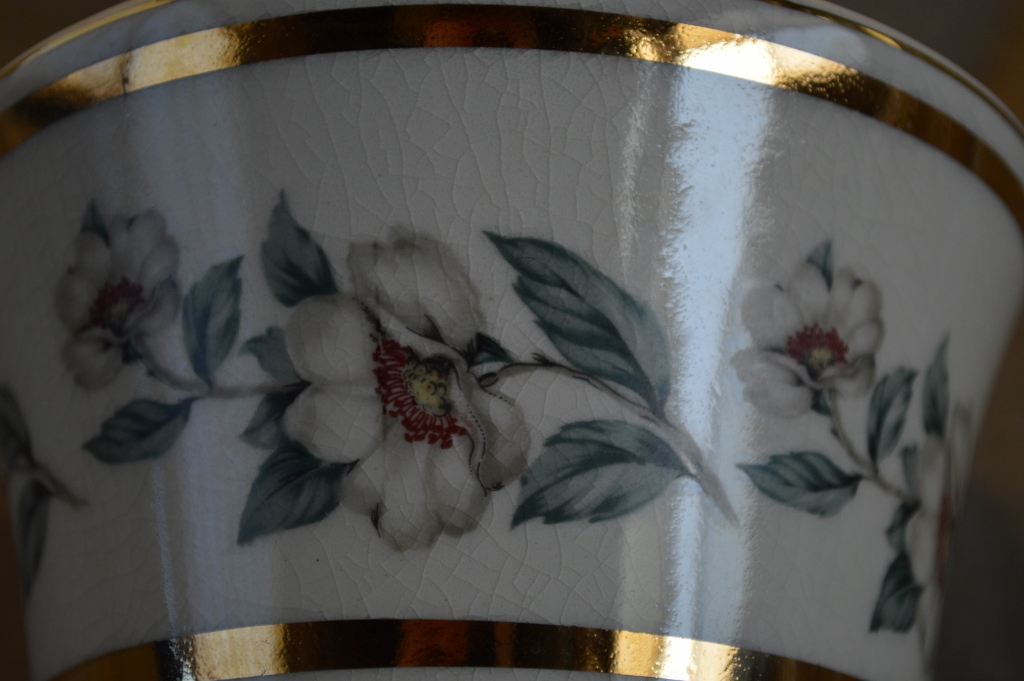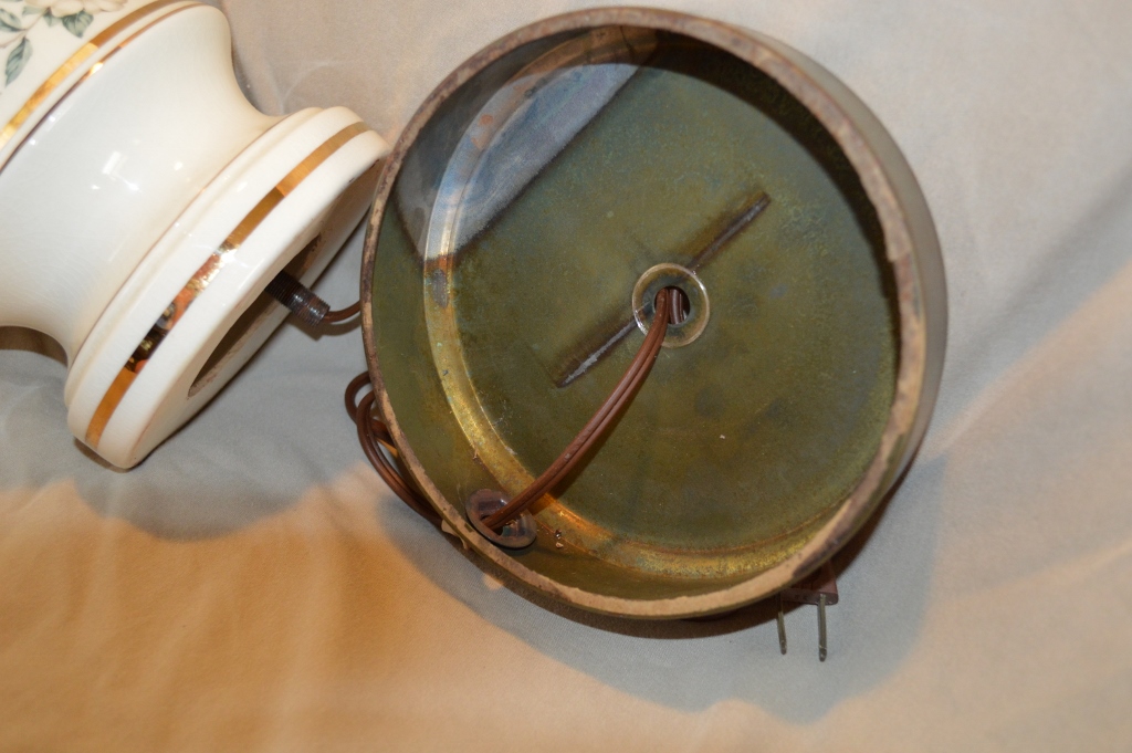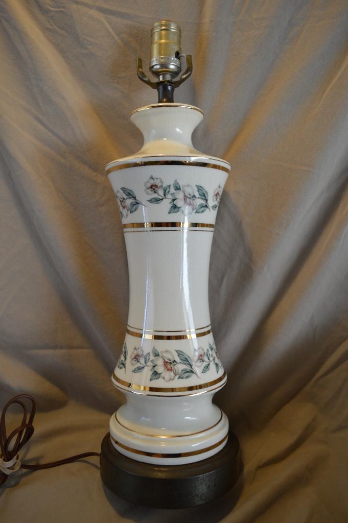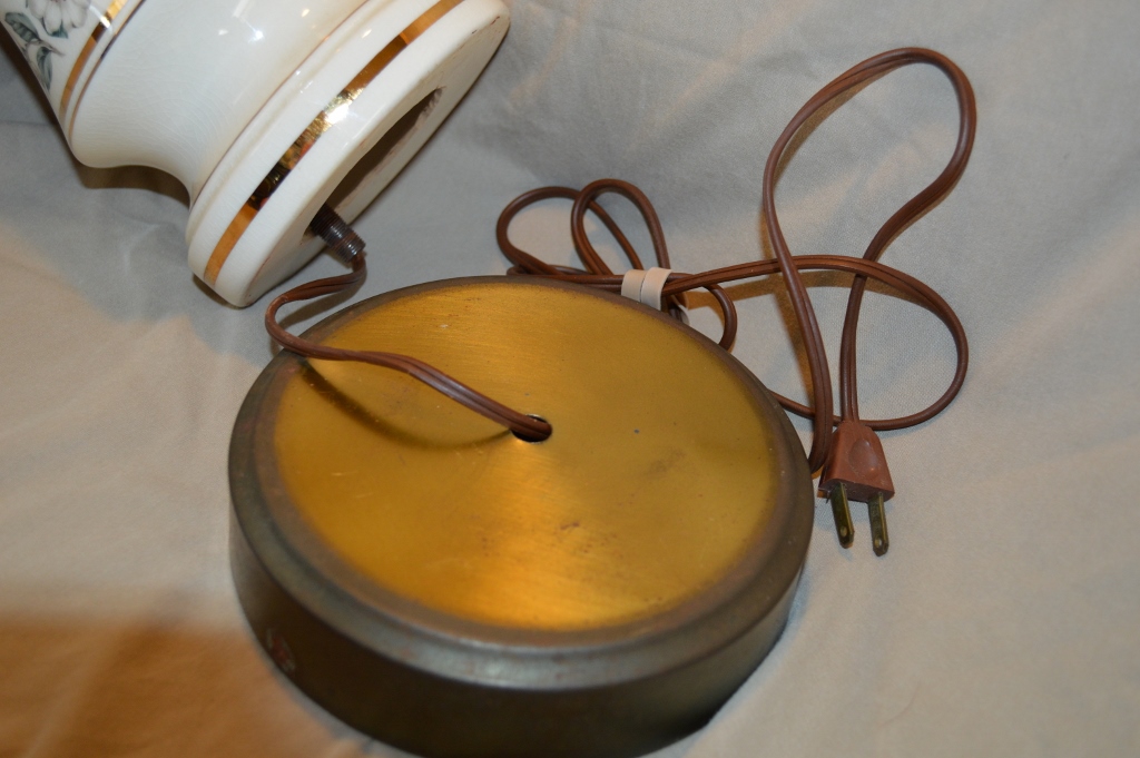 There are no markings on this lamp to give me any idea of who made it, when, where etc.  I am guessing that it is pre 1962 due to the electrical plug not being a polarized safety plug.  It appears to be hand painted, with a "cracked" finish design, and a gloss finish. It also appears to have gold trim.  I would appreciate if anyone has any information and estimate on value please let me know.  The lamp has a metal base and from bottom of base to top of lamp socket is approximately 19 inches tall.