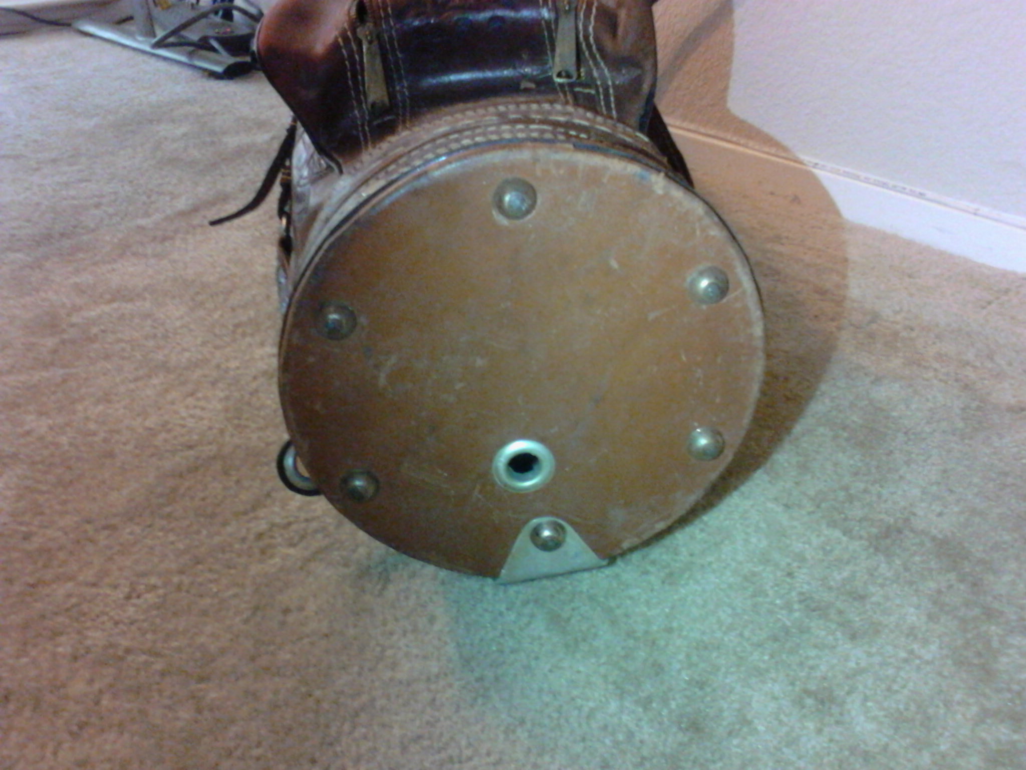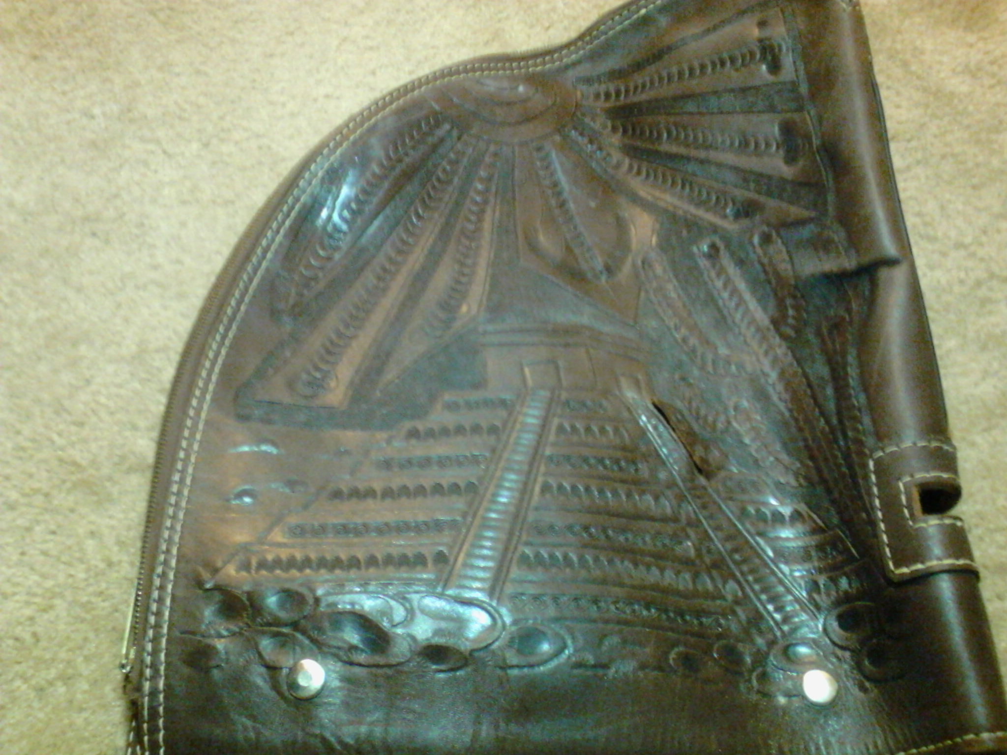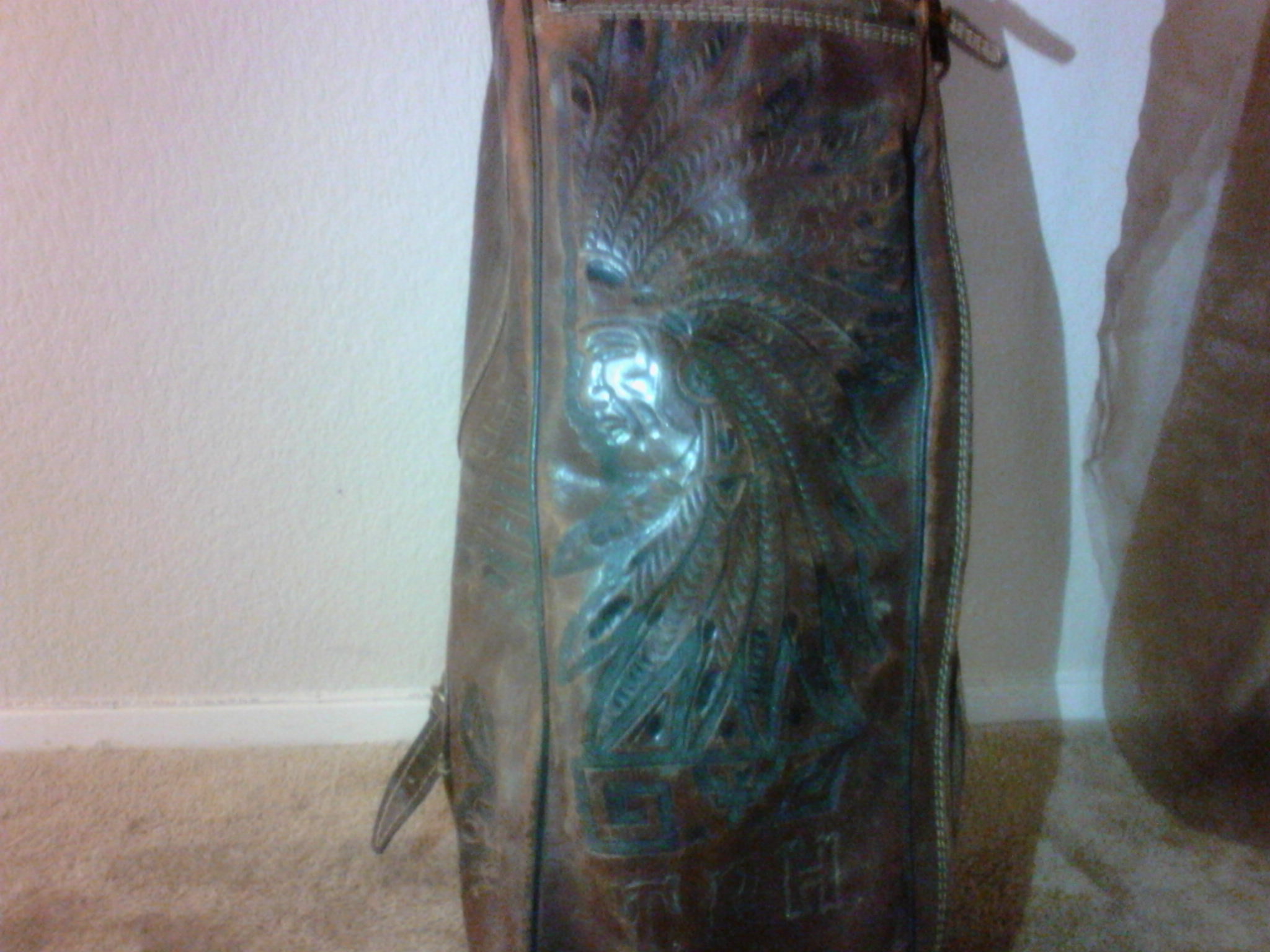 vintage leather golf bag with myan calendar and Indian cheif in headress