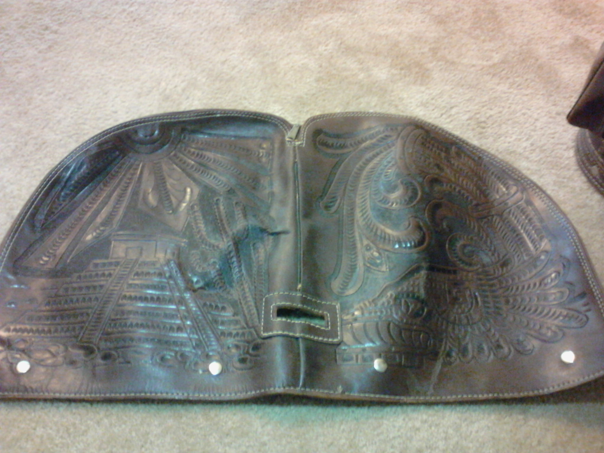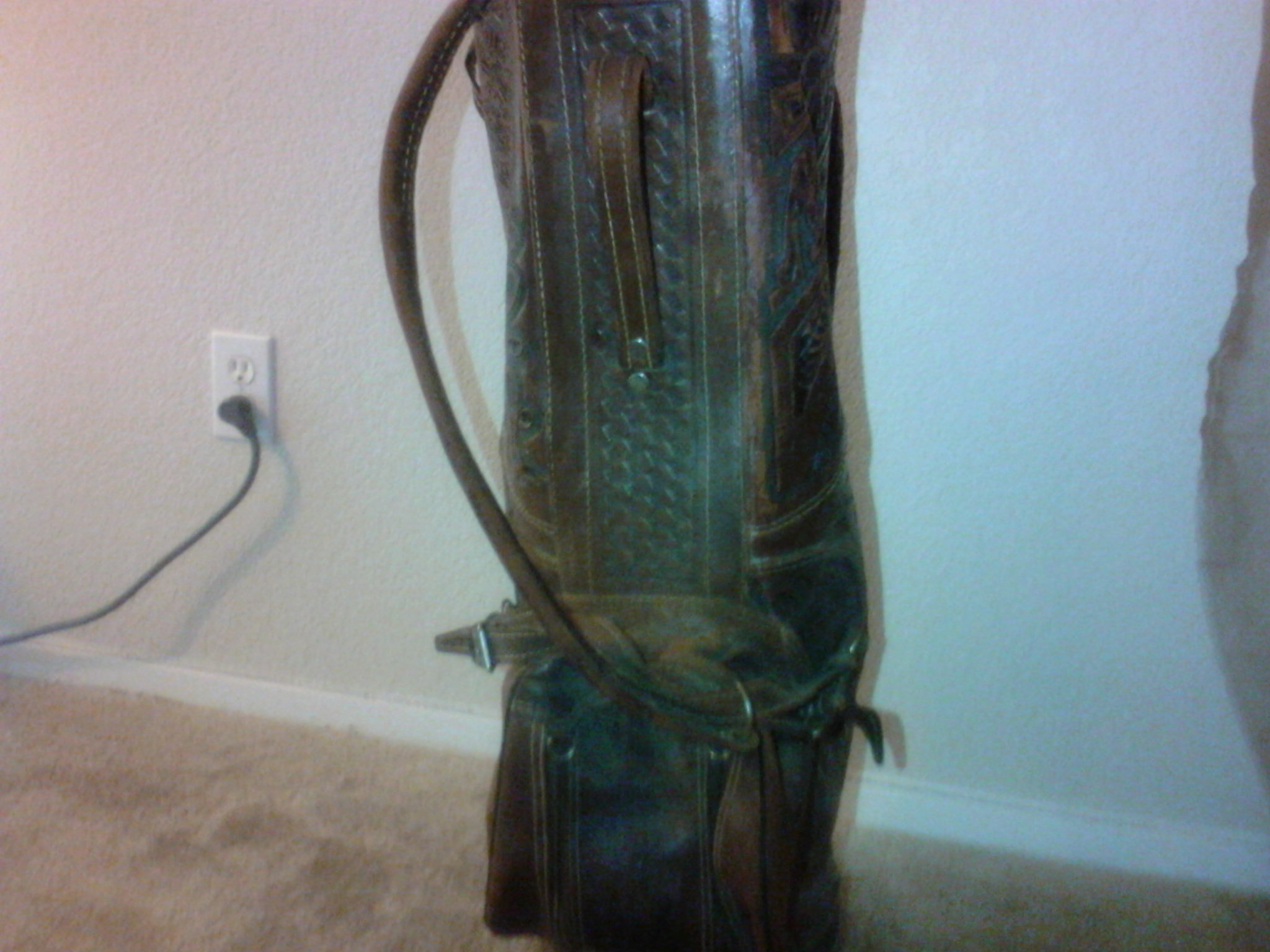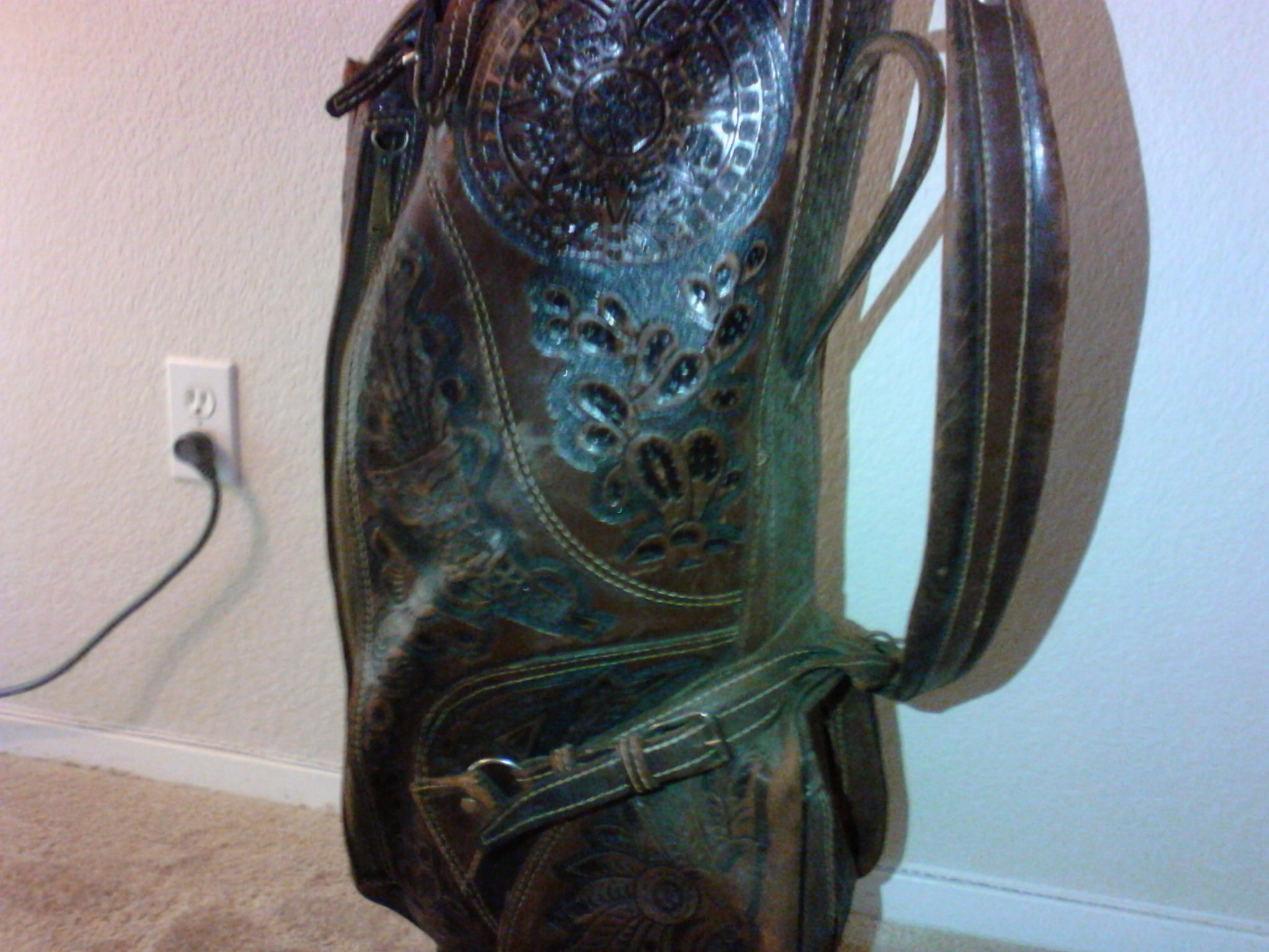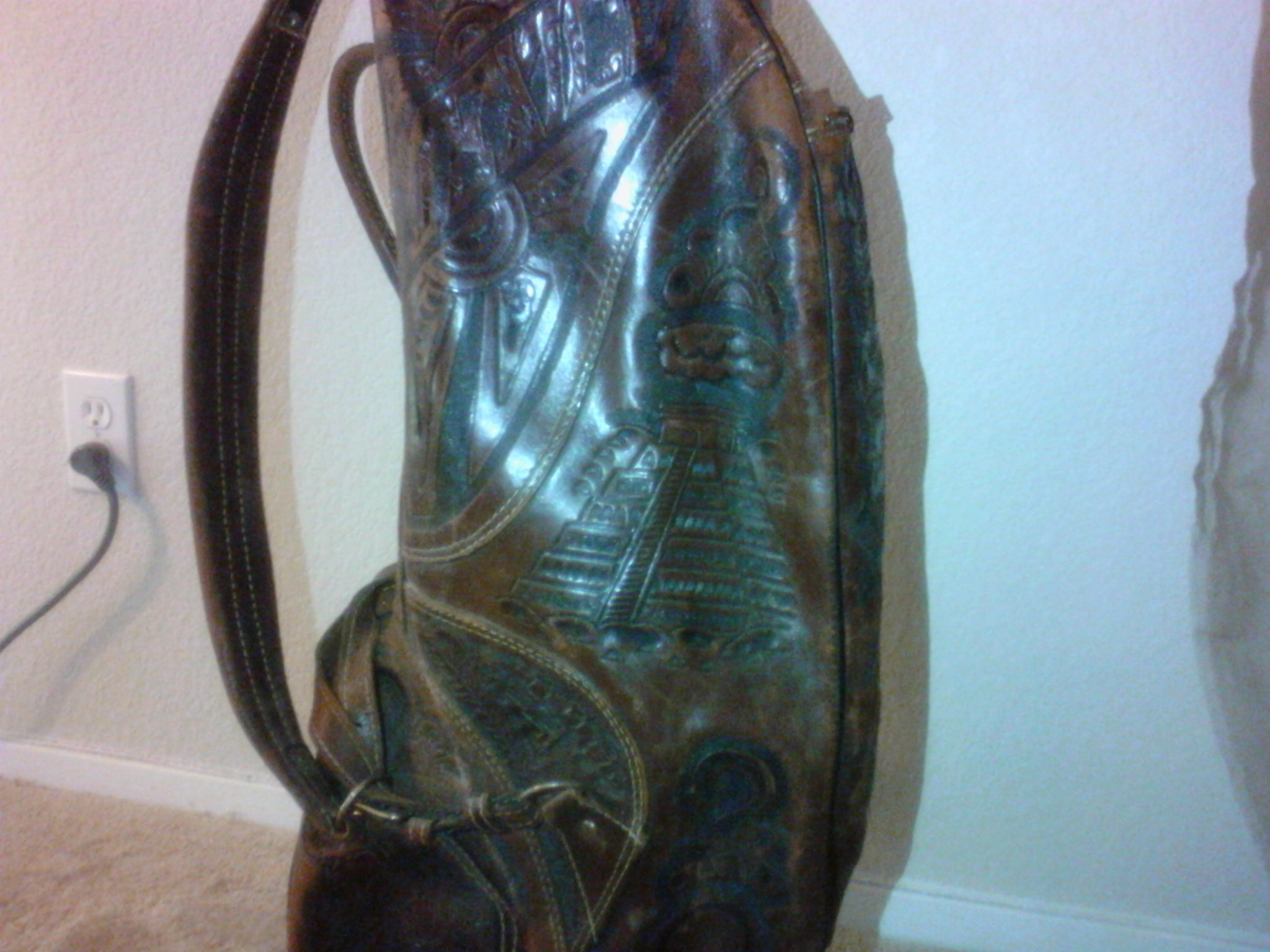 this is a vintage leather hand carved golf bag.overall good condition metal zippers all functioning. Leather hood has one small tear by where the art detail was made. I do know it has myan art on it. Temple pyramids, calendar, chief in headrests, ect. Wanting to know its value as I have seen a few online but the prices are speratic. Anyone have a clue?