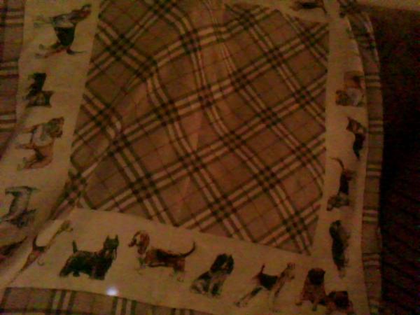 iteam is in mint condition. no rips, tears, or stains. like brand new. iteam is an authentic burberry silk scarf with medium sized show dogs around border. signature burberry plaid