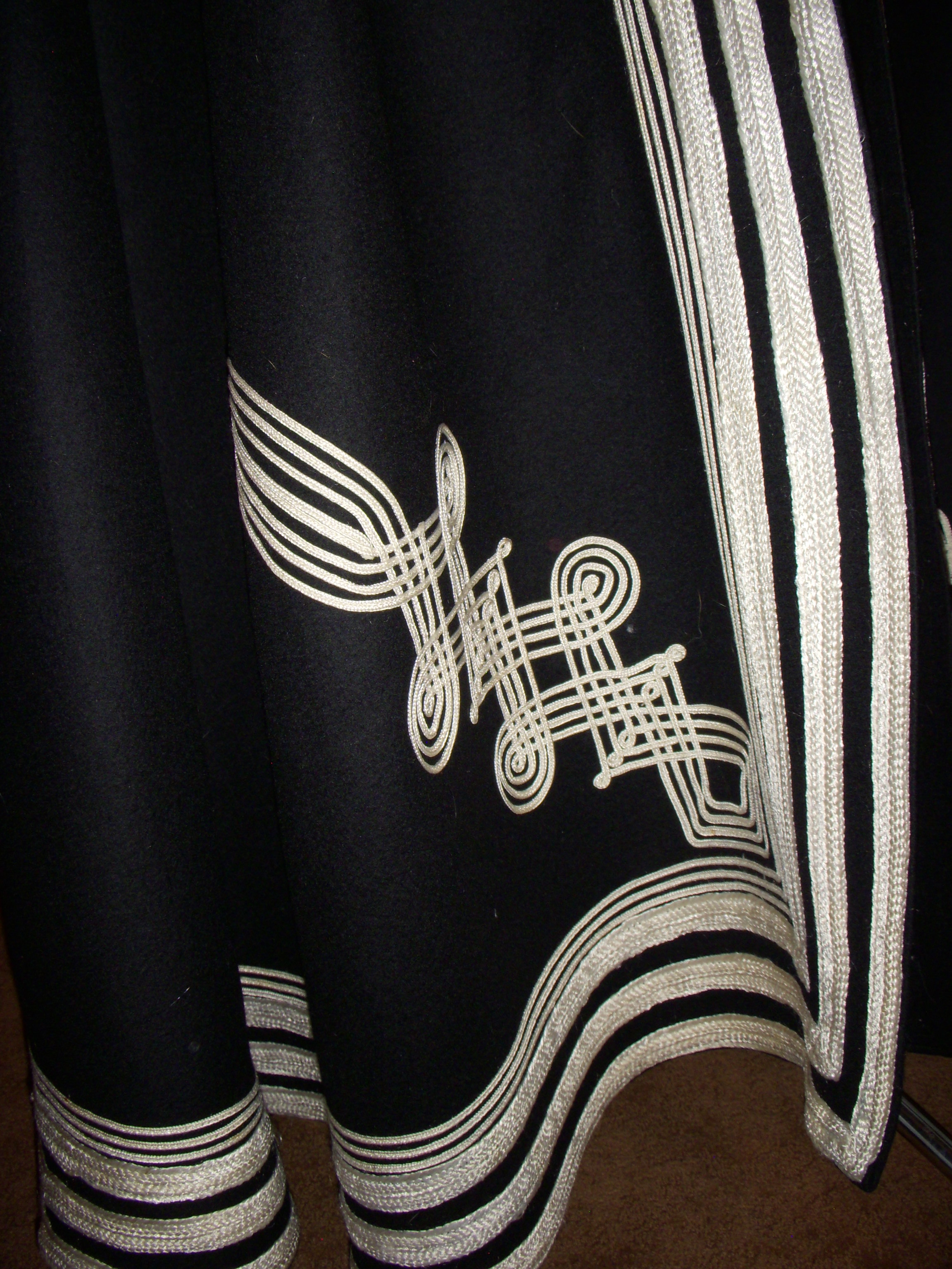 Note: Soutache trim (pronounced "soo-tash") is of Hungarian origin, meaning "a narrow flat decorative braid". I do not know what material the braid on this cape is made of. I believe it may be silk, but Soutache trim can be wool, silk, rayon, etc.