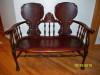 Love seat is upholstered camel back. underside of seat is wood box type. seat is removable showing a simple wooden frame structure.  can someone help me with era and value. I have two of these.