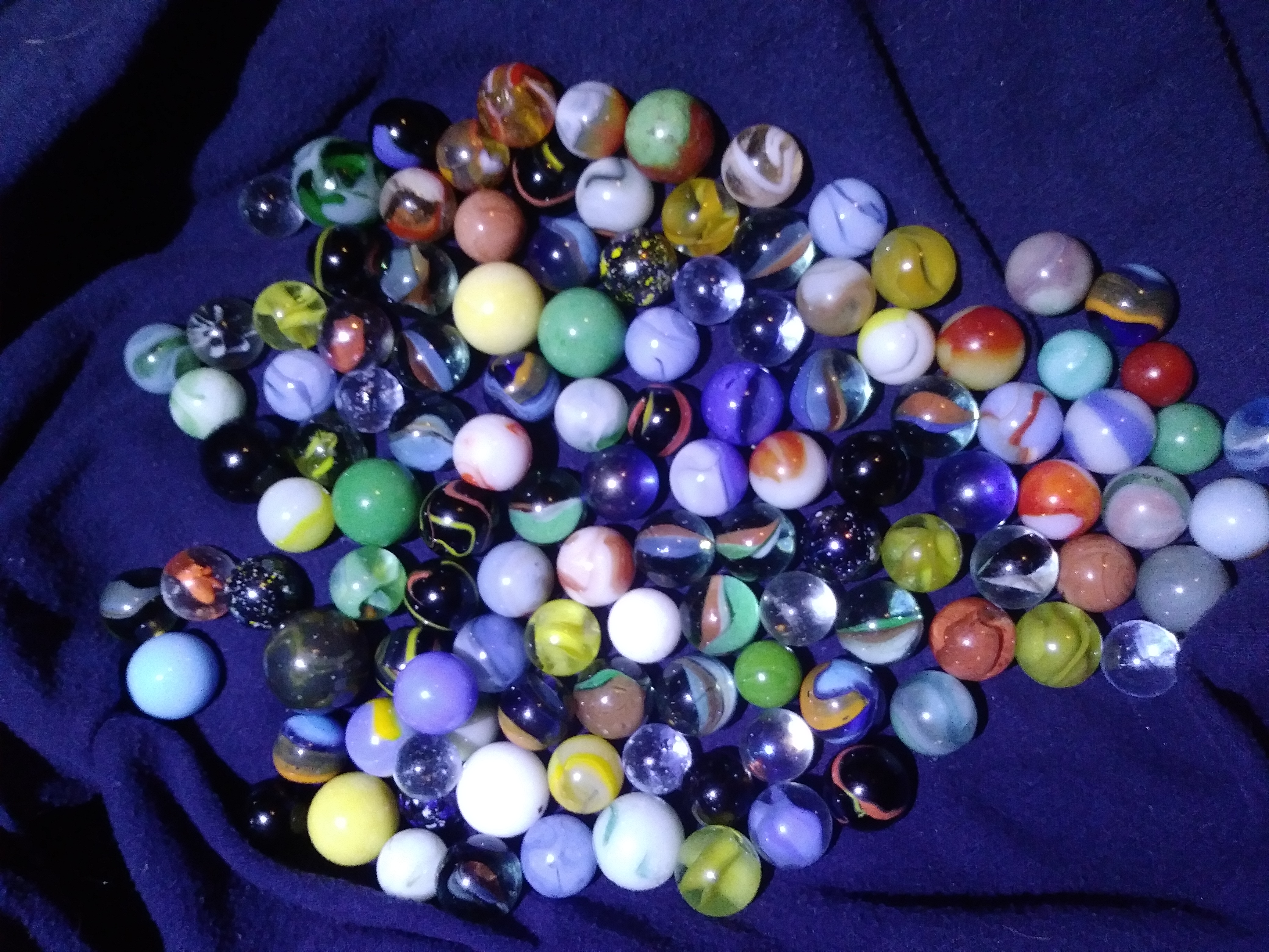 Description Vintage marbles from around 1920s. Hand blown glass in nany colors and styles including but not limited to, ,2,3,&4 color swirls, cats eyes, and uranium glass. Would live to get as much info as possible.