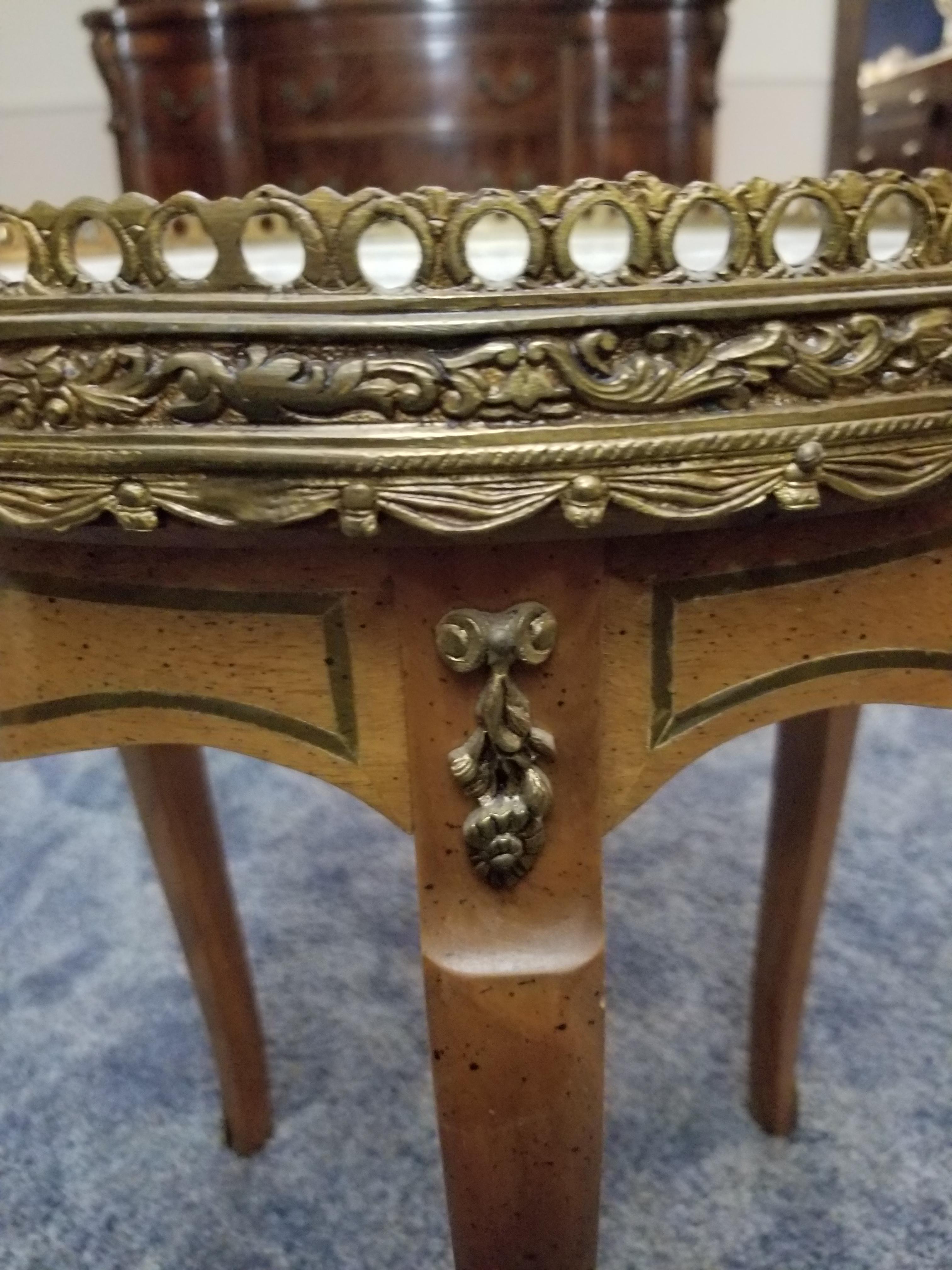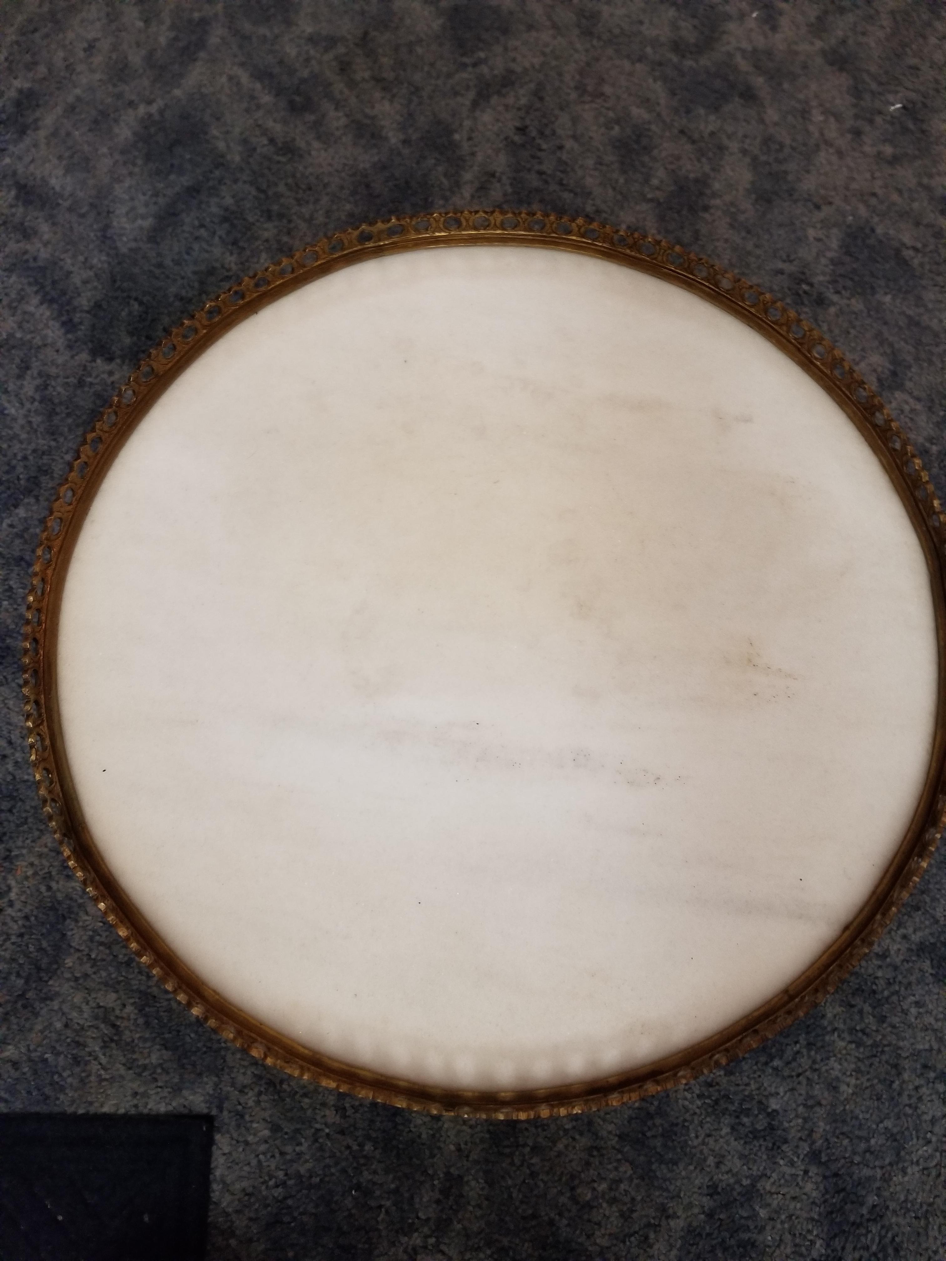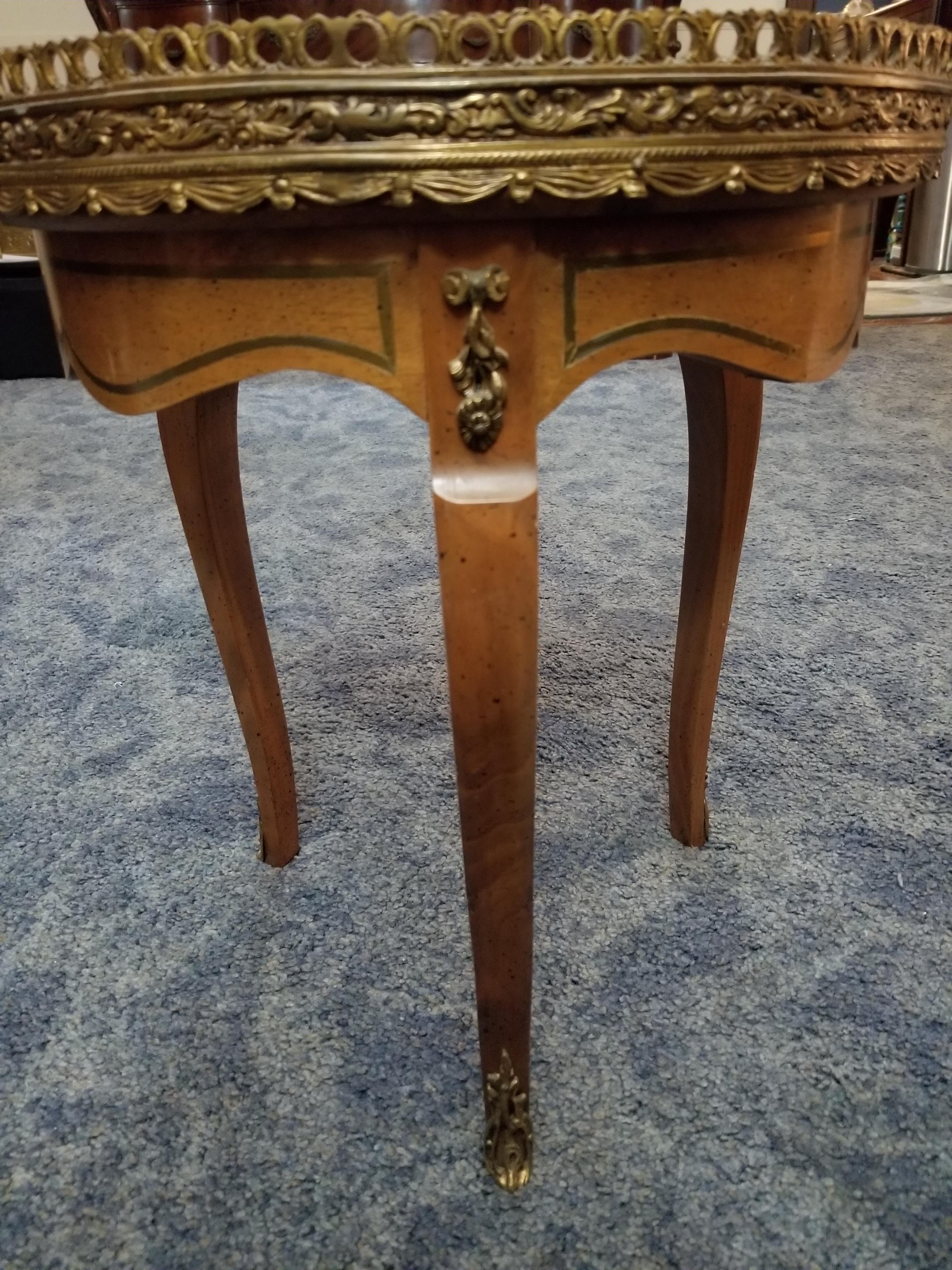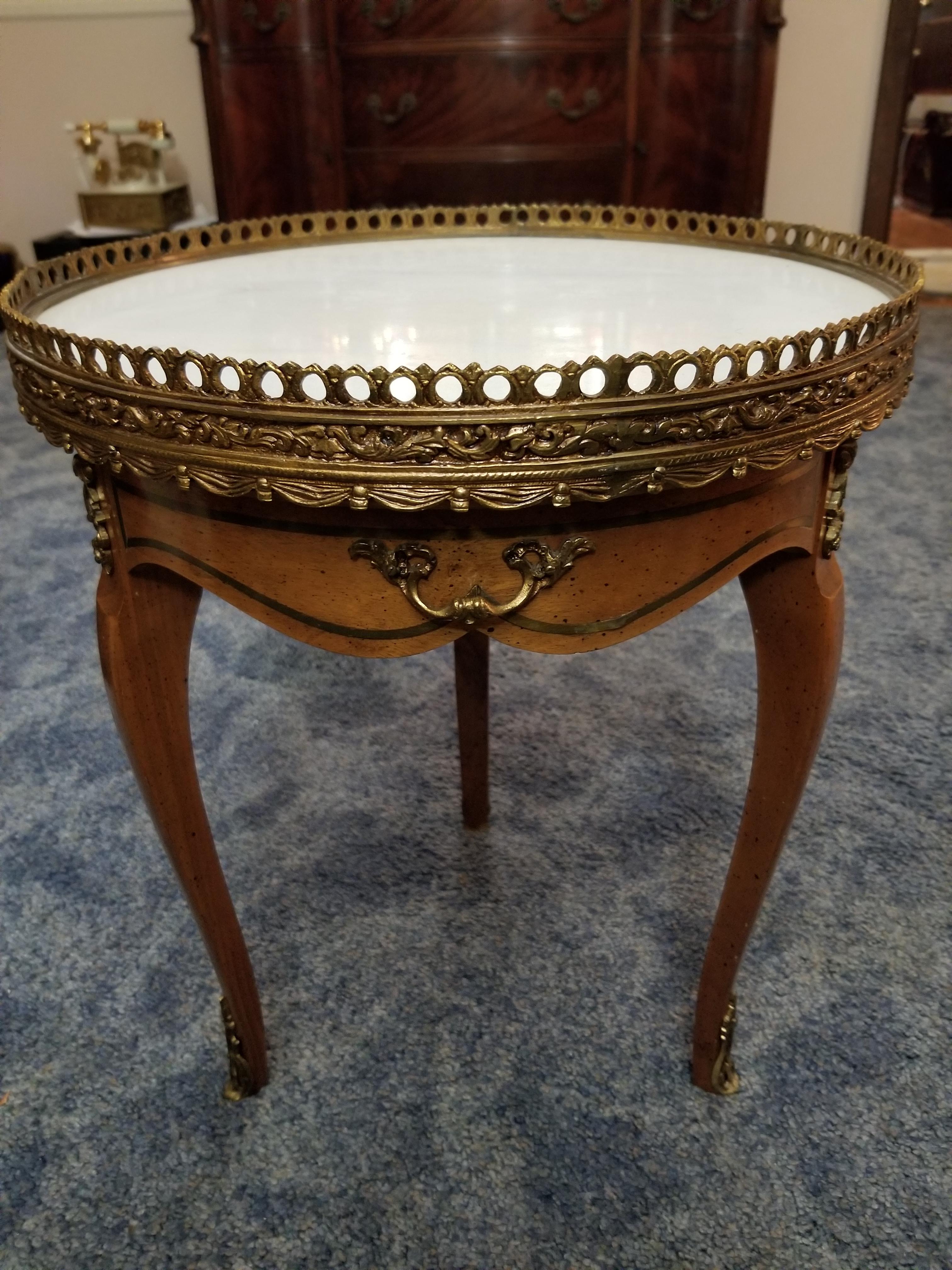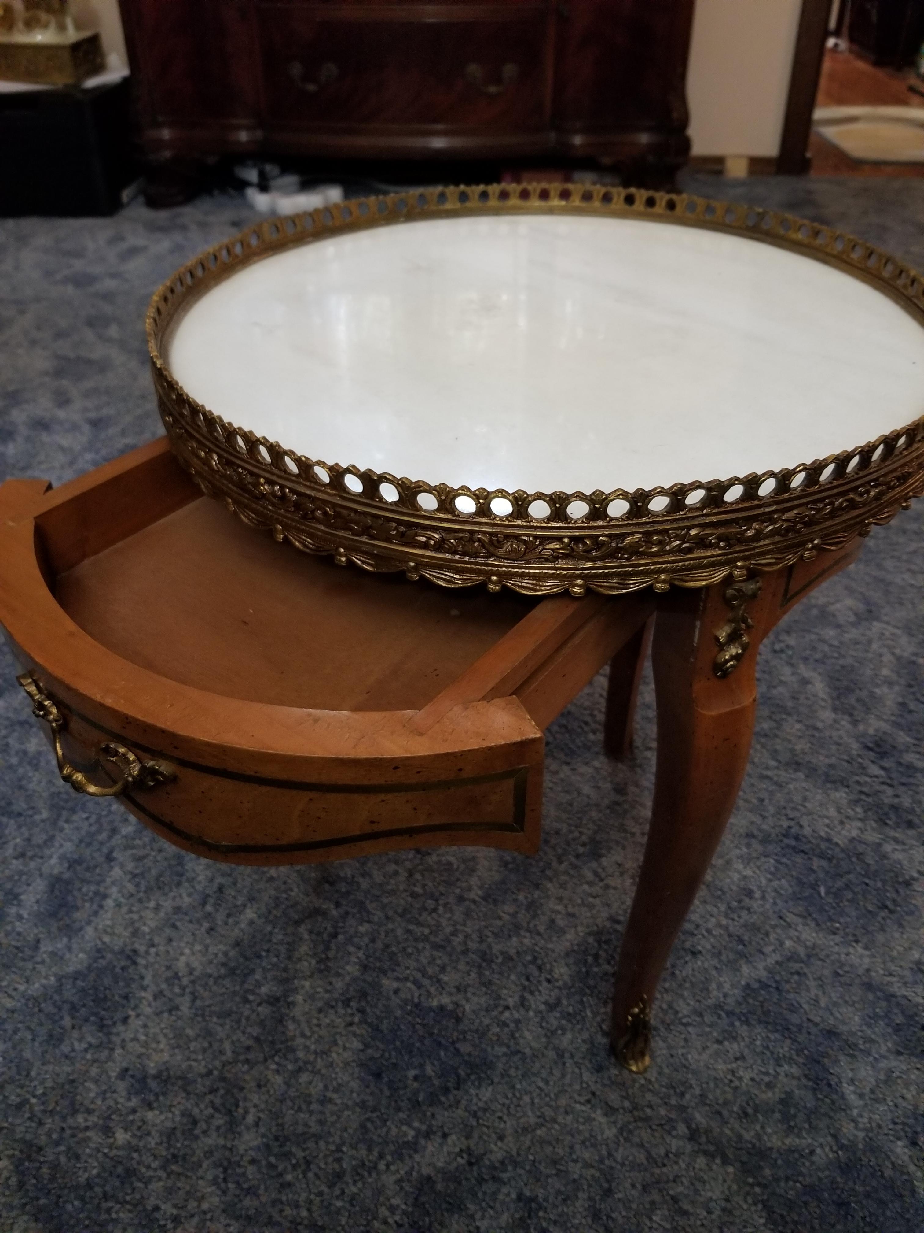 3-legged marble top table with pierced metal gallery above a paneled frieze. Includes a small drawer. Table is approx 16" diameter and 18" tall from foot to table top. Metal tag attached "Made in Spain". Metal accents fastened to the legs at feet and upper connections. Reminds me of a miniature French bouillotte table. Thank you for your time & comments.