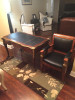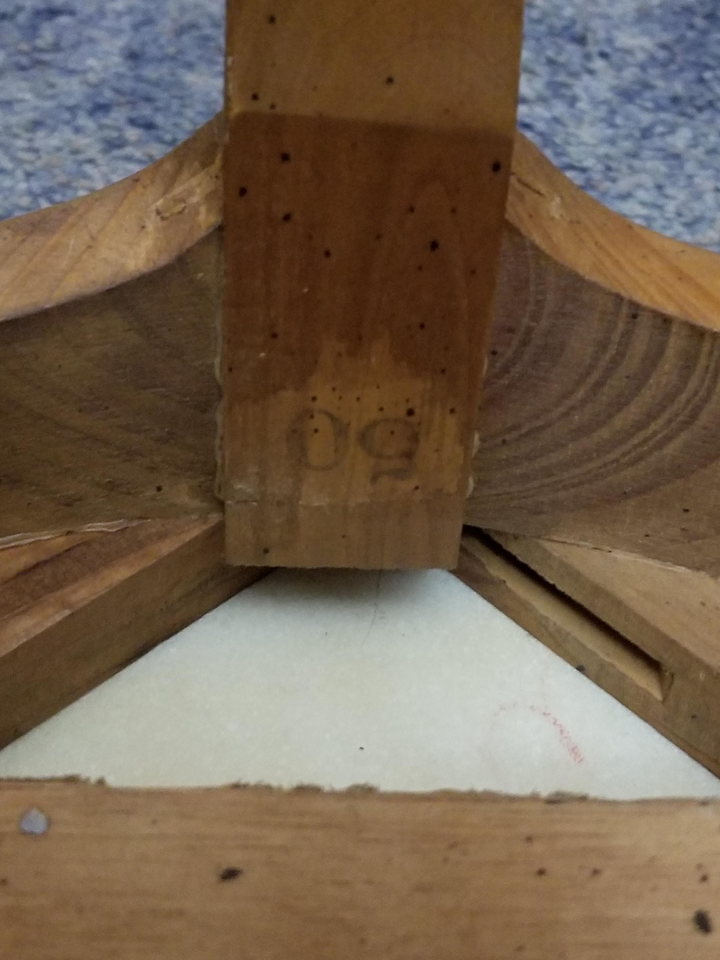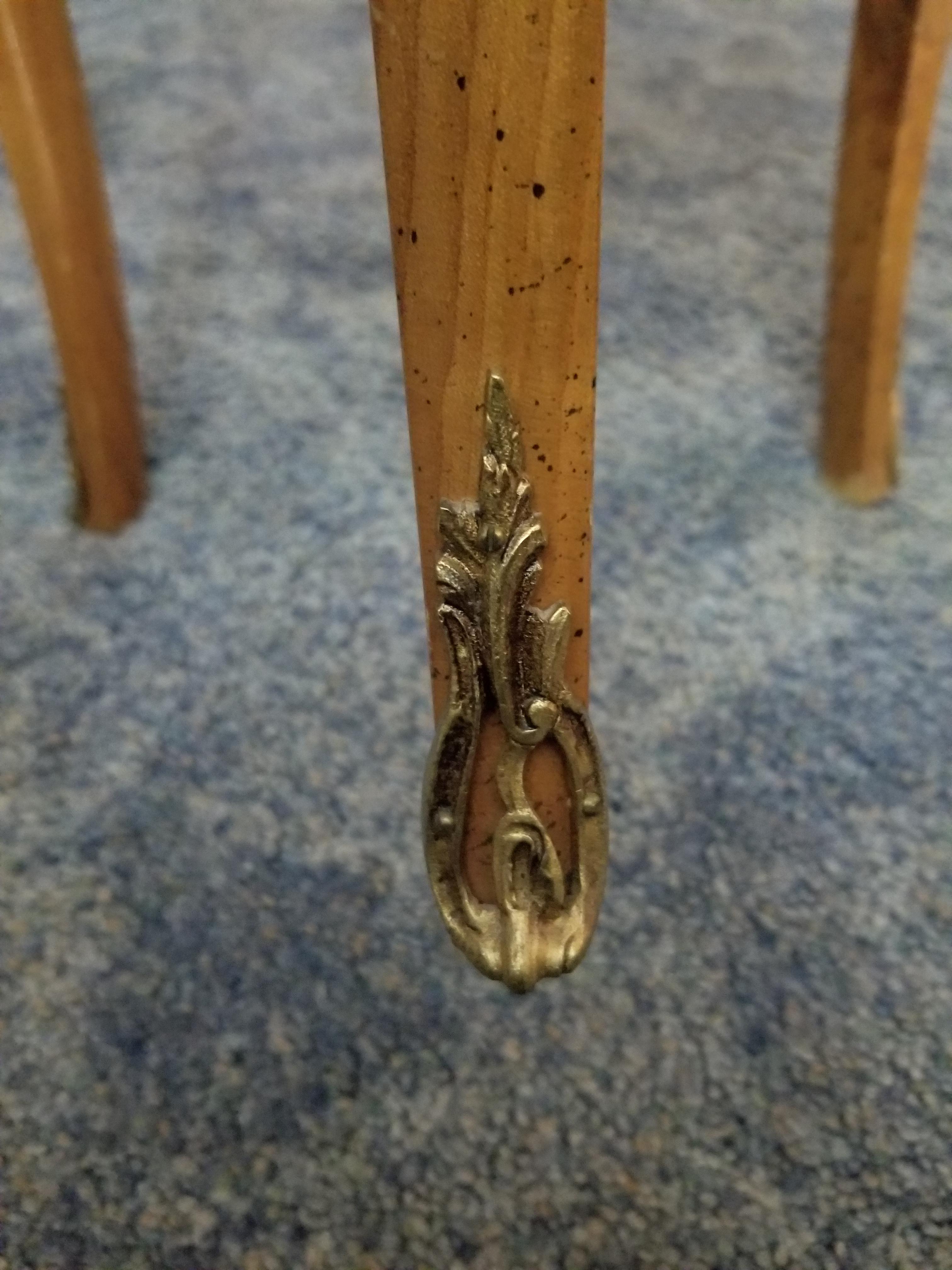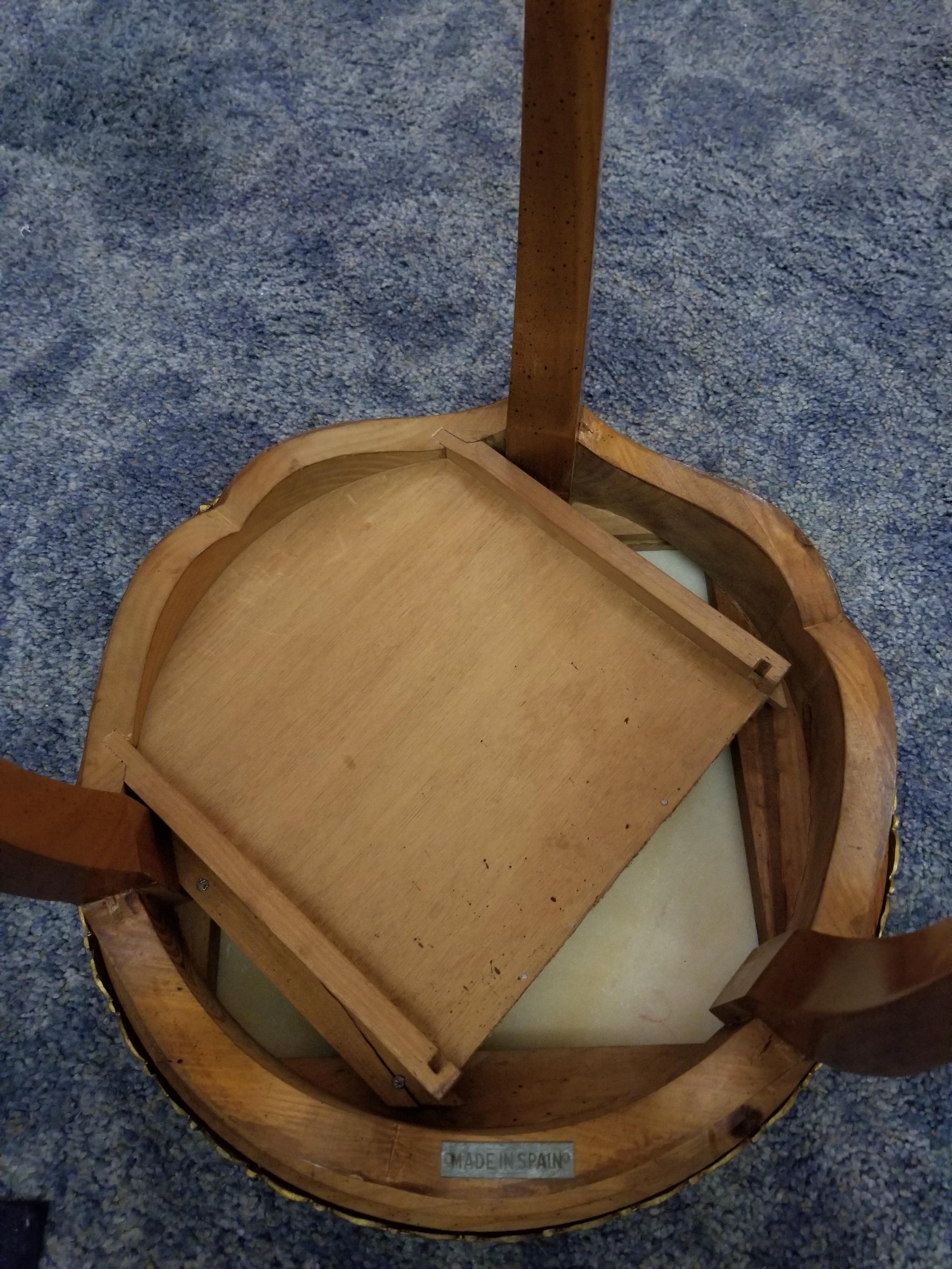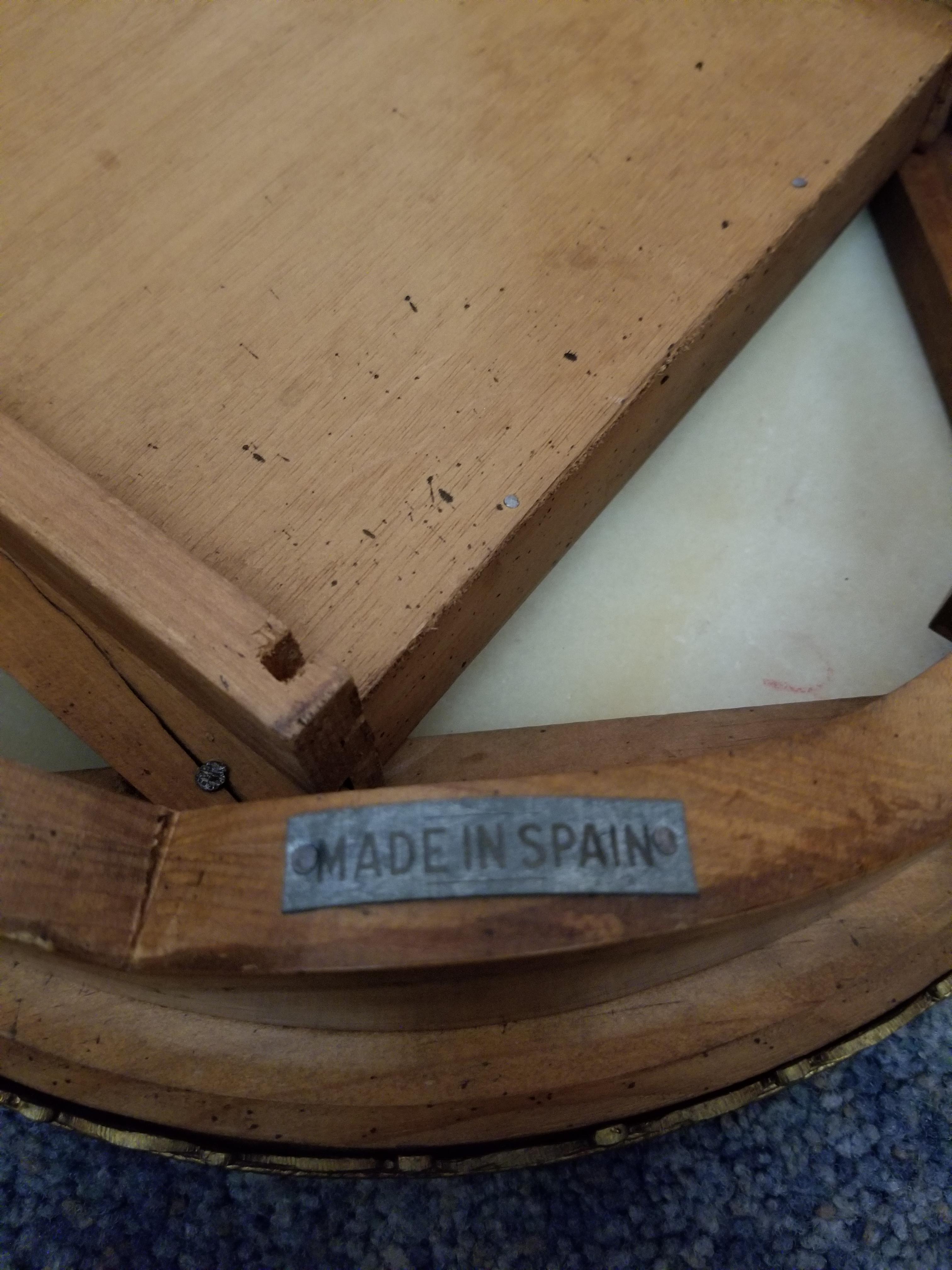 3-legged marble top table with pierced metal gallery above a paneled frieze. Includes a small drawer. Table is approx 16" diameter and 18" tall from foot to table top. Metal tag attached "Made in Spain". Metal accents fastened to the legs at feet and upper connections. Reminds me of a miniature French bouillotte table. Thank you for your time & comments.