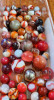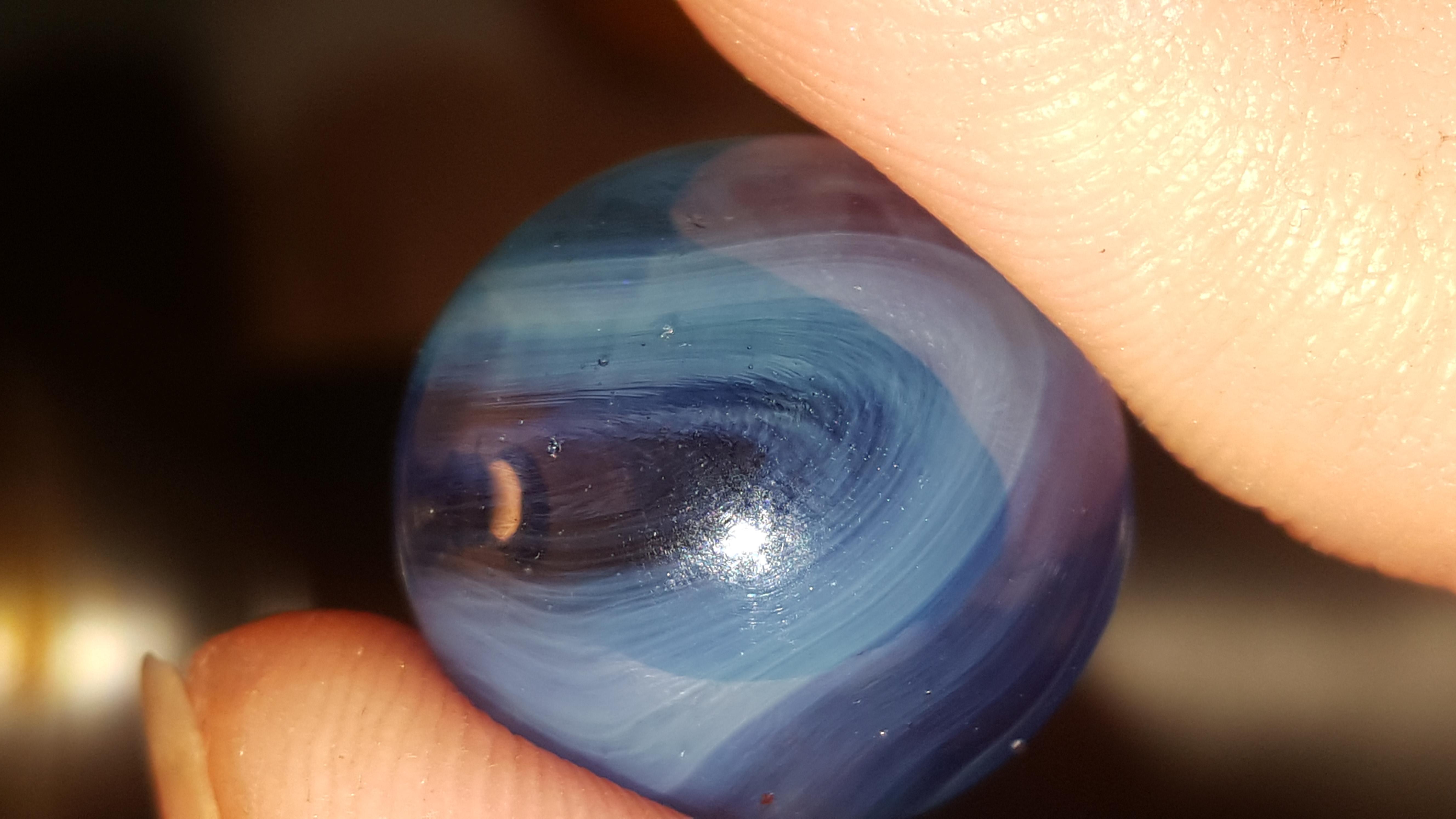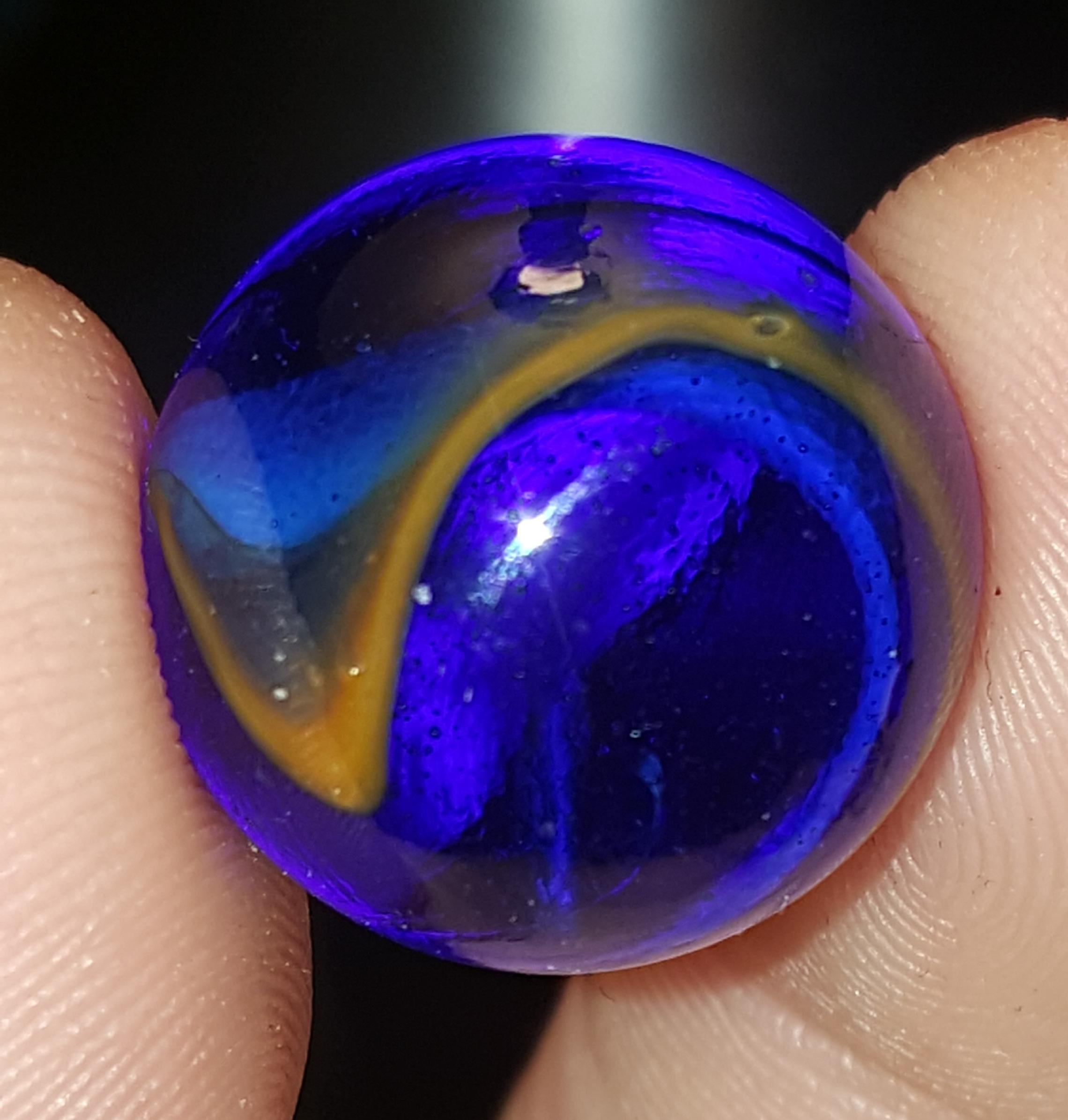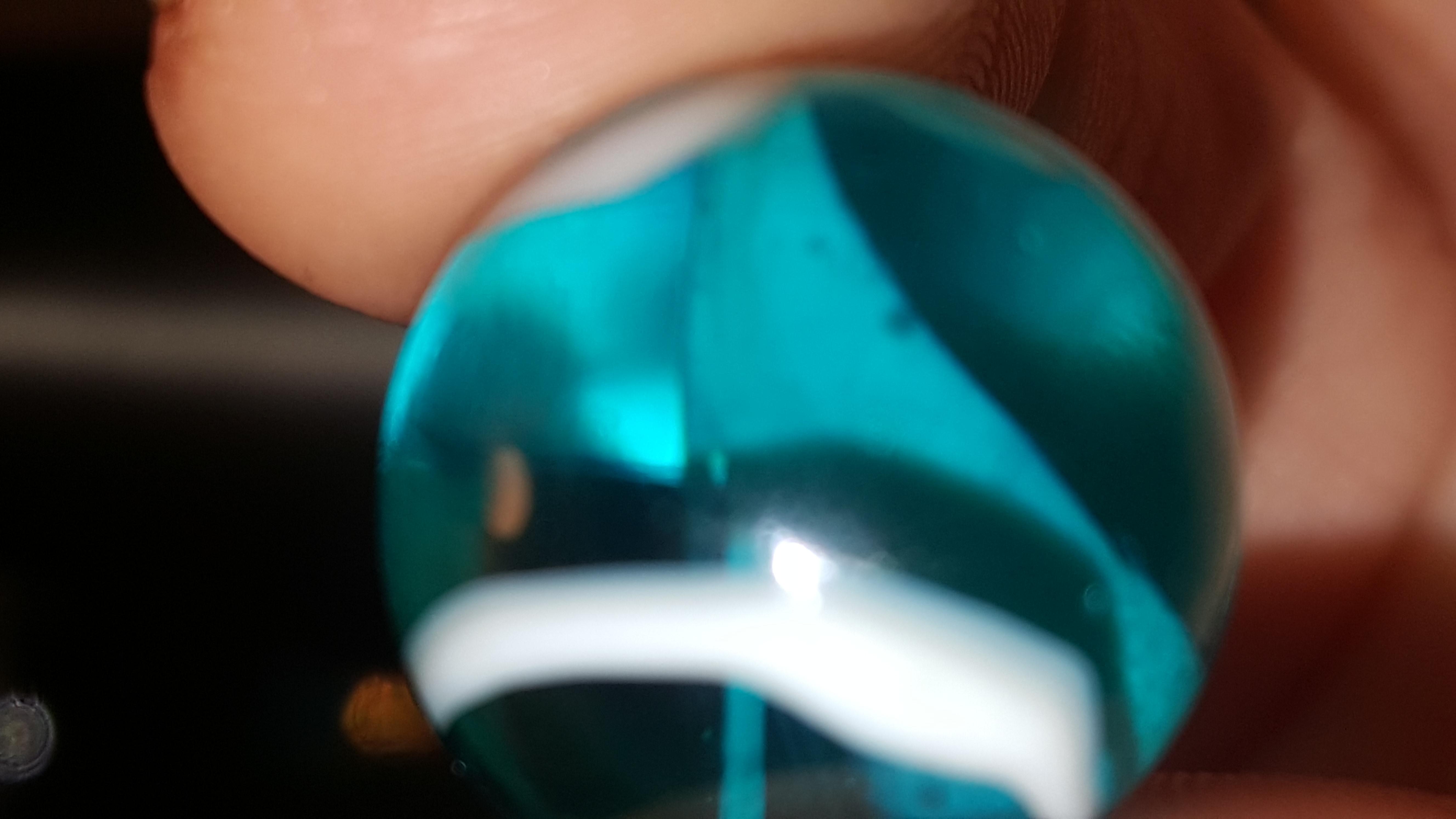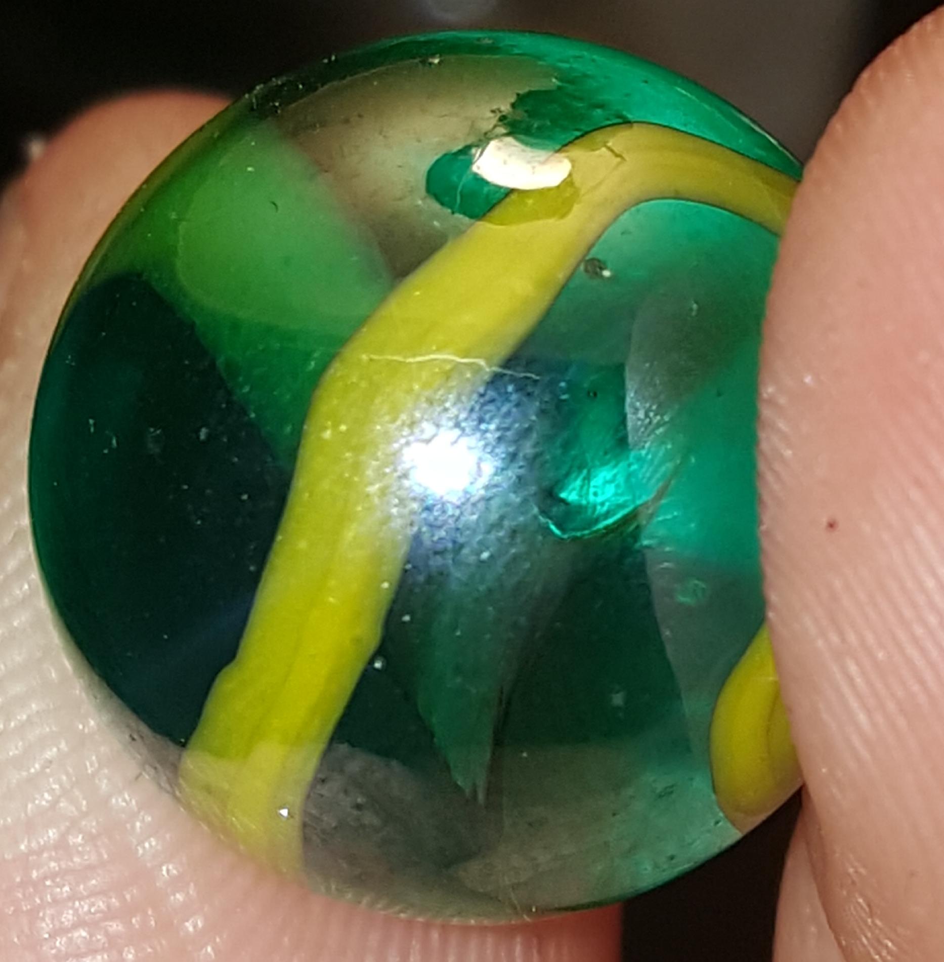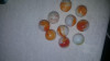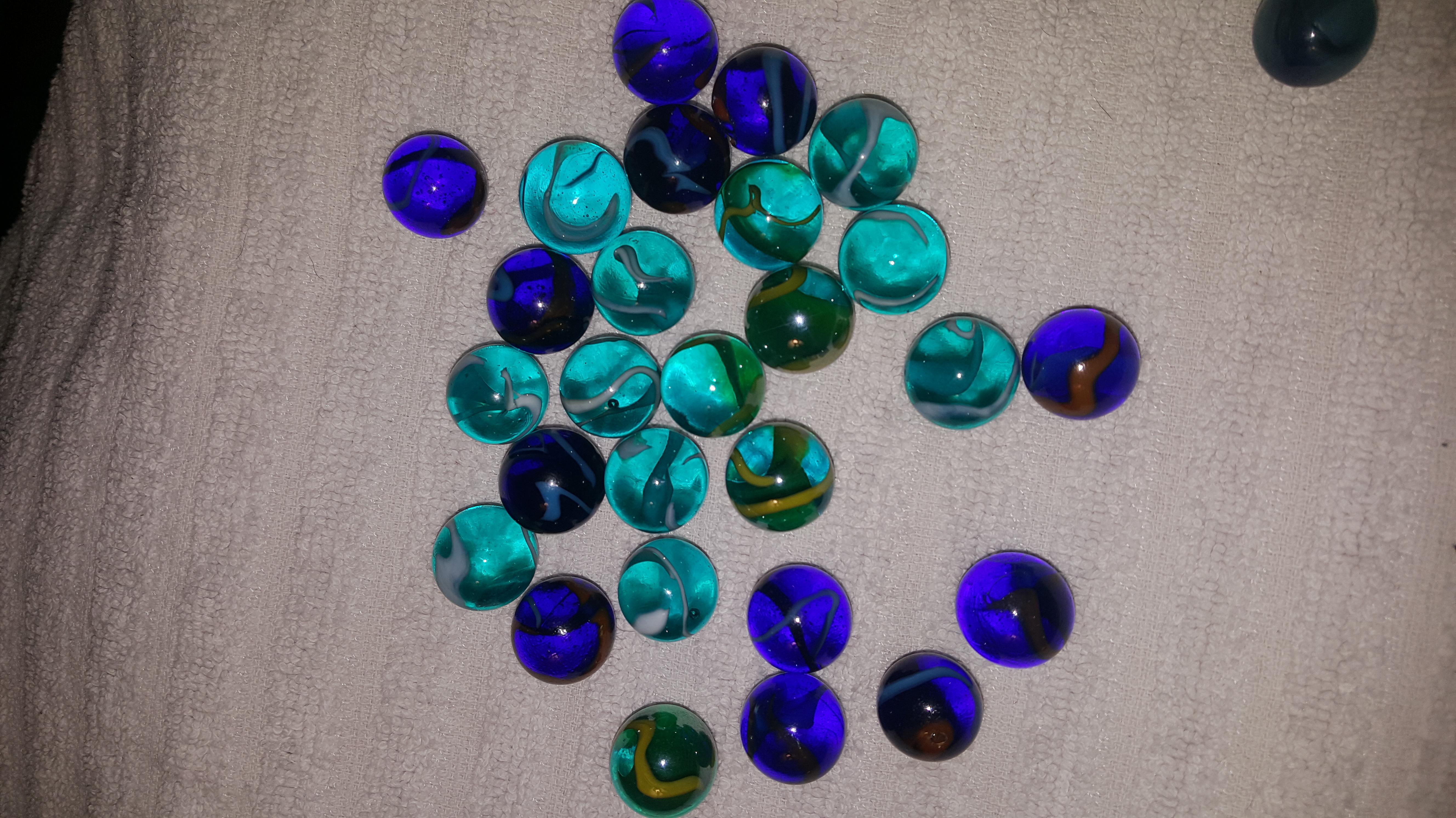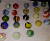 these are newer than 1980 marbles. the green and yellow almost looks like a snake much like a corckscrew the color spins around. it wasnt an intentional one like the acro marbles made for the colors to spin around all the time the way they were made. the snake looking one might bring a little more because of the nice swirl. 50c-3$ the blue and red+(white) or green and yellow ones with nice color near the surface. can bring 15c-50c . the 2 nicest colored ones of these might even bring 1$ each . the white an aqua ones might bring 5-25C each