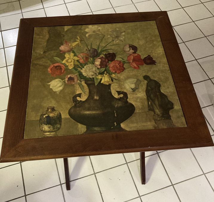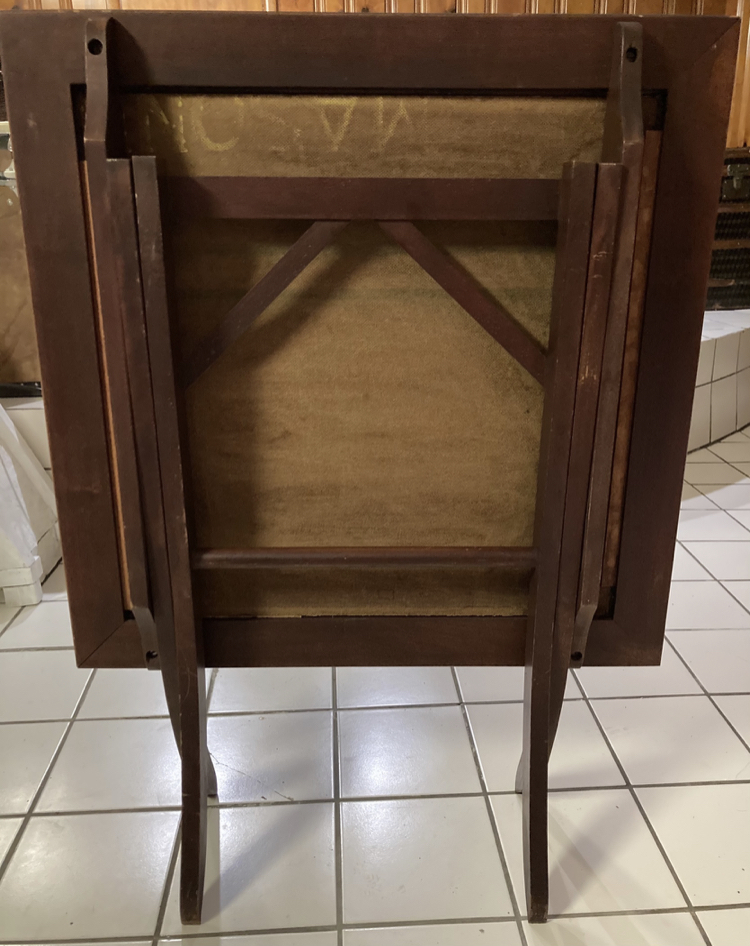 Masonite folding bridge table (variously called a card or seeing table too). Measures 27x27” across and 28” high when opened flat. The image is a 1940s lithograph. I’ve found a few similar ones with varying prices for sale online but wonder if anyone knows a more specific or accurate value range.