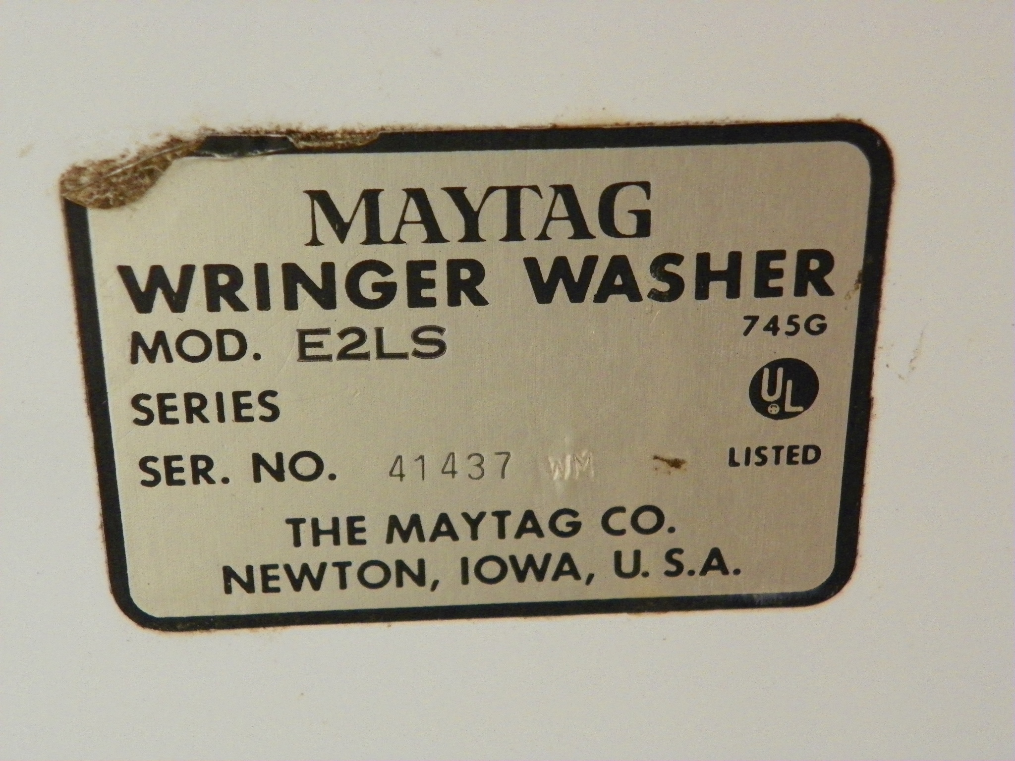 Maytag Wringer Washer, excellent used condition, both washer and wringer work.Model E2LS serial # 41437 WM  from The Maytag Company in Newton, Iowa USA.  I think it's a model from the late 40's.
