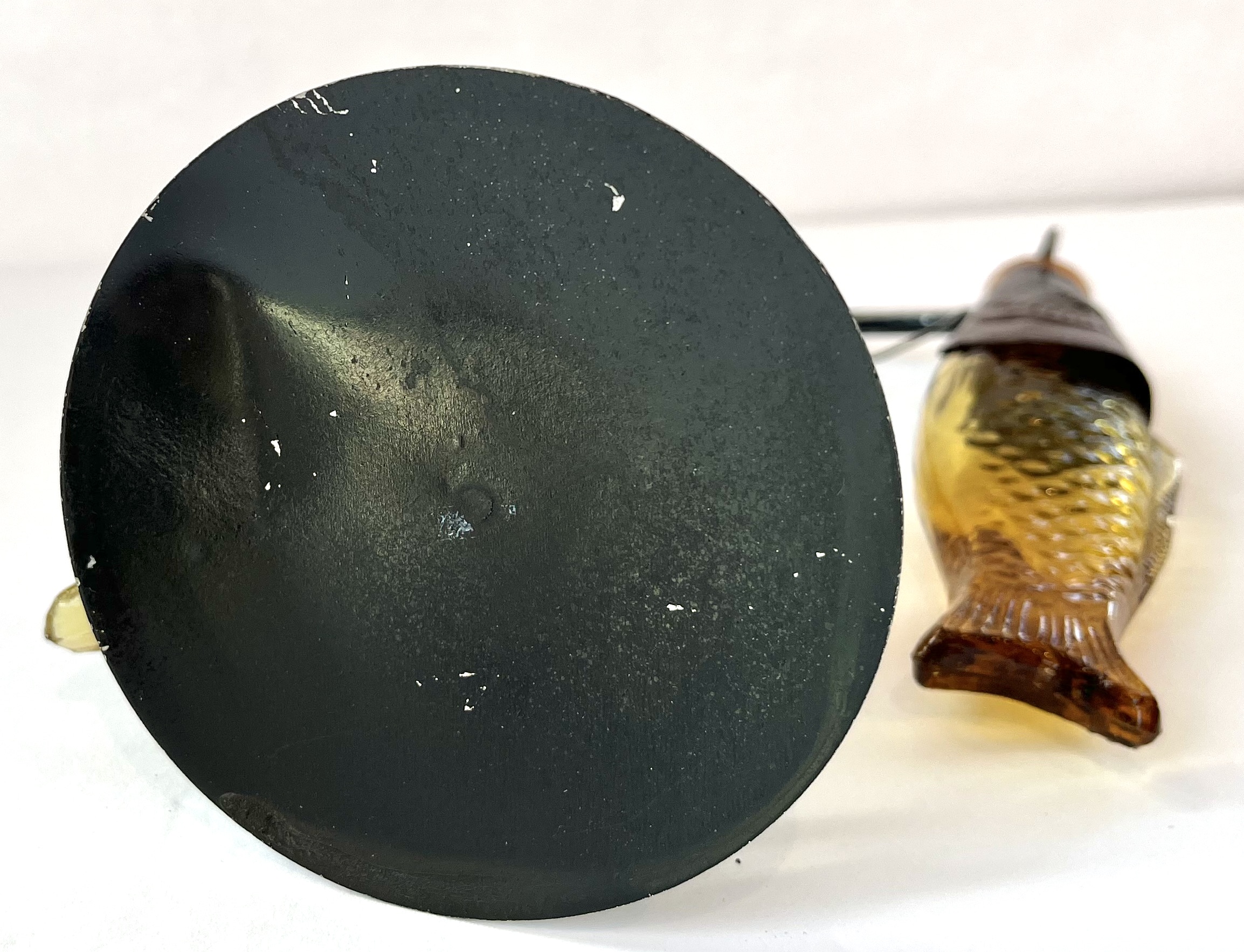 These amber glass fish have a carved brown metal head with an amber glass body. The patina on the heads has turned a bit turquoise in a few places suggesting they are made of copper. The tree stand is a painted black metal with a very slight bend in the bottom of the stand on the underside. The fishing net and other decorative elements are intact. This is a beautiful piece of art work that would be enjoyed by any fishing enthusiast.