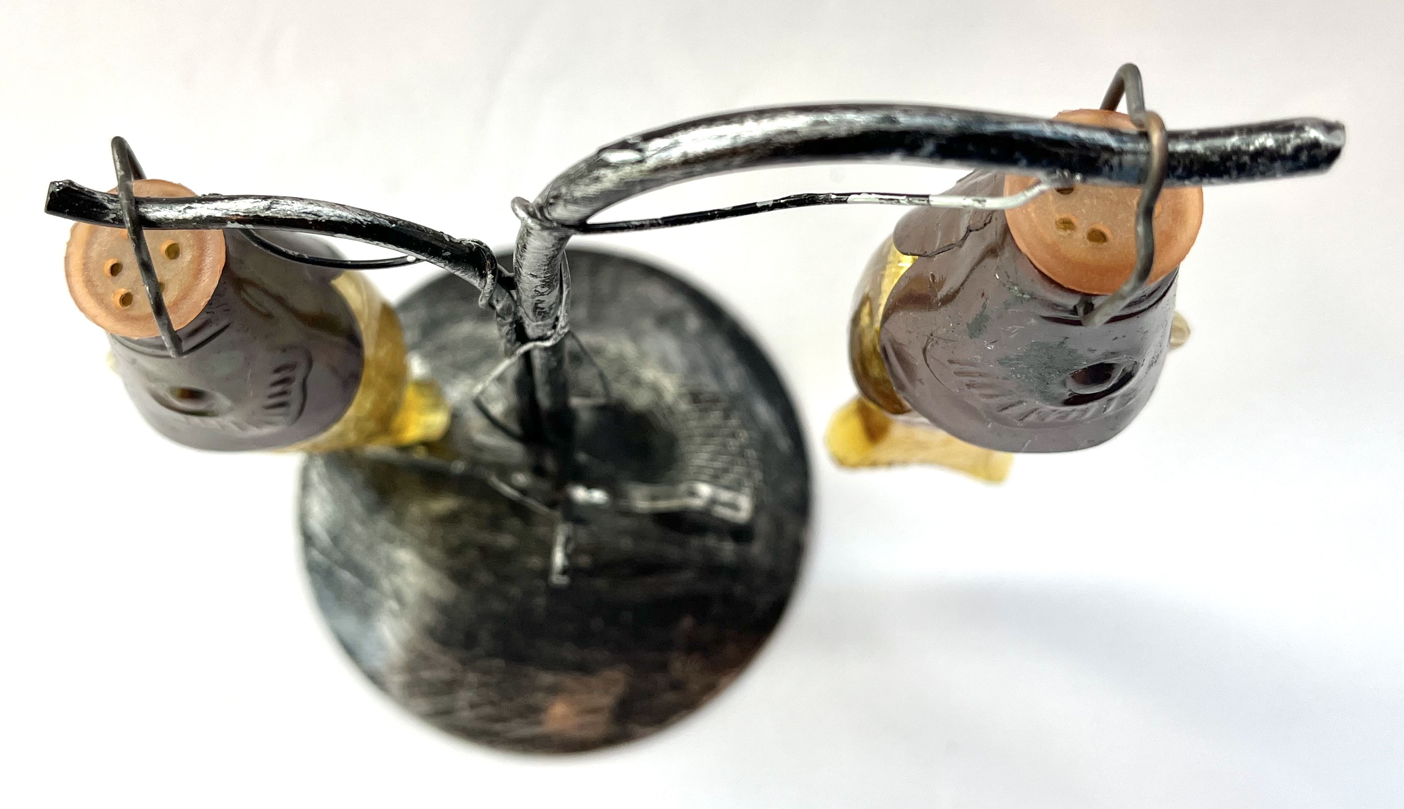 • Materials: Amber glass, metal (black painted), copper (for heads)