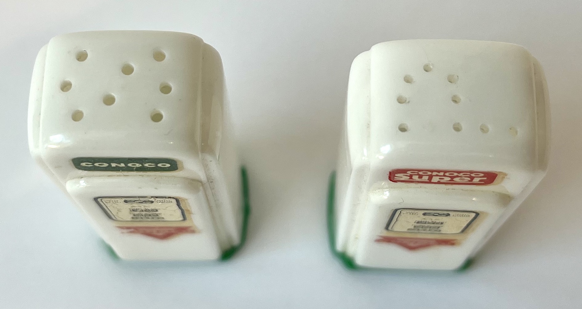 These nostalgic salt and pepper shakers remind us of a time when gas cost 25 cents a gallon and times seemed simpler. They have never been used. You do see a bit of crackling on the signs and the C from Conoco on the salt shaker gas pump sign. The bottoms pop off to add the salt or pepper and the spices pour through the top openings of the S and the P.