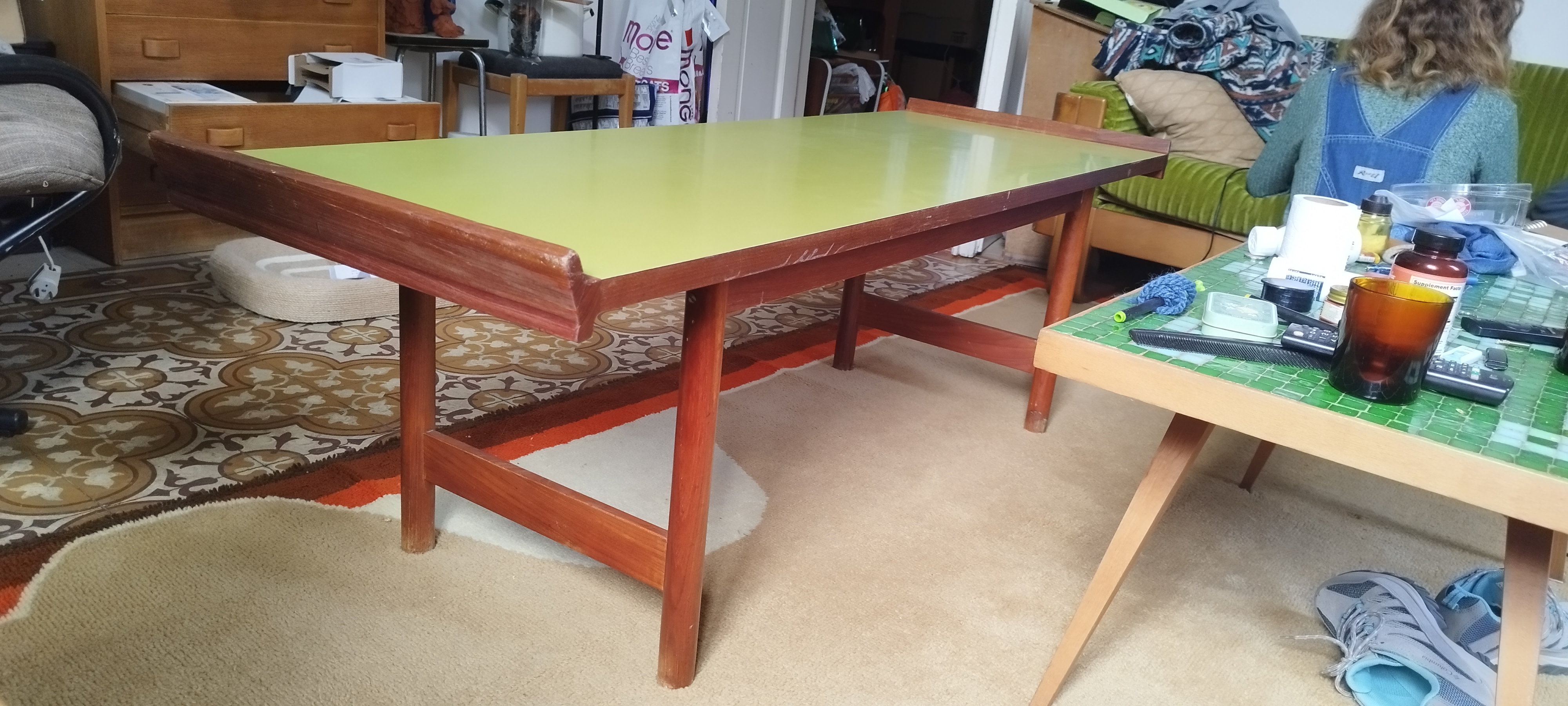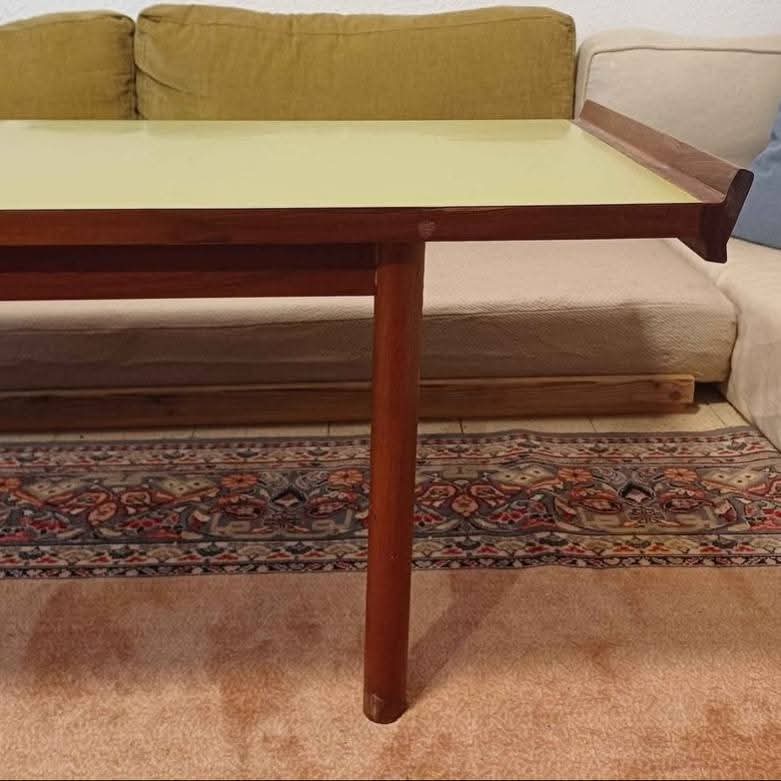 Vintage MCM Laminate Table. Dating to c. 1950-1970. Materials: Laminate top, wooden frame. Estimated value: $150 – $375. Condition: Very Good. Moderate demand; prices are rising for unique MCM pieces.