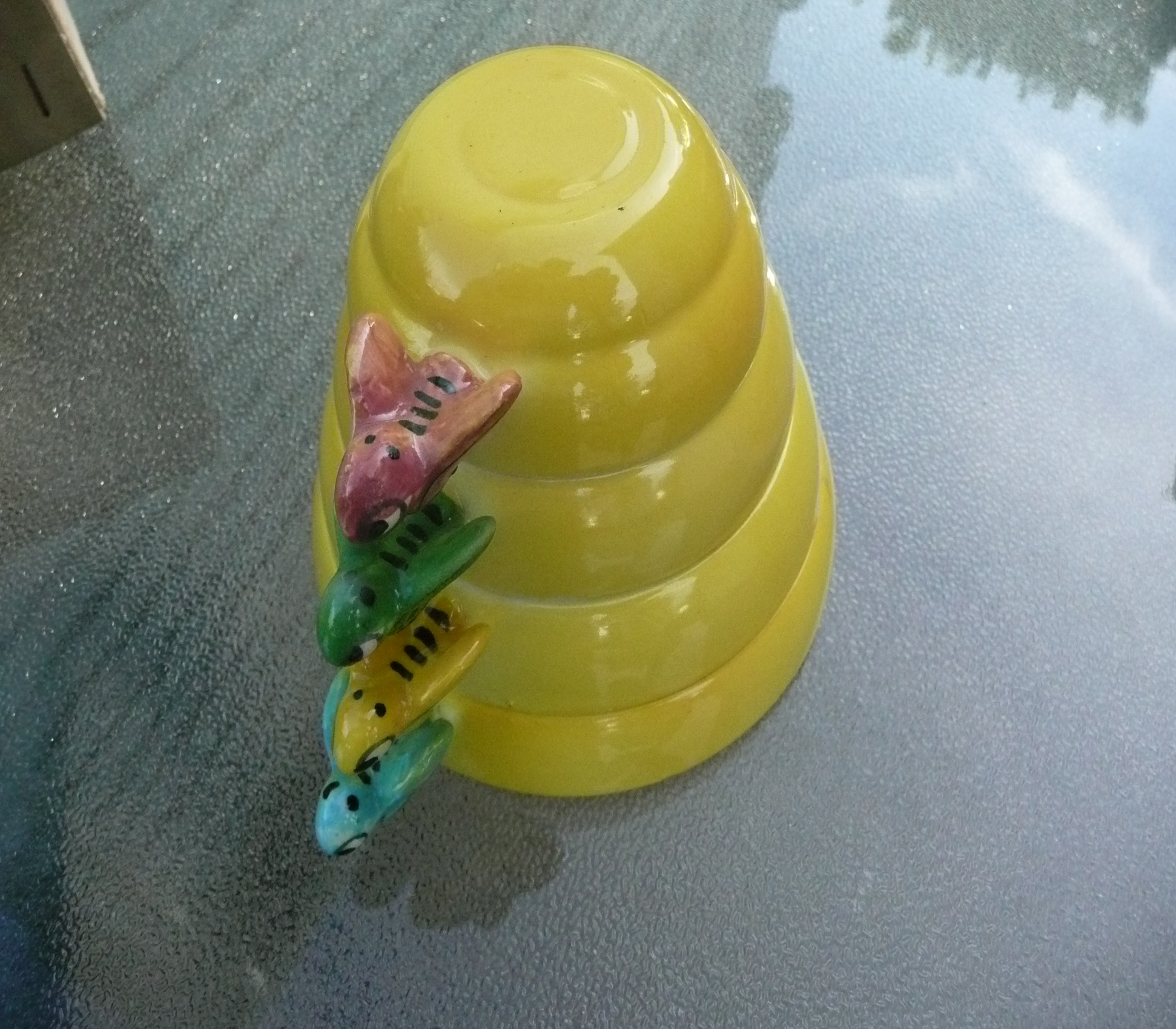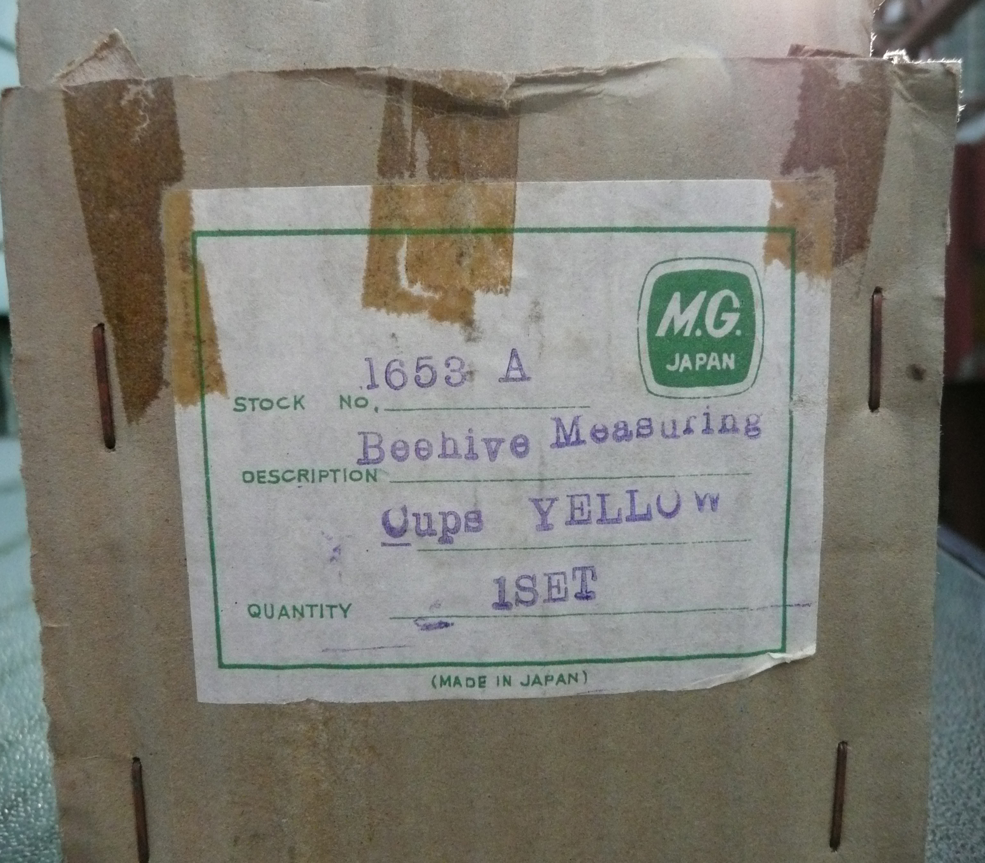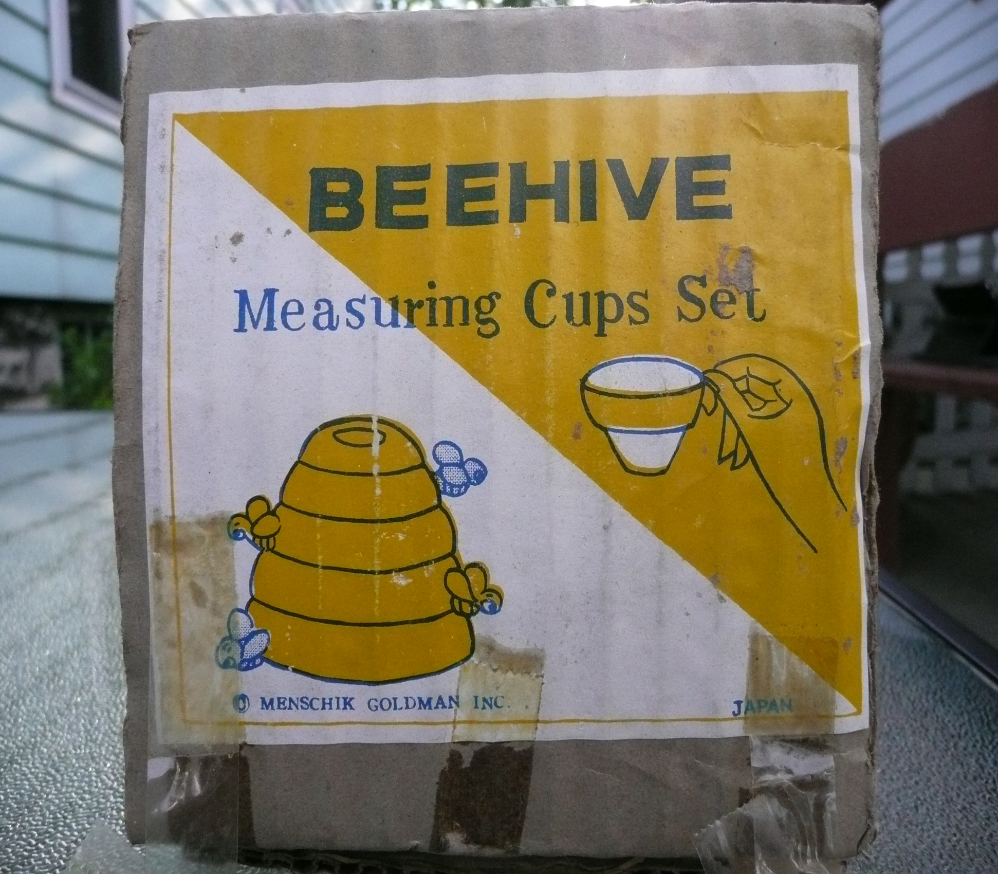 Stacking beehive sections stamped "Menschik-Goldman, Inc." and labeled on the inside with their appropriate measuring size.  The original foil sticker is attached to the bottom of the 1/2 cup measuring cup.  Never used and in the original box.  No cracks or chips.  Does anyone know the history of this piece and the value?