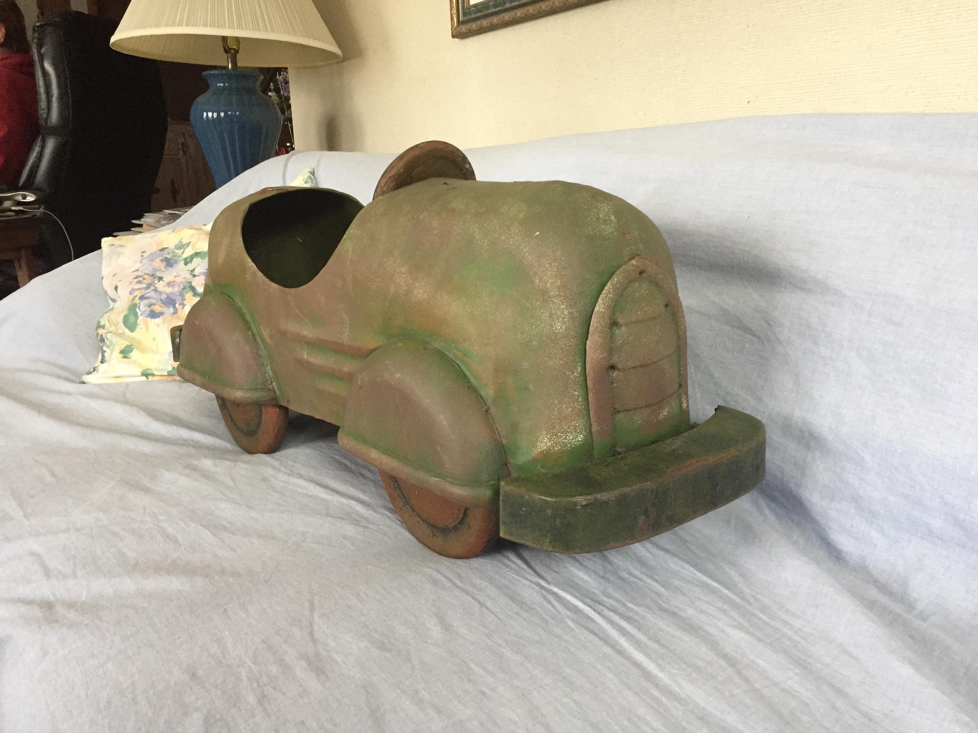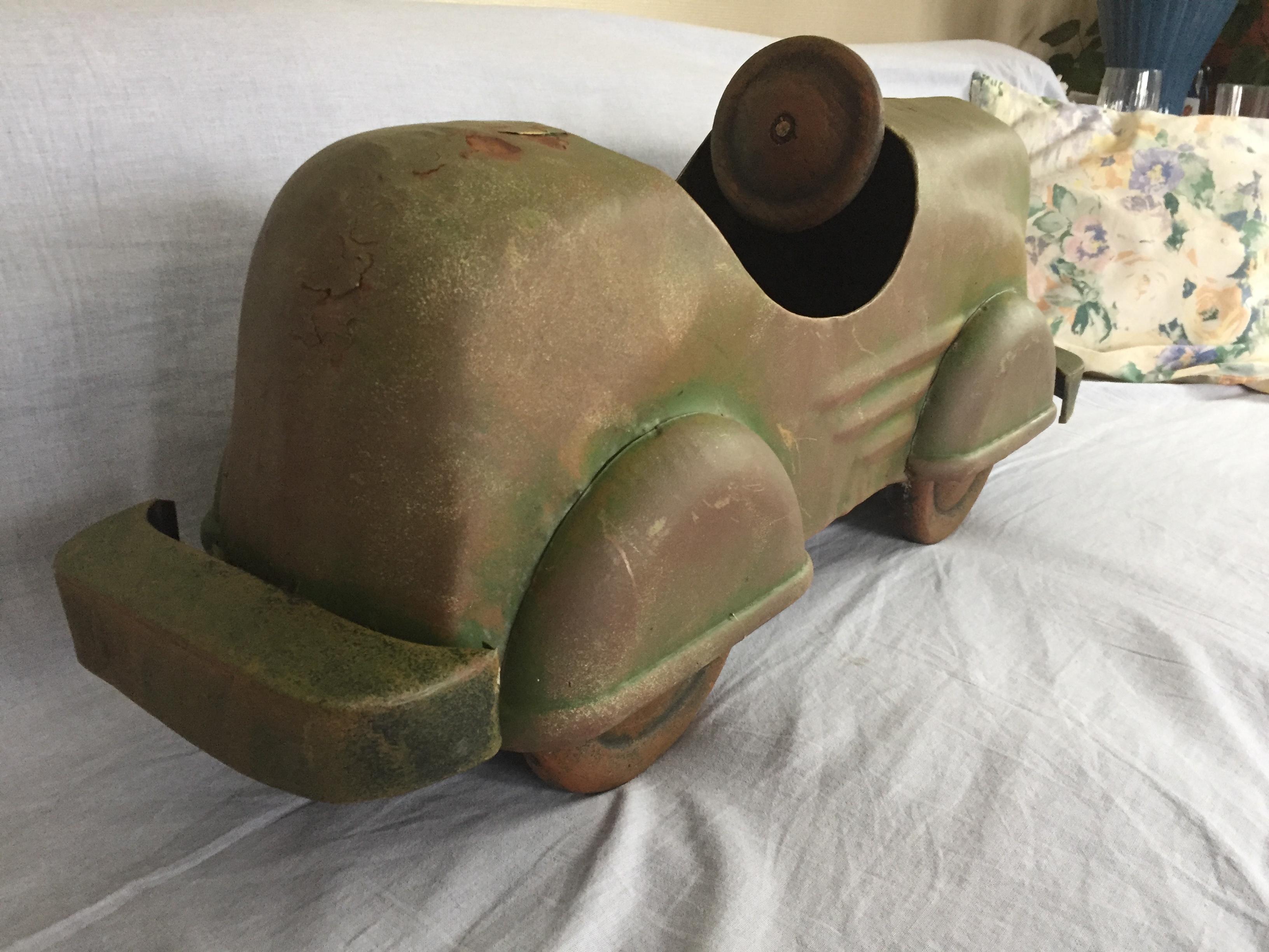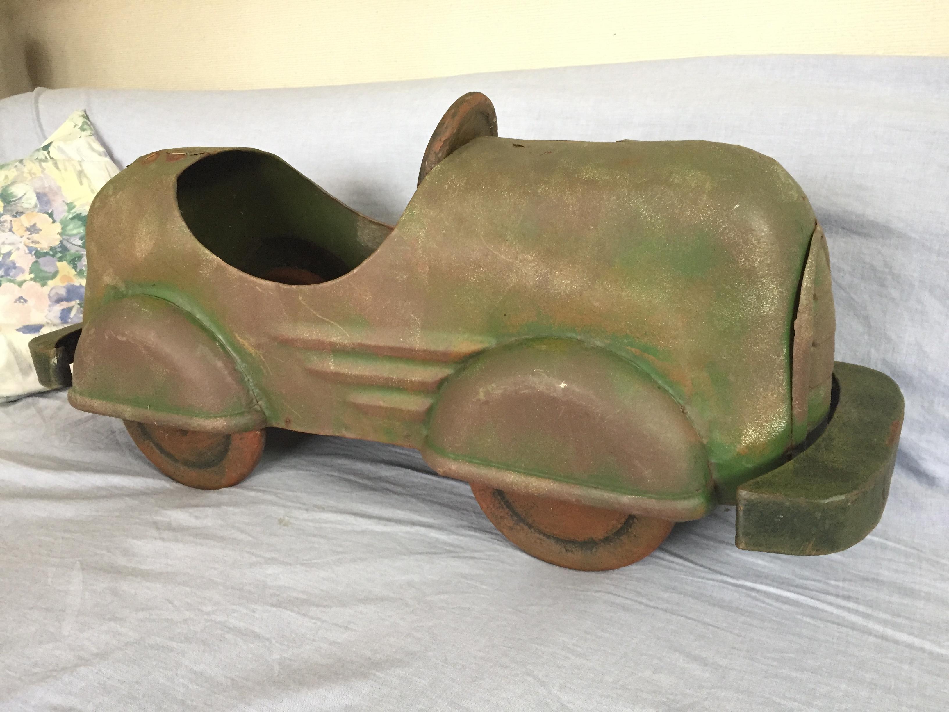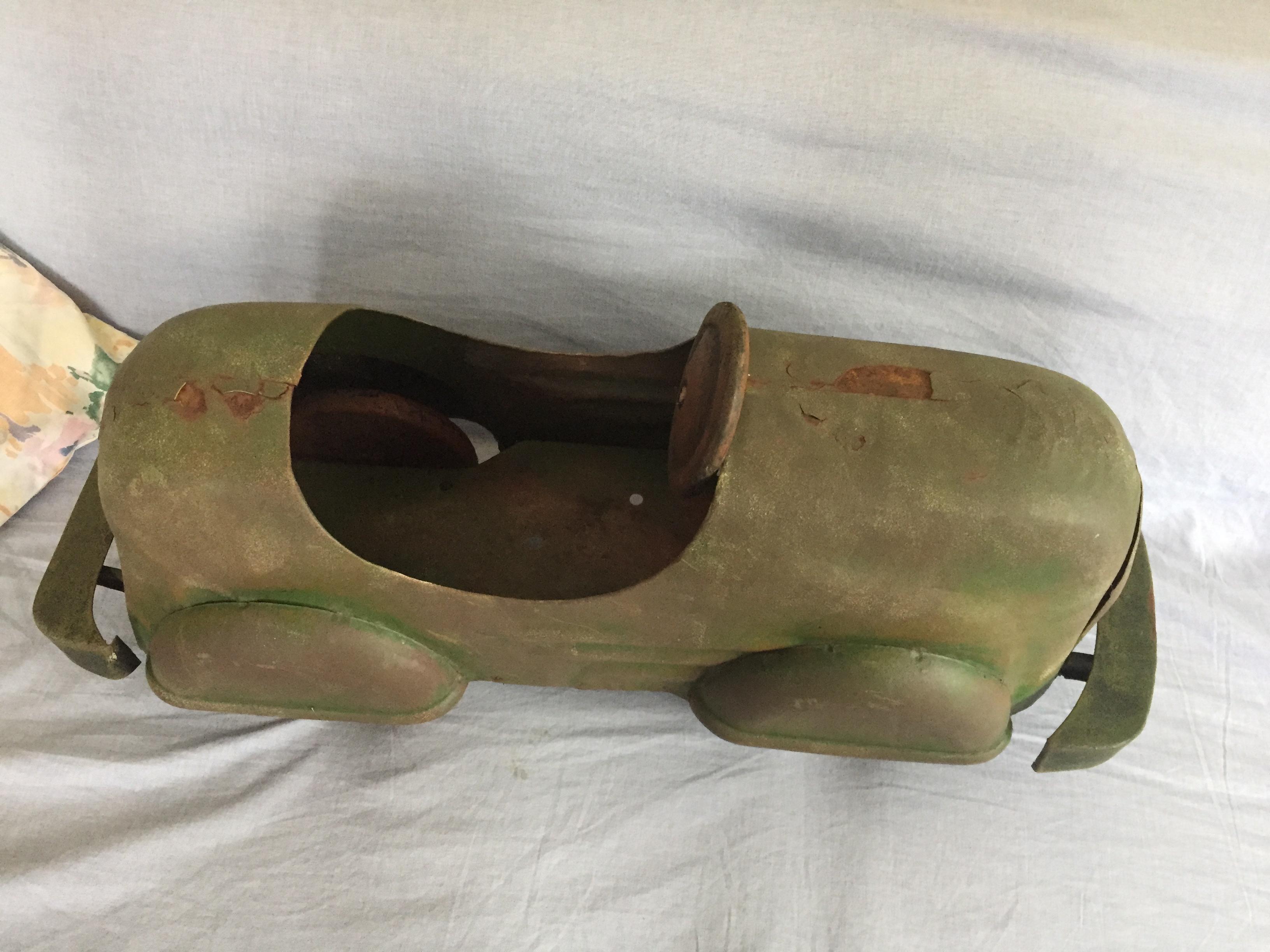 This is an old metal car/toy that is NOT a pedal car.  It is 31" by 12" by 15"H.  See photos.